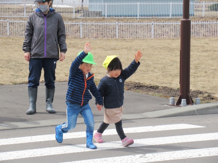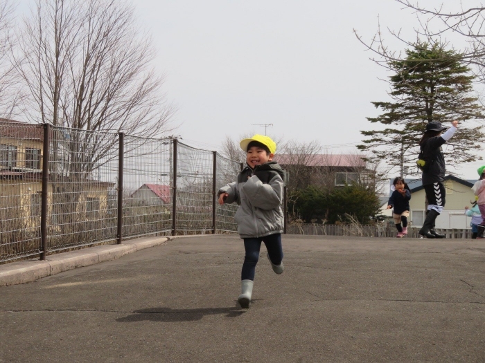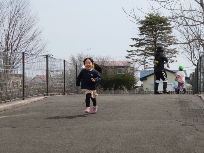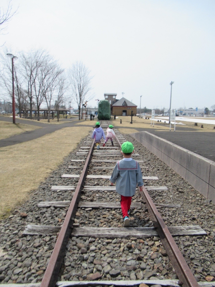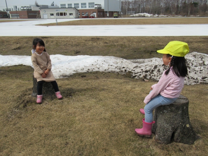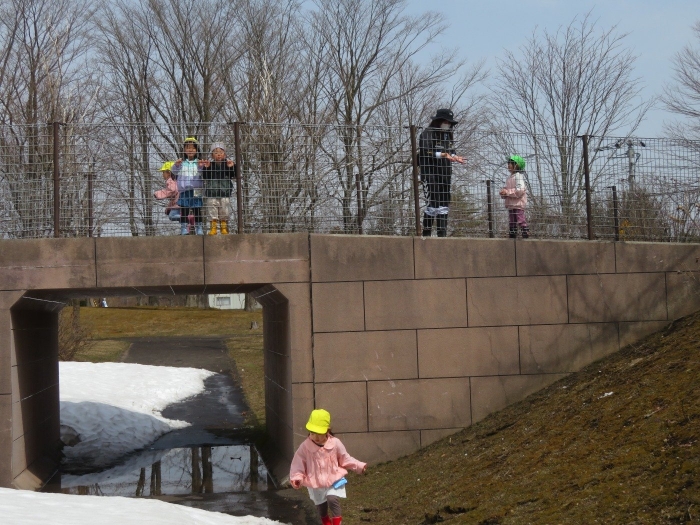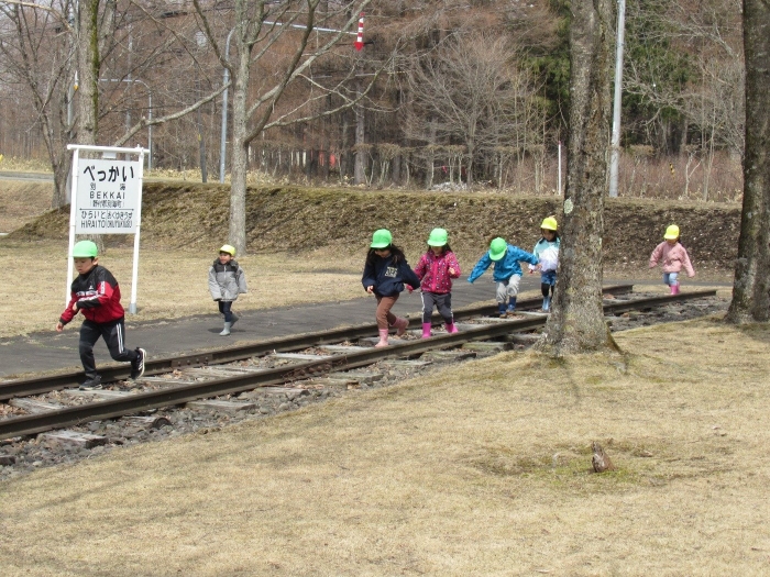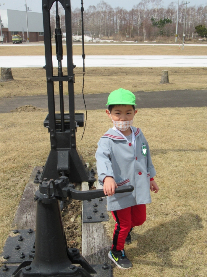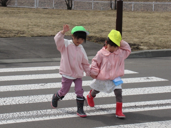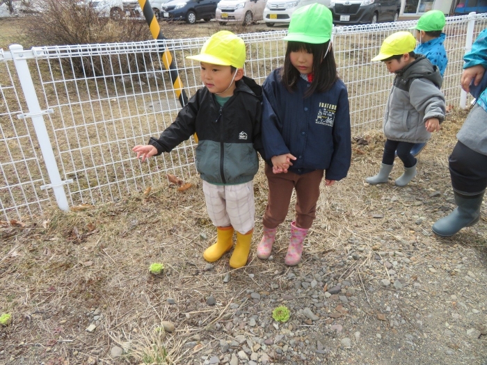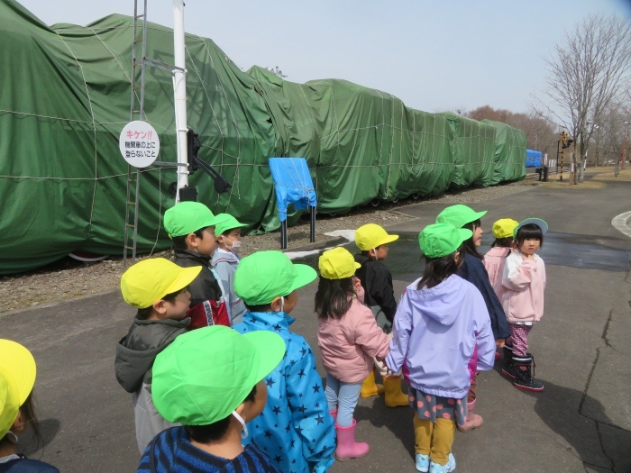 朝の会後、つくし組、たけのこ組は、鉄道公園までお散歩に行きました。進級して初めてのお散歩、たけのこさんは、自分達が道路側を歩いたり、道路を歩くときはふざけないように声をかけたりする様子が見られ、お兄さんお姉さんとして頑張ってくれていたようです。つくしさんは、たけのこさんのいうことをちゃんと聞いて行動してくれていたようですよ。
