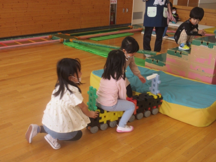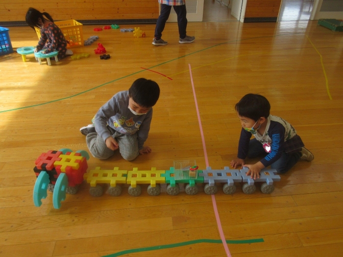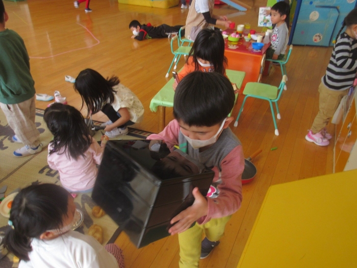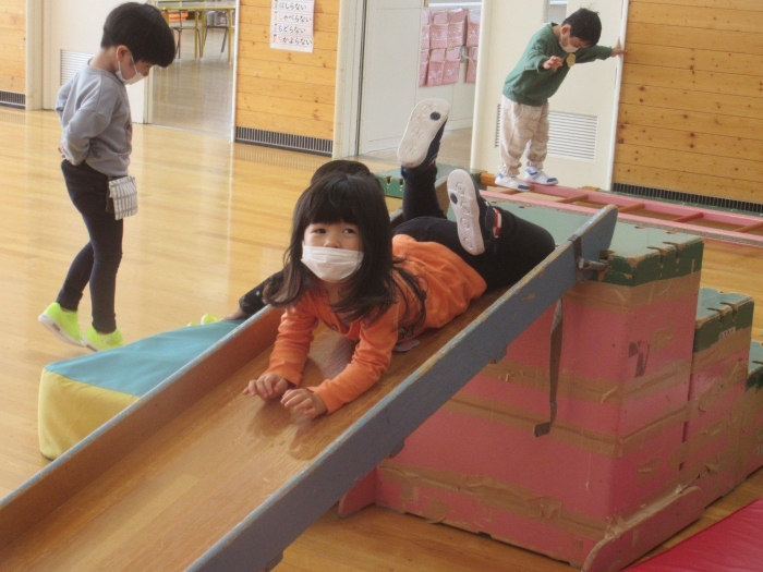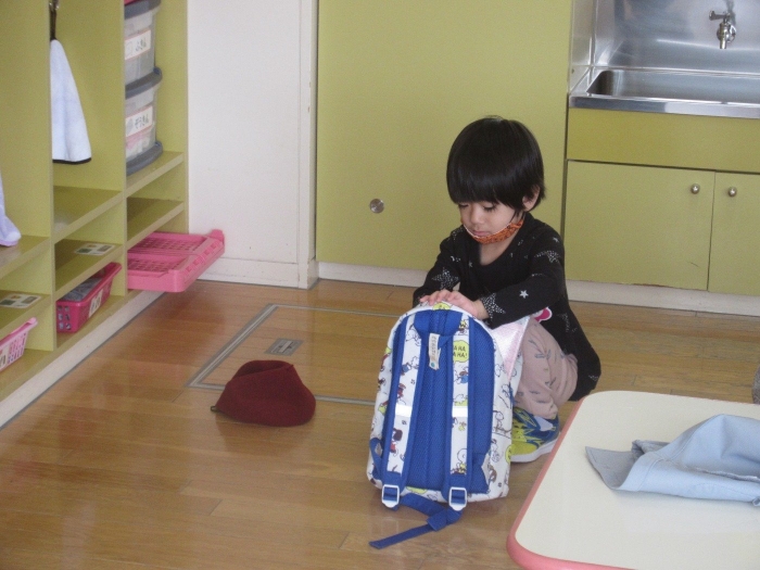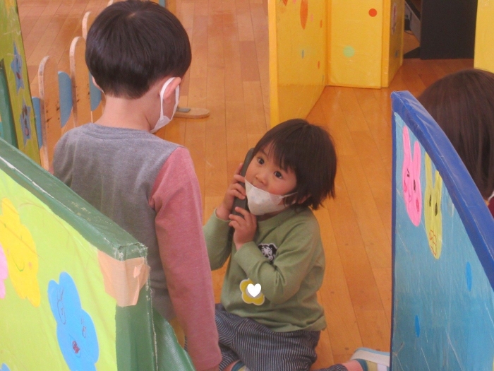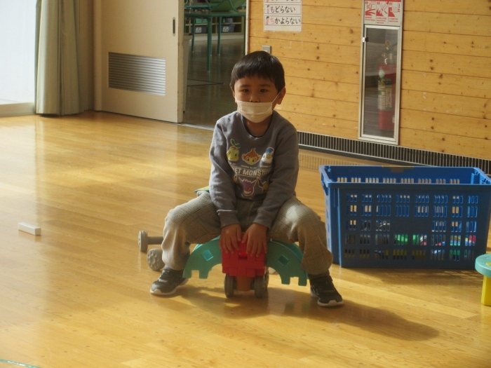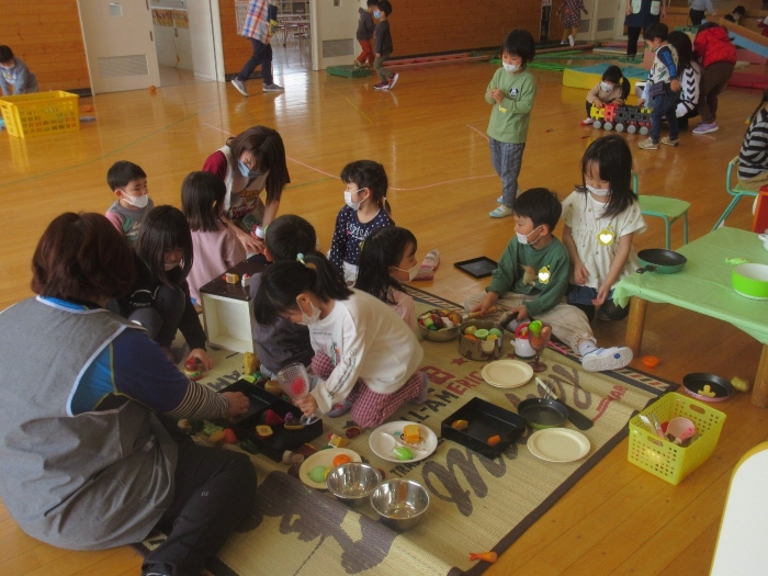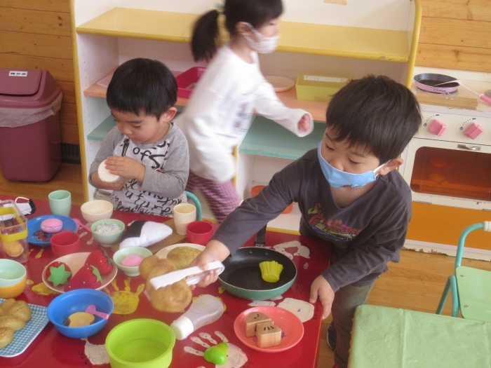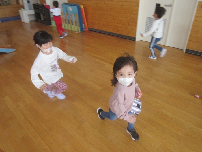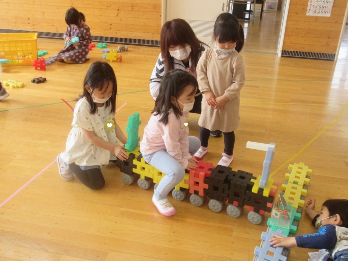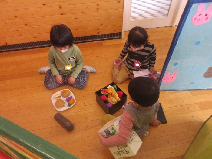 通常保育二日目。今日は、どんな姿を見せてくれるのかな…と楽しみに子供達を出迎えました。身の回りの始末を先生達と一緒に終えると、次々にプレイルームに出てきて遊び始める新入園児さん達。昨日より、笑顔で過ごす時間が増えてきましたよ。進級児さん達も、積極的に色々なお友達を誘って遊んでいますよ。