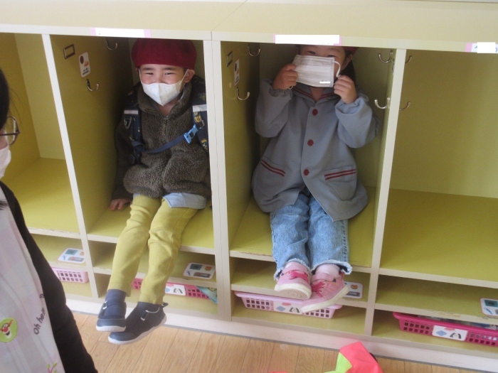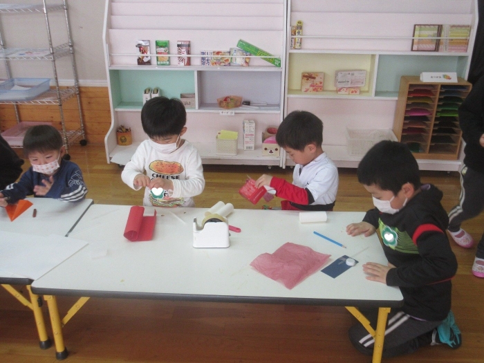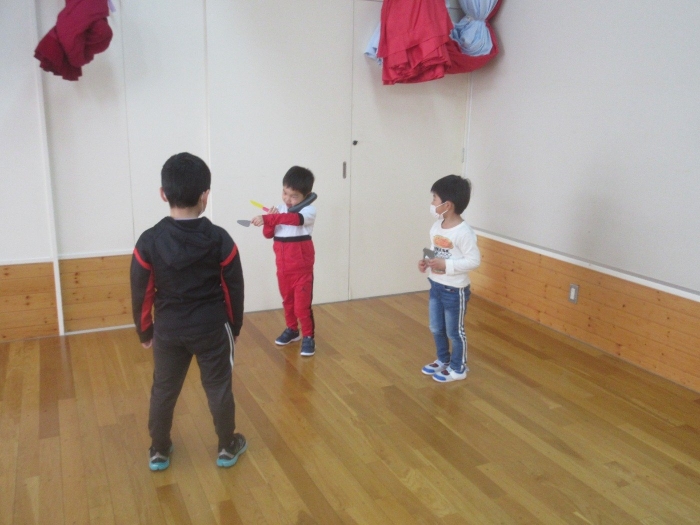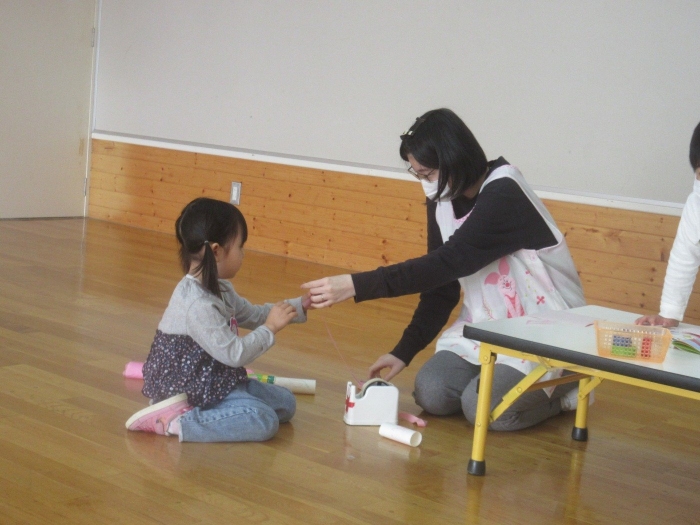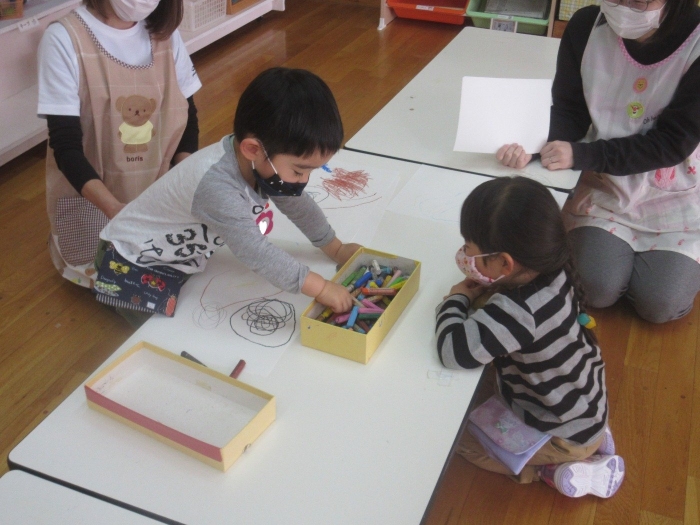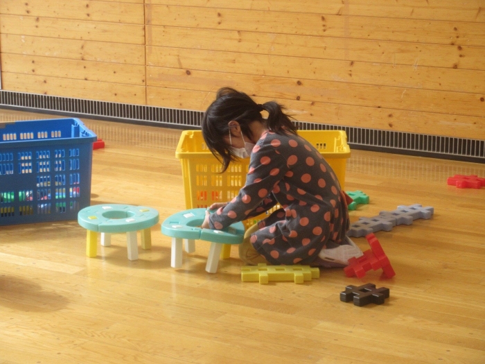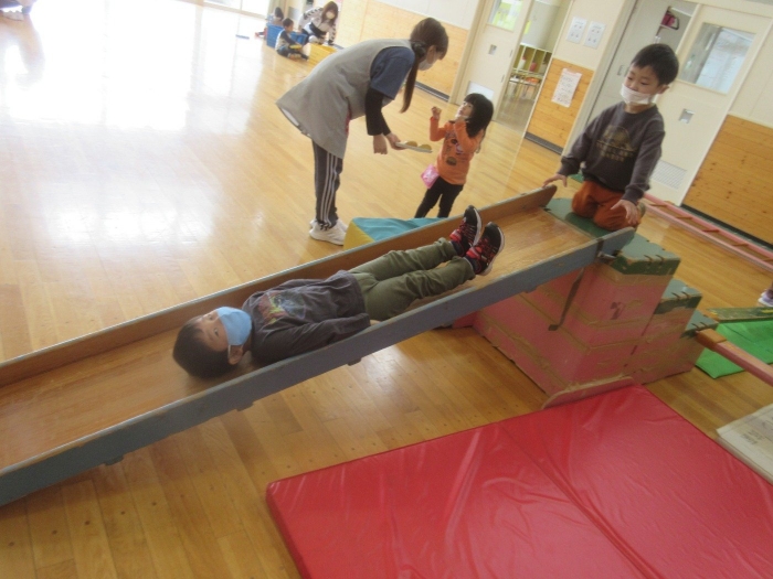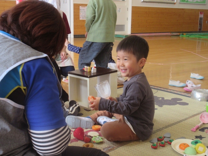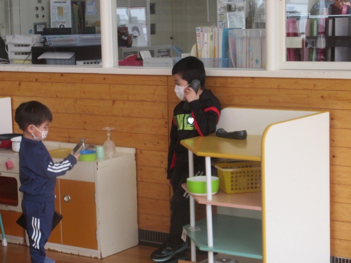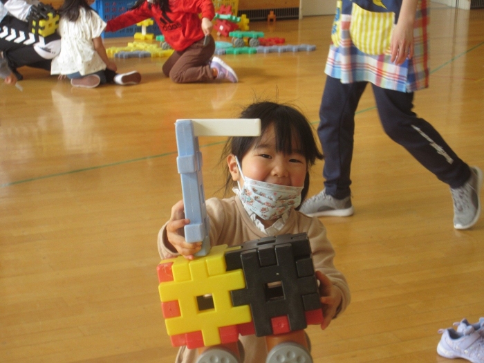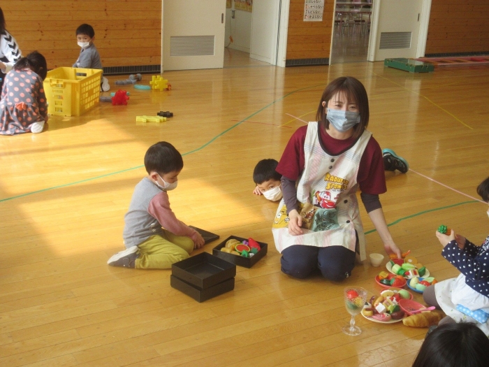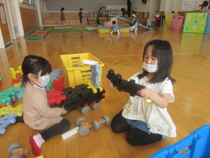 通常保育二日目。今日は、どんな姿を見せてくれるのかな…と楽しみに子供達を出迎えました。身の回りの始末を先生達と一緒に終えると、次々にプレイルームに出てきて遊び始める新入園児さん達。昨日より、笑顔で過ごす時間が増えてきましたよ。進級児さん達も、積極的に色々なお友達を誘って遊んでいますよ。