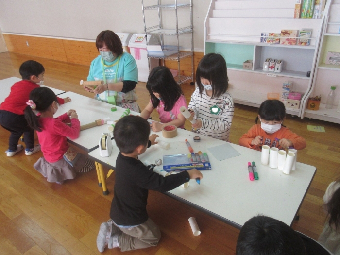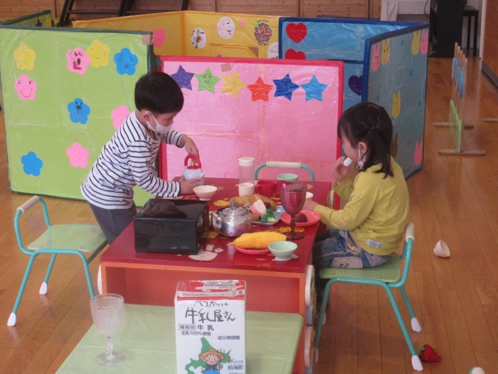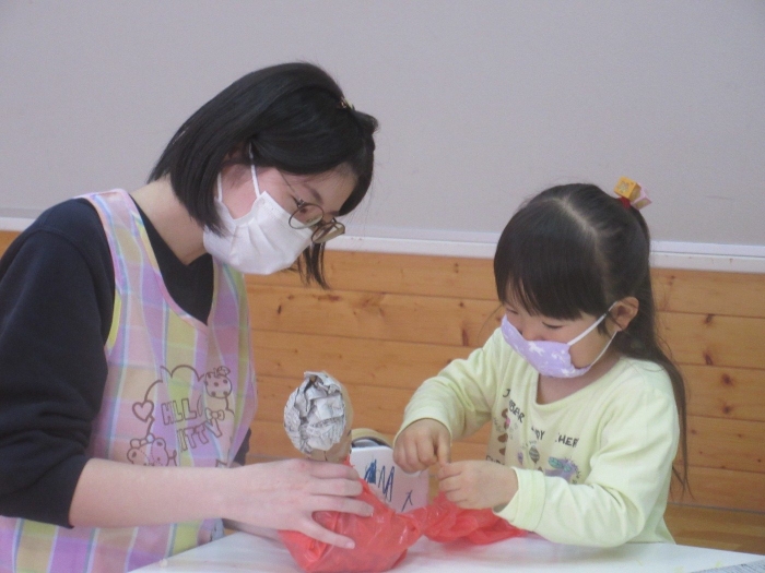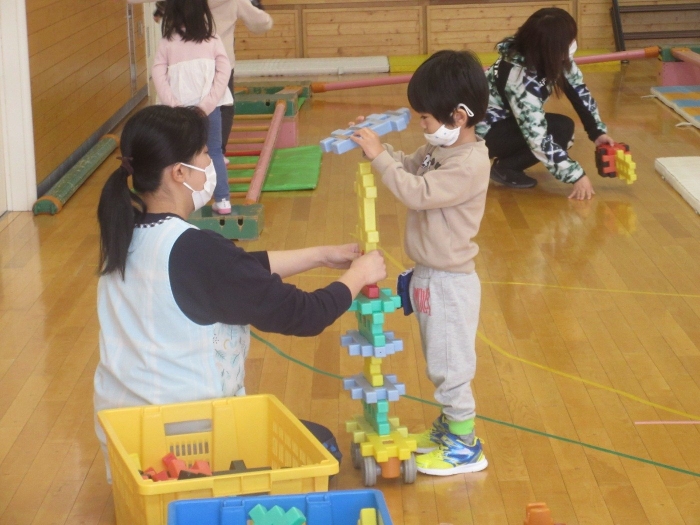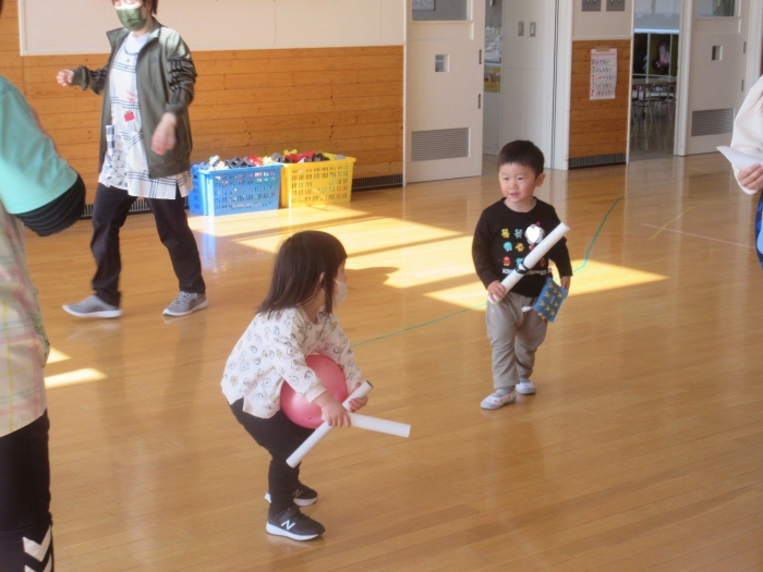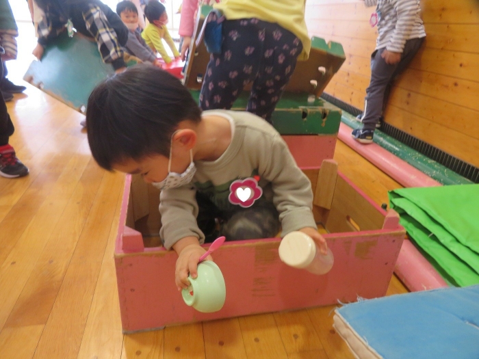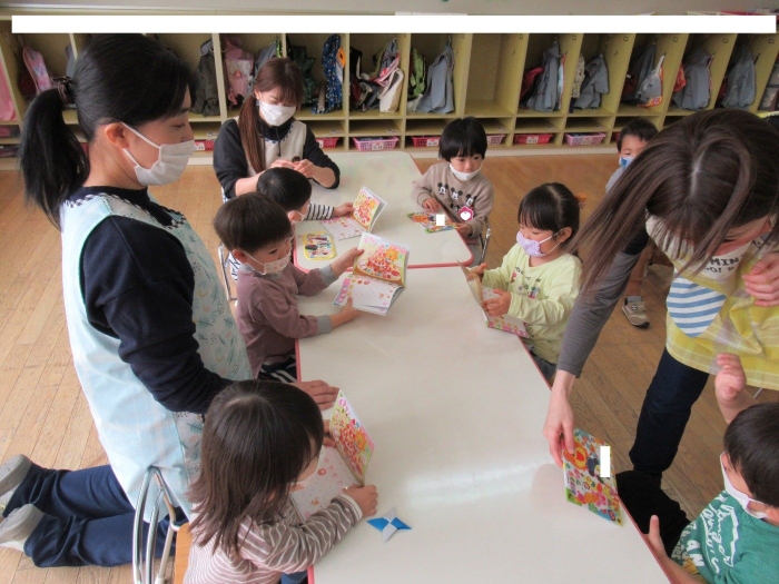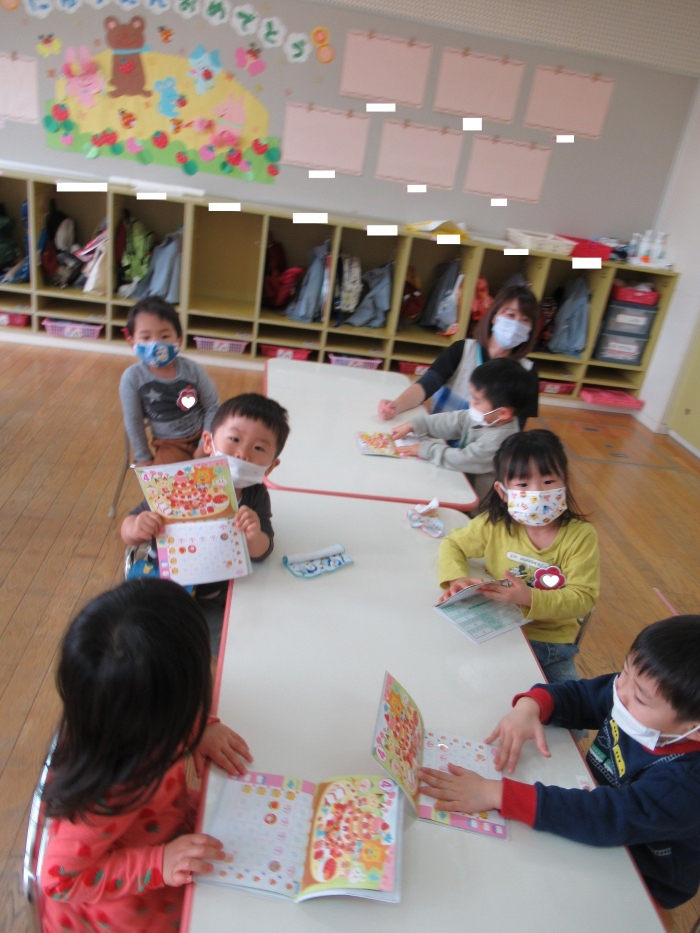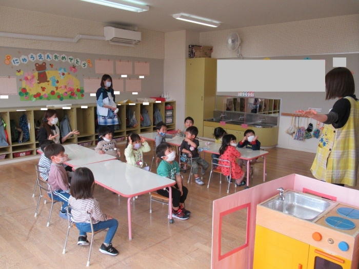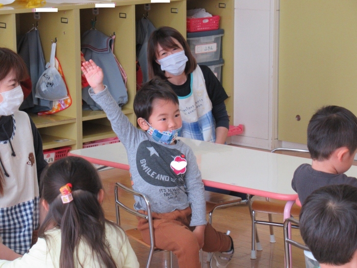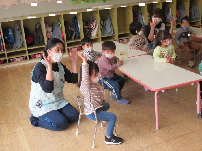 いちごさんも、一日一日園生活に慣れてきていますよ。昨日の朝の会では、みんな椅子に座り参加していました。お返事も、元気いっぱいしてくれる子が増えてきましたよ。