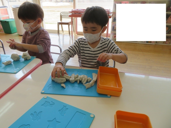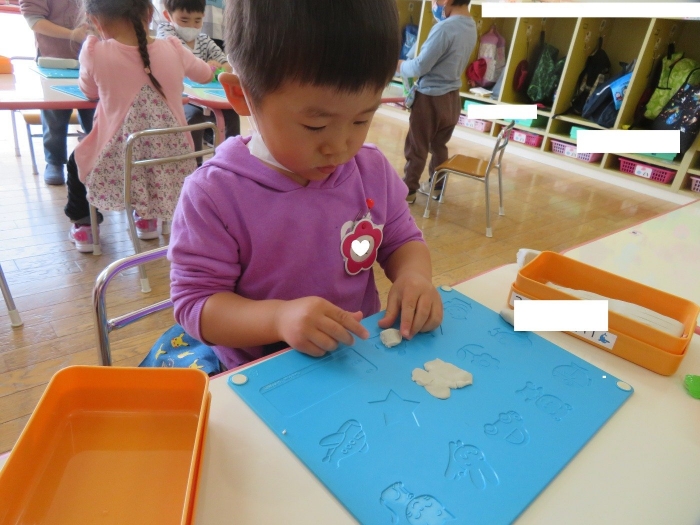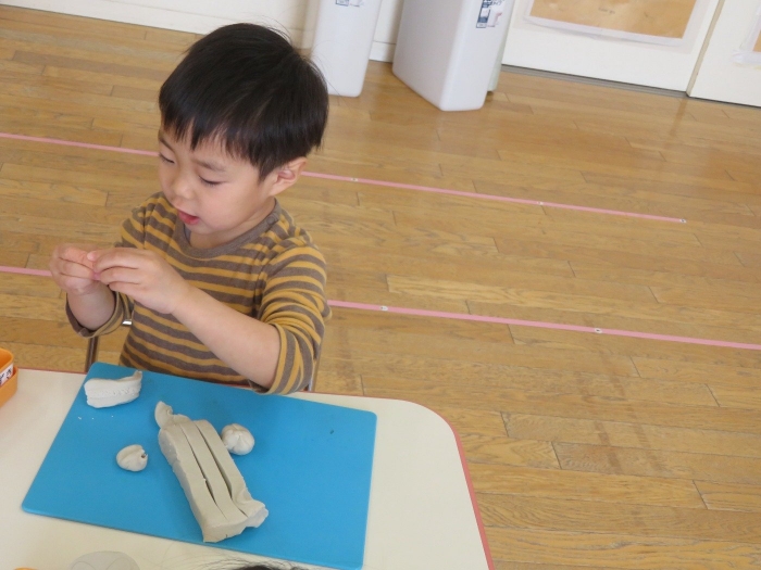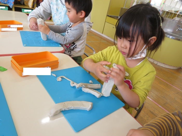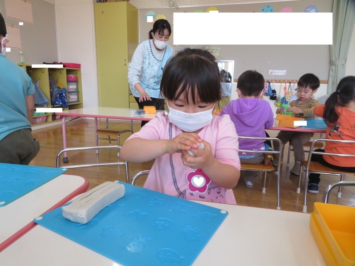 今日、いちごさんは初粘土遊び。はじめに、新しい粘土を袋から出すことから挑戦。指先を使って粘土の袋を開けることにかなり苦戦したようです。ちぎったり、丸めたり、イメージしたものを形にしたり、それぞれに感触を楽しみながら遊びました。もしかすると、口にいれてしまうお友達がいるのでは…と少し心配しましたが、そのようなこともなく安心しました。しばらく、粘土遊びが流行しそうです。
