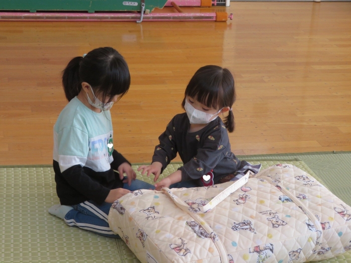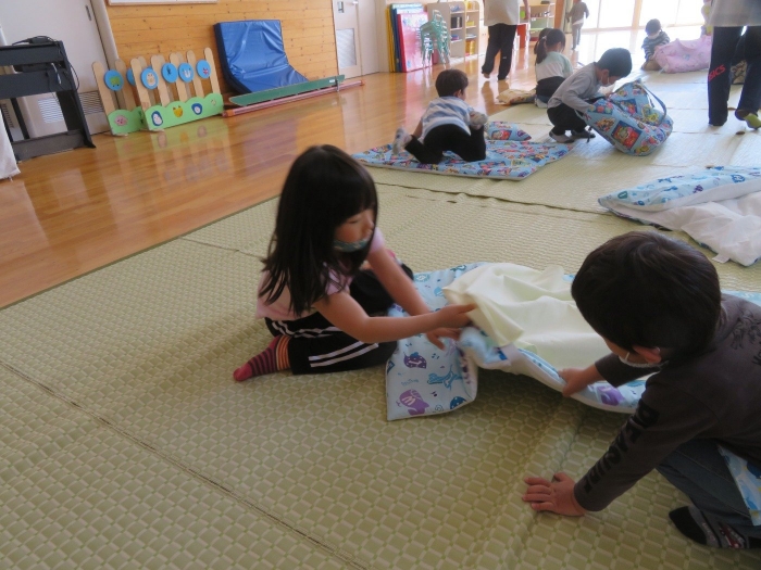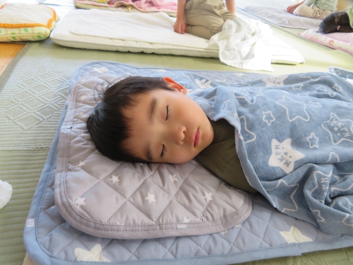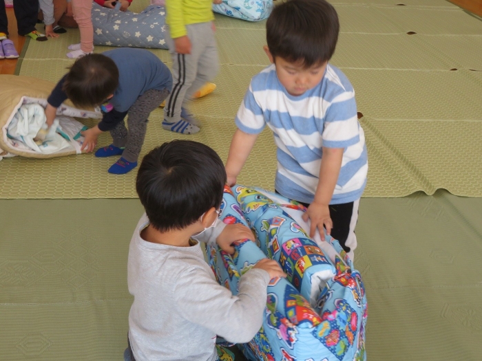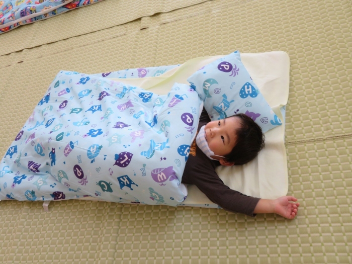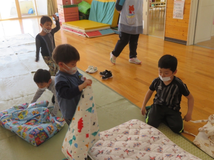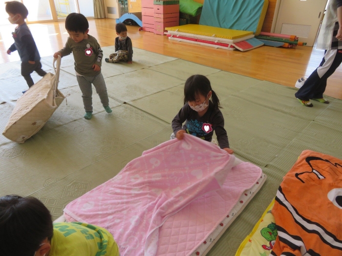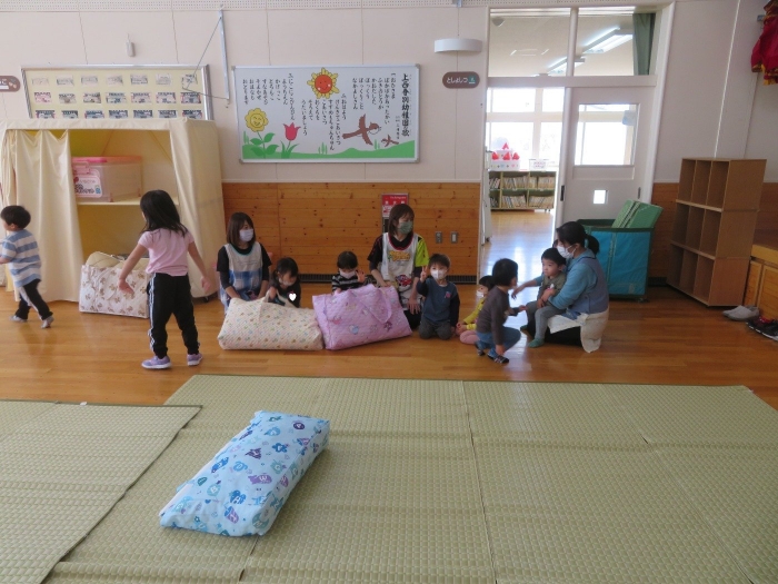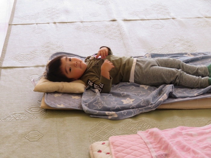 初お昼寝 2022年04月25日(月) 日々のできごと 午後2時ジャストの様子…ぐっすり眠っていました 今日から、いちごさんも通常保育、15時降園が始まりました。ドキドキの初お昼寝、どんな様子だったのでしょう。写真と共にご覧ください。 たけのこさんが ゴザを敷いてくれます それまで待っていよう 布団袋から布団を出そう たけのこさんが 手伝ってくれていました 兄弟で 教え合いながら 自分でできる所は やってみよう! できるよ!ほら たけのこさんが見守ってくれています ちょっと寝てみよ~っと 僕も! なんだか眠くなってきた… そして、給食後、いよいよお昼寝時間… 初日から みんな眠れたようです どんな夢を 見ているのでしょうね スヤスヤ… 先生方も 不安になる子がいなく 一安心しました