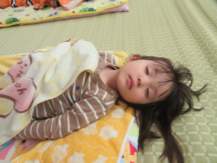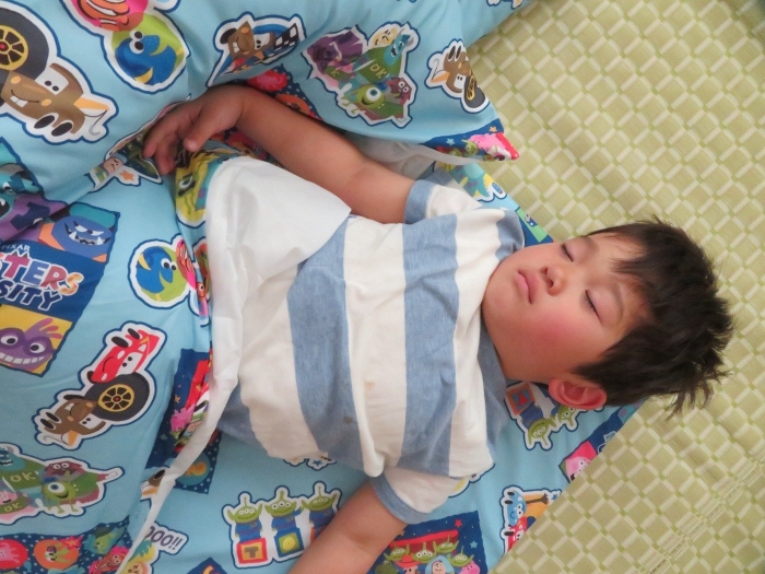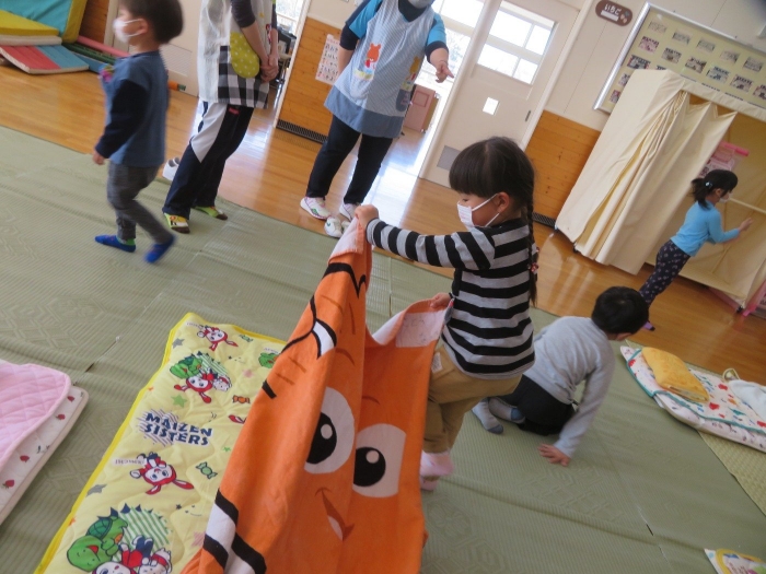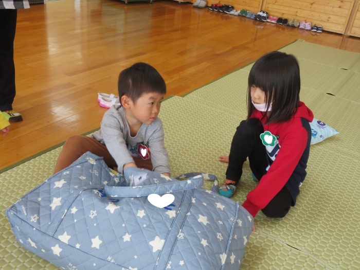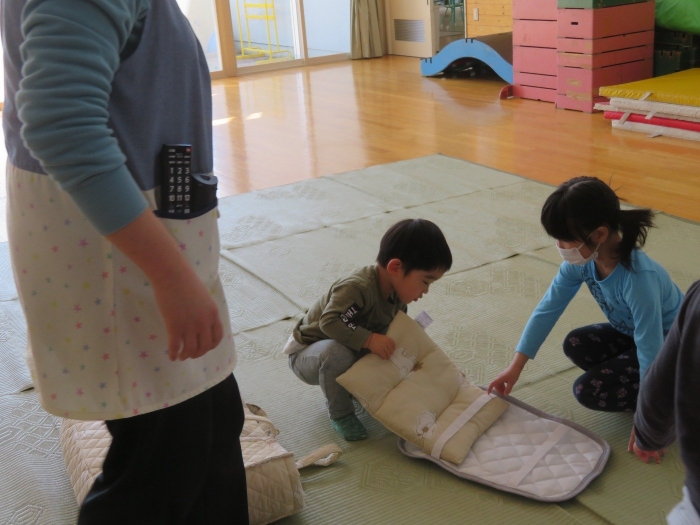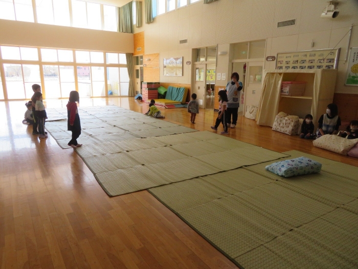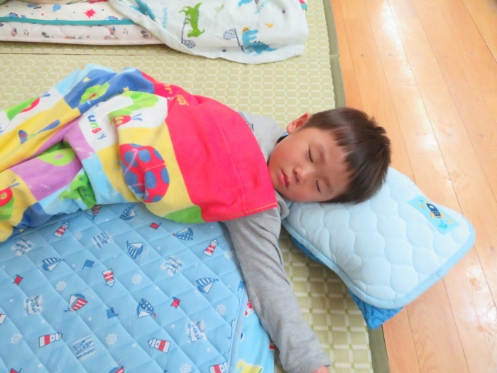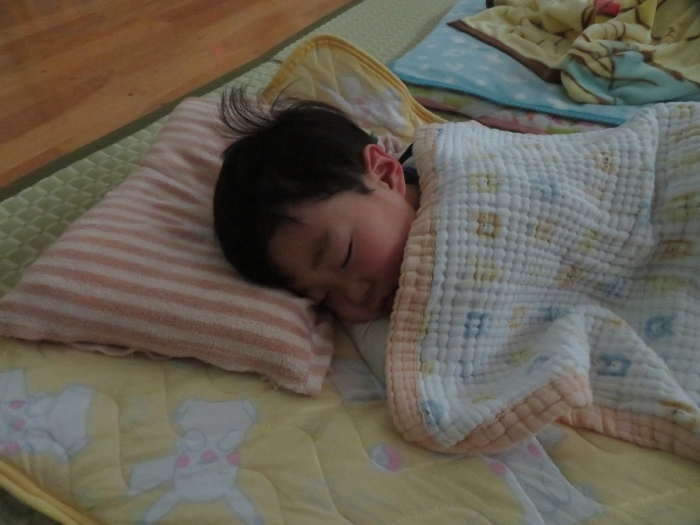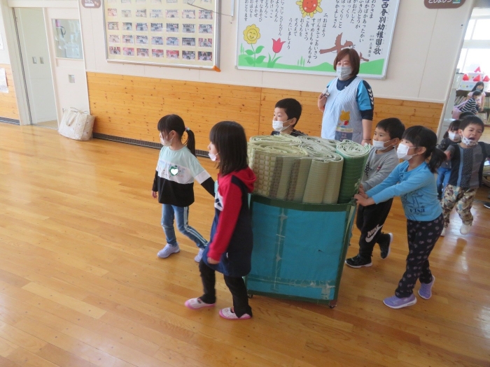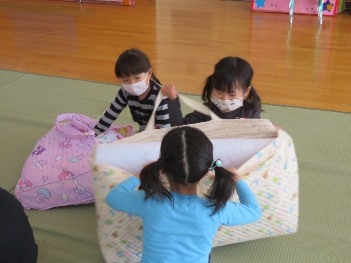 初お昼寝 2022年04月25日(月) 日々のできごと 午後2時ジャストの様子…ぐっすり眠っていました 今日から、いちごさんも通常保育、15時降園が始まりました。ドキドキの初お昼寝、どんな様子だったのでしょう。写真と共にご覧ください。 たけのこさんが ゴザを敷いてくれます それまで待っていよう 布団袋から布団を出そう たけのこさんが 手伝ってくれていました 兄弟で 教え合いながら 自分でできる所は やってみよう! できるよ!ほら たけのこさんが見守ってくれています ちょっと寝てみよ~っと 僕も! なんだか眠くなってきた… そして、給食後、いよいよお昼寝時間… 初日から みんな眠れたようです どんな夢を 見ているのでしょうね スヤスヤ… 先生方も 不安になる子がいなく 一安心しました