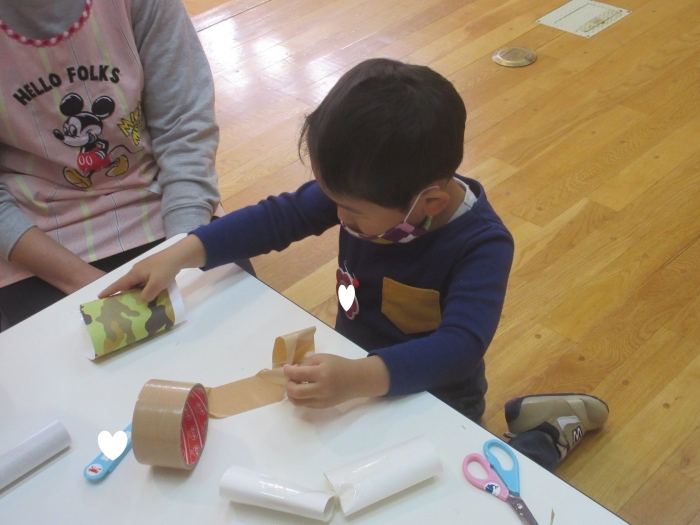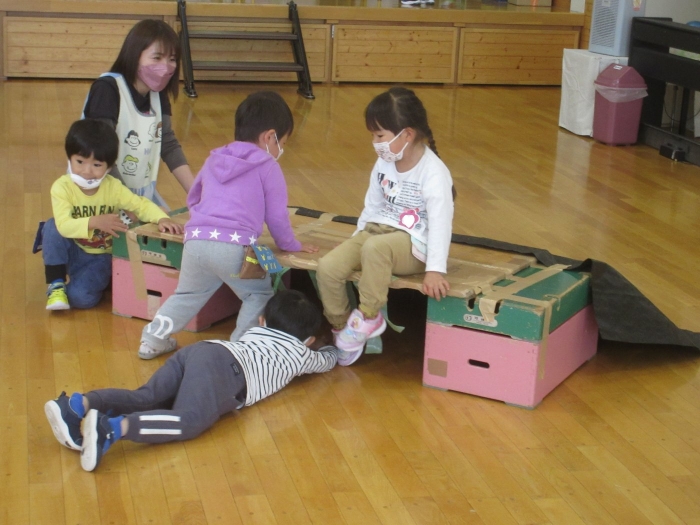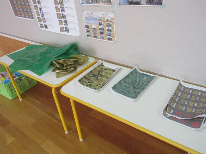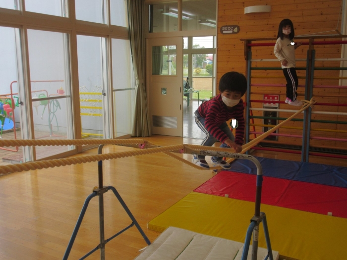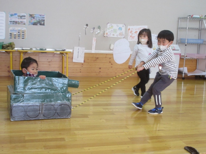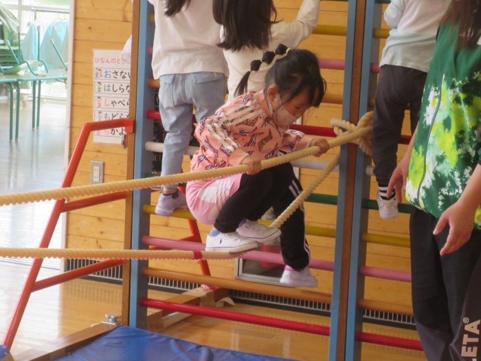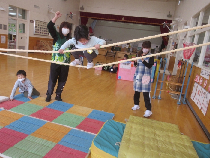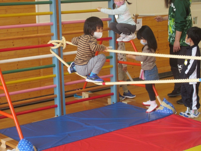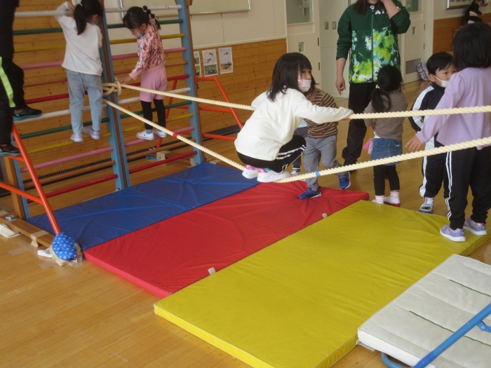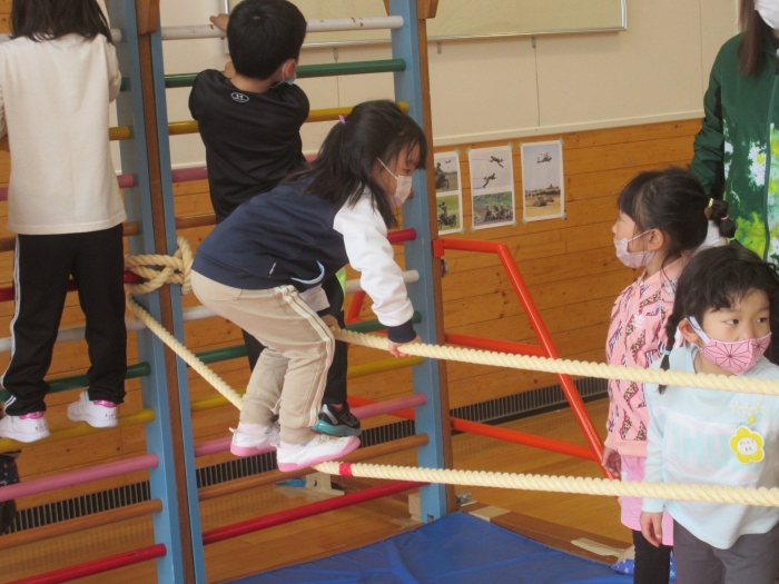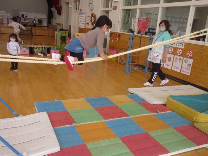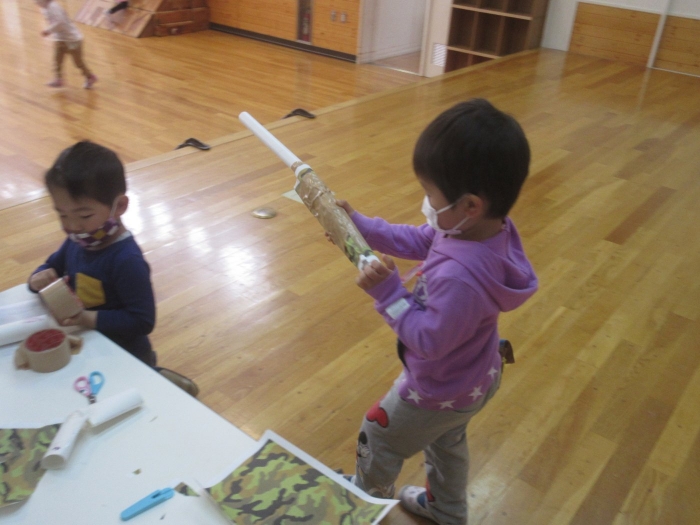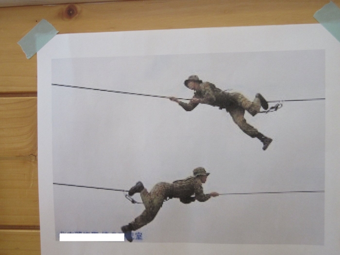 先週行った自衛隊さんとの交流後、プレイルームに掲示した写真を見て、子供達が憧れを持ったのが上記の写真。”こんな風に綱を渡ってみたい”という子供達の思いを実現しようと、昨日、子供達が帰った後、先生方が試行錯誤しながら下記のような環境を設置。登園後、早速挑戦する子供達。2本のロープを両手・両足を使い渡ります。しかし、かなりグラグラするため難しい。最初は、恐る恐る挑戦していた子ども達。それでも、何度か挑戦していくうちに、上手にバランスをとりながら前へ進めるようになってきました。諦めずに挑戦して上達することの喜びや、頑張ったらできた!という達成感が得られるといいなと思いながら、危険のないように見守っています。制作コーナーでは、自衛隊のイメージから鉄砲や武器を制作しているお友達もいました。ちょっとした環境の工夫で、イメージが膨らみ新たな遊びを楽しんでいますよ。