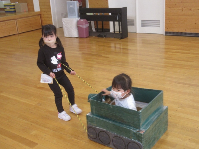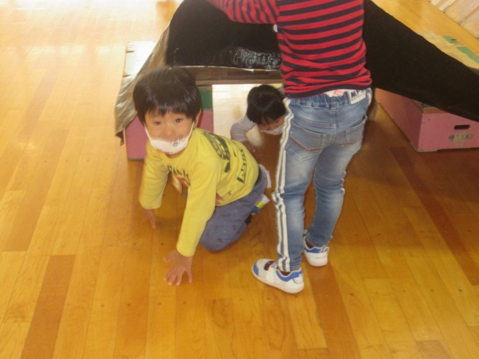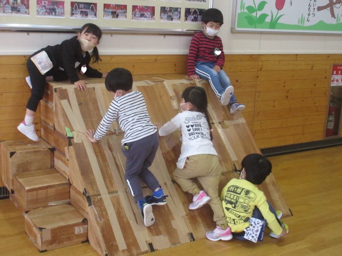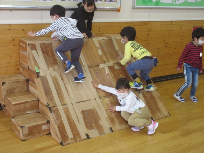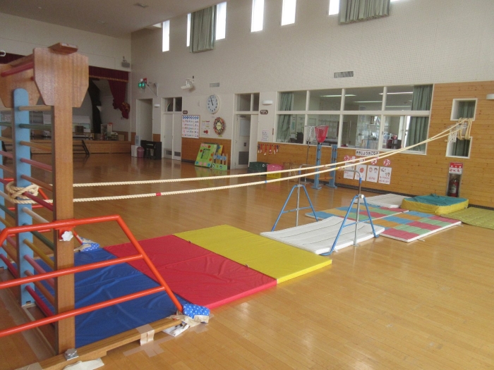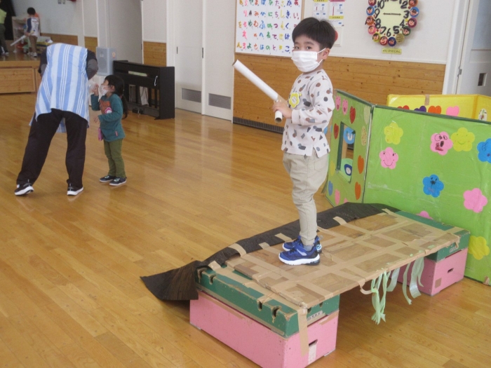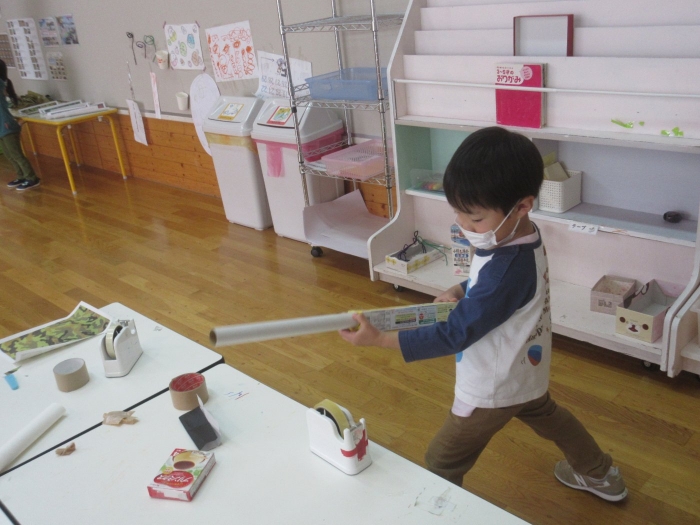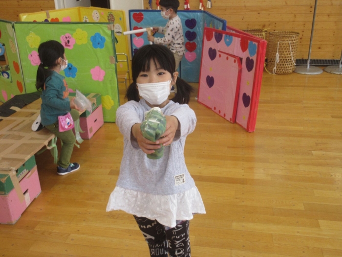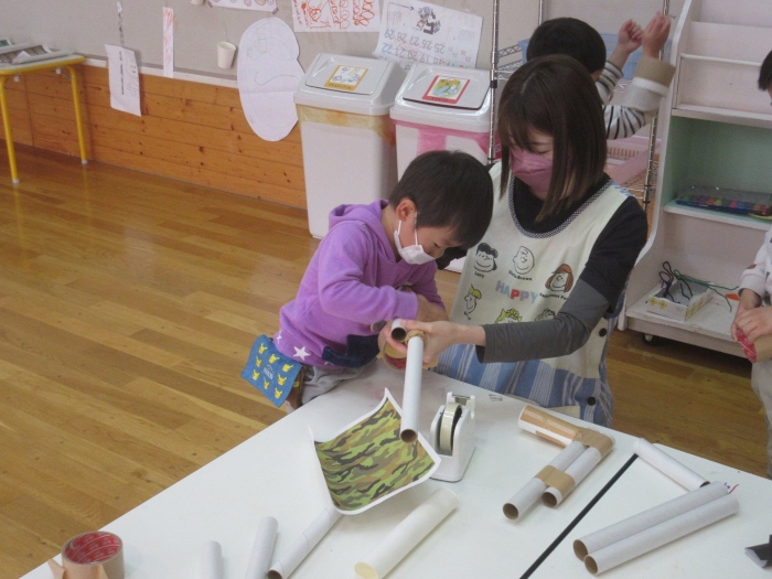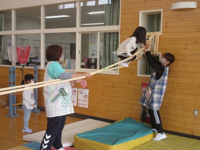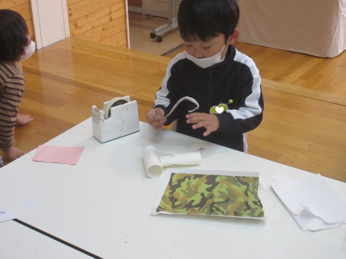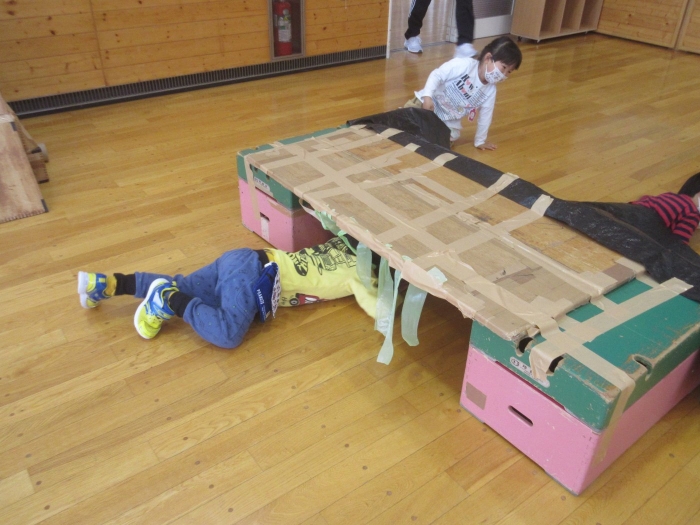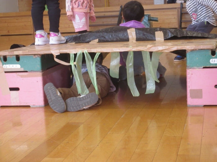 先週行った自衛隊さんとの交流後、プレイルームに掲示した写真を見て、子供達が憧れを持ったのが上記の写真。”こんな風に綱を渡ってみたい”という子供達の思いを実現しようと、昨日、子供達が帰った後、先生方が試行錯誤しながら下記のような環境を設置。登園後、早速挑戦する子供達。2本のロープを両手・両足を使い渡ります。しかし、かなりグラグラするため難しい。最初は、恐る恐る挑戦していた子ども達。それでも、何度か挑戦していくうちに、上手にバランスをとりながら前へ進めるようになってきました。諦めずに挑戦して上達することの喜びや、頑張ったらできた!という達成感が得られるといいなと思いながら、危険のないように見守っています。制作コーナーでは、自衛隊のイメージから鉄砲や武器を制作しているお友達もいました。ちょっとした環境の工夫で、イメージが膨らみ新たな遊びを楽しんでいますよ。