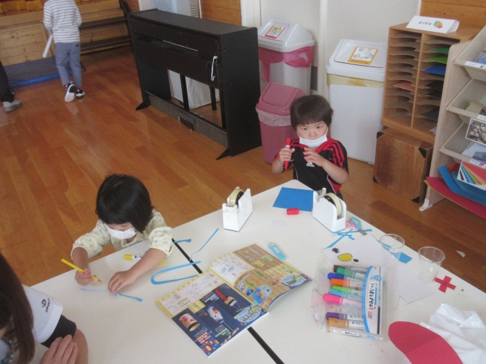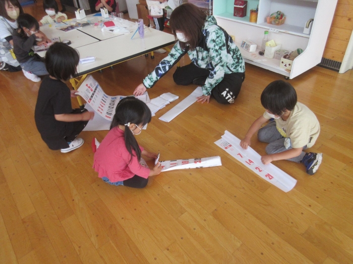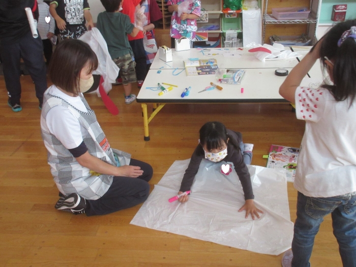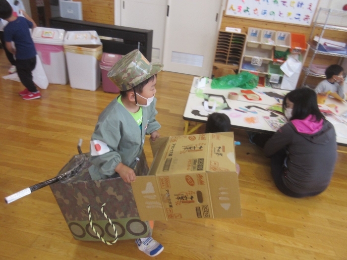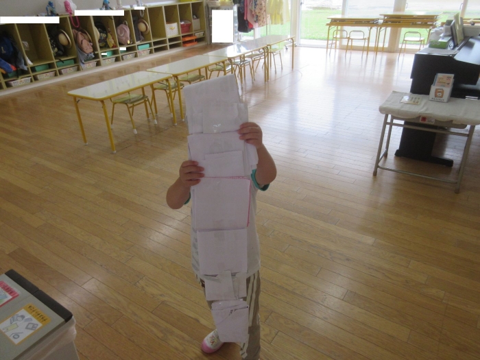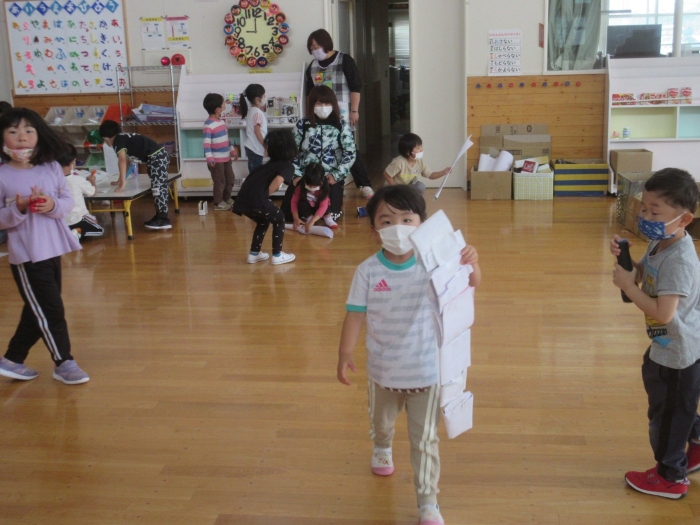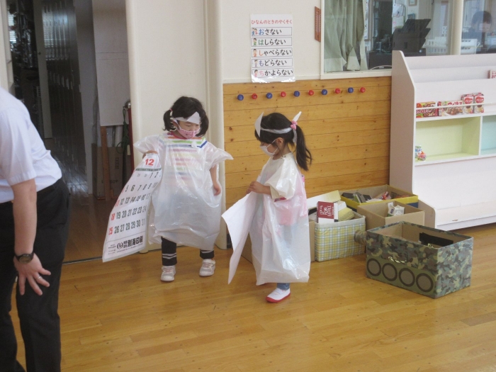 夏になると流行する遊びといえば…オバケごっこ!上西春別幼稚園でも、先週末からたけのこさんを中心に「オバケ屋敷を作ろう!」と、プレイルームのステージを利用して新たな遊びが始まりました。ポリ袋でオバケを作ったり、自分がオバケになったり、暗闇の中でお友達を驚かせたり…イメージを膨らませながら思い思いに楽しむ姿が見られています。これからどんな風に、遊びが広がっていくのか楽しみです。その他にも、運動会の余韻を楽しみながら、お友達とリレーをしたり自衛隊になりきって遊んでいる様子も見られていました。