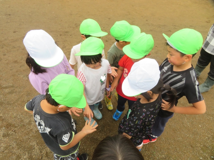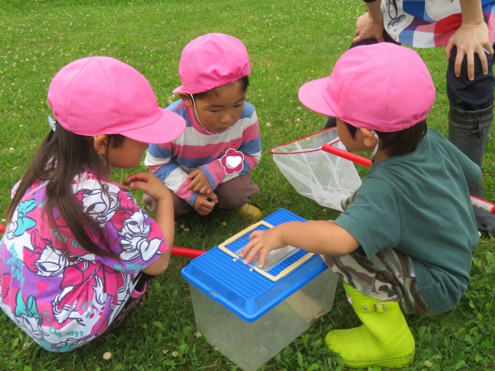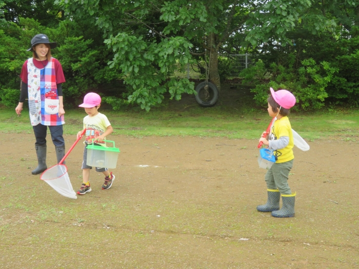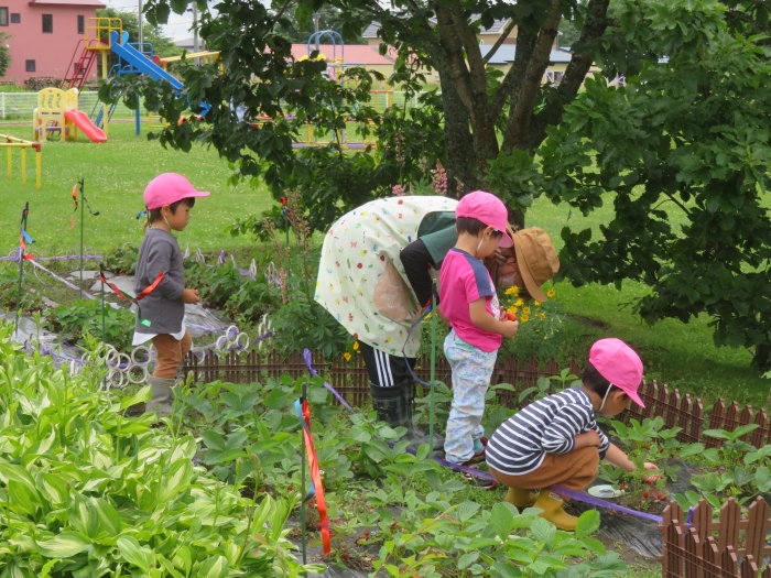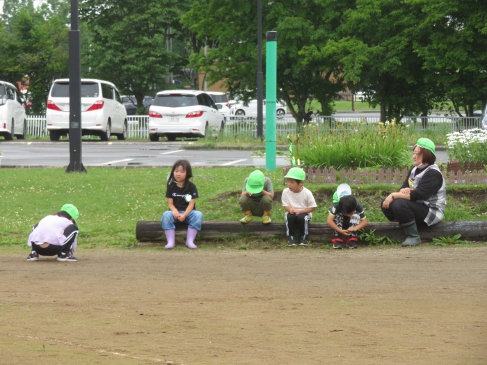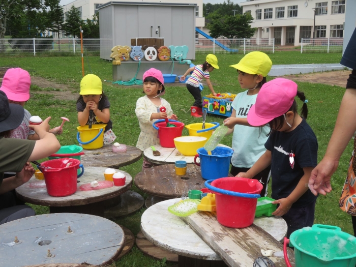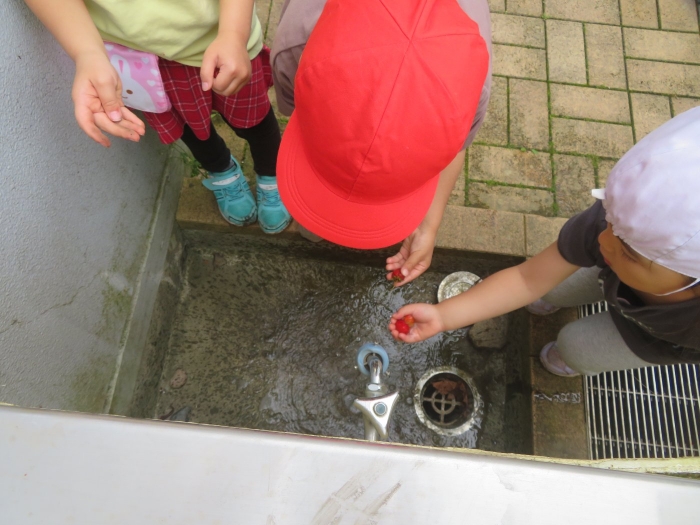 戸外では、砂遊びや泡遊びをしたり、いちごを収穫したり、木登りに挑戦したり、自然と触れ合いながら体を動かして遊んでいます。たけのこさんは、集団遊びを楽しんでいました。様子を見ていると、鬼決めでトラブルが発生!その後、子供達で話し合って解決していたようです。それも大切な経験ですね。