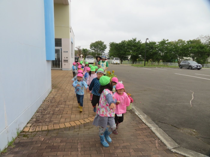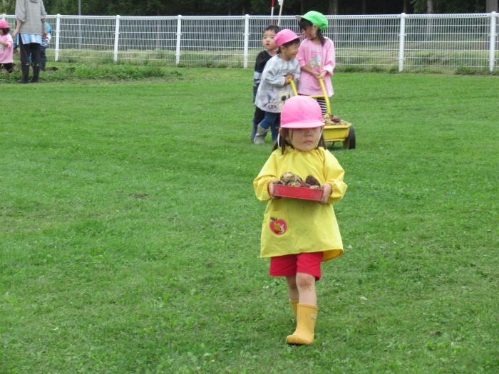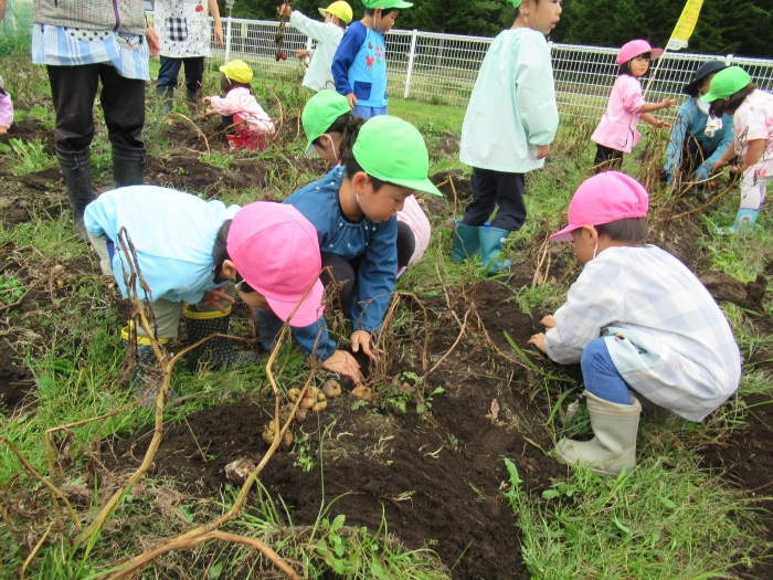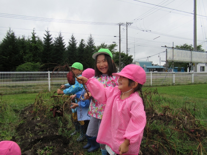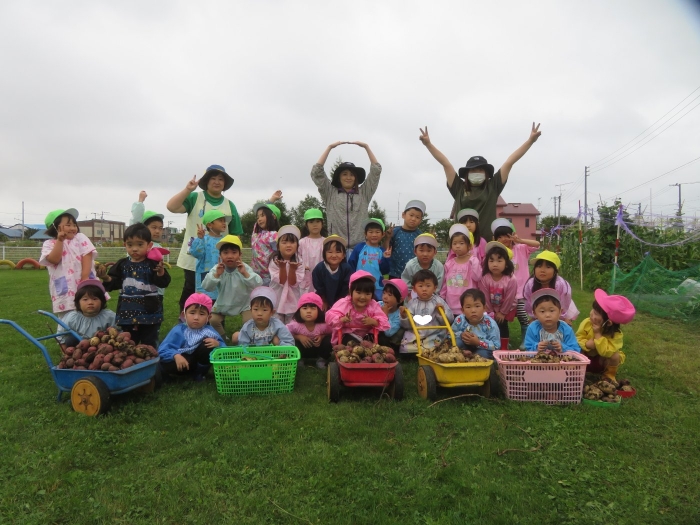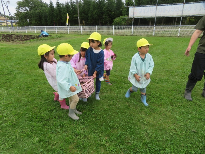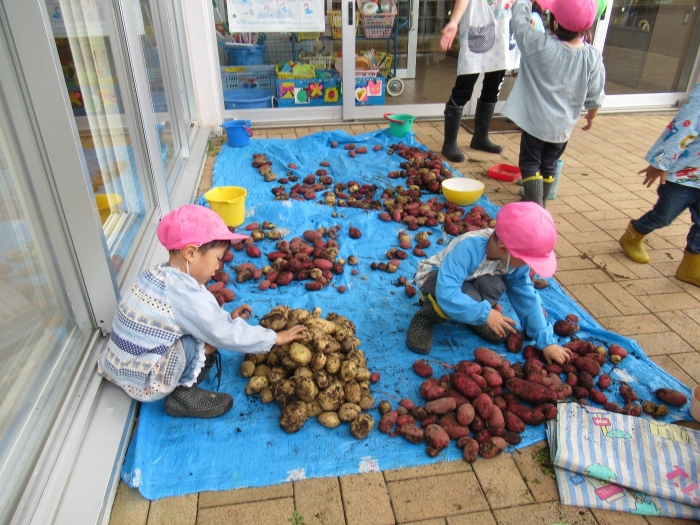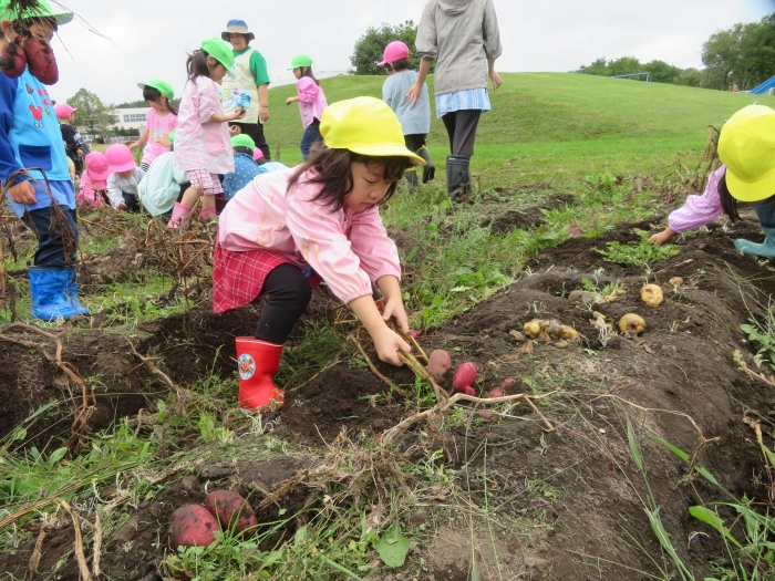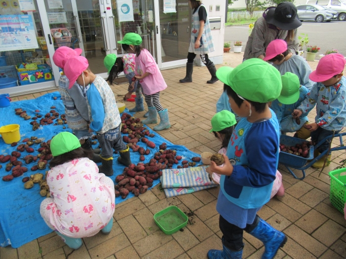 今日は、芋掘りを行いました。黒いマルチを取ると、すでにじゃが芋がゴロゴロを顔を出していました。掘っている途中で、大きなミミズを発見して驚いたり、小さなカエルを発見してちょっとした取り合いになったりしながら(笑)、芋掘りを楽しみました。今年は、雨が多くて少し心配していましたが、美味しそうなお芋がたくさん収穫できました。掘ったお芋は、早速給食と一緒に塩煮にして試食しました。一人6個ずつ選んで持ち帰ったお芋、ご家庭ではどんな料理に変身したのかな…