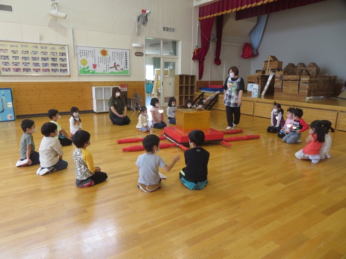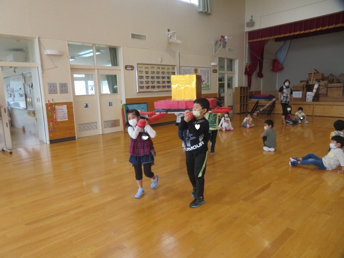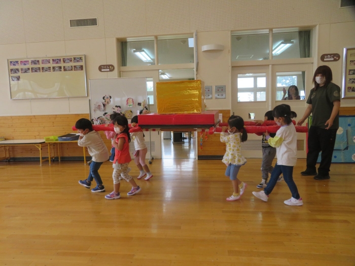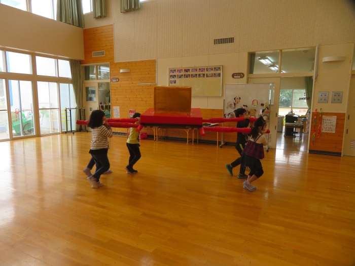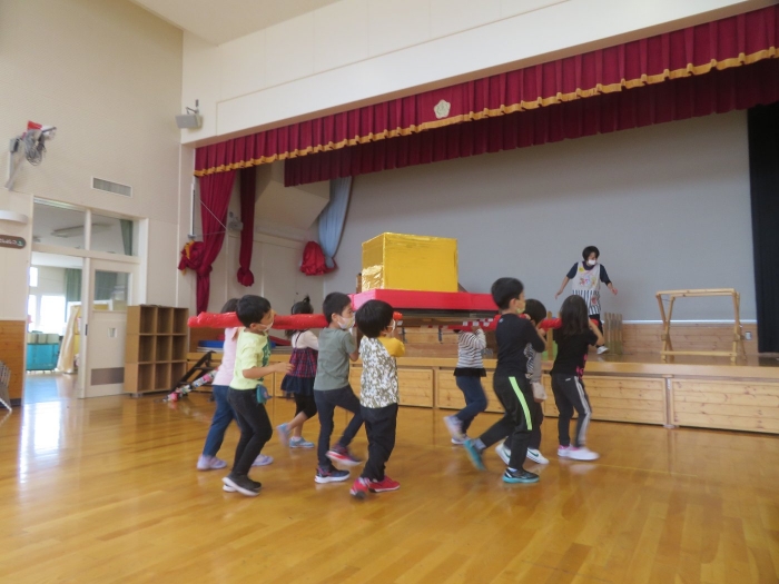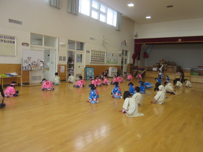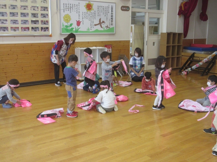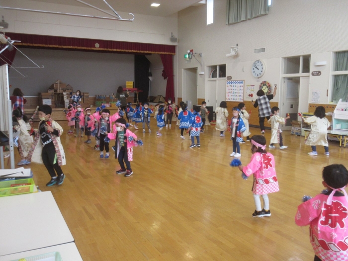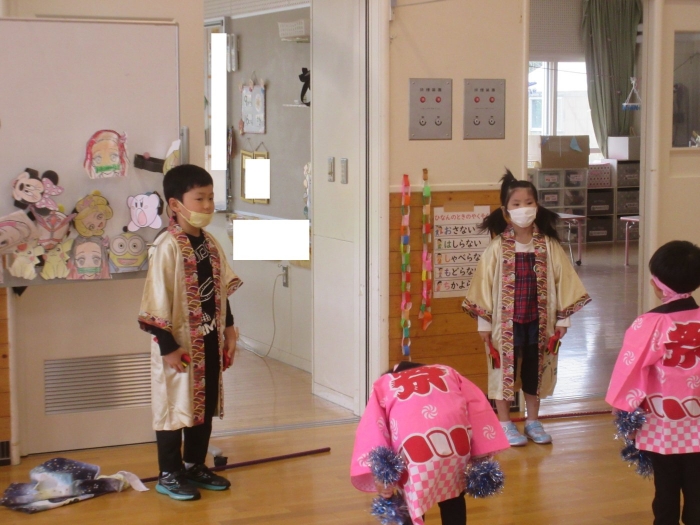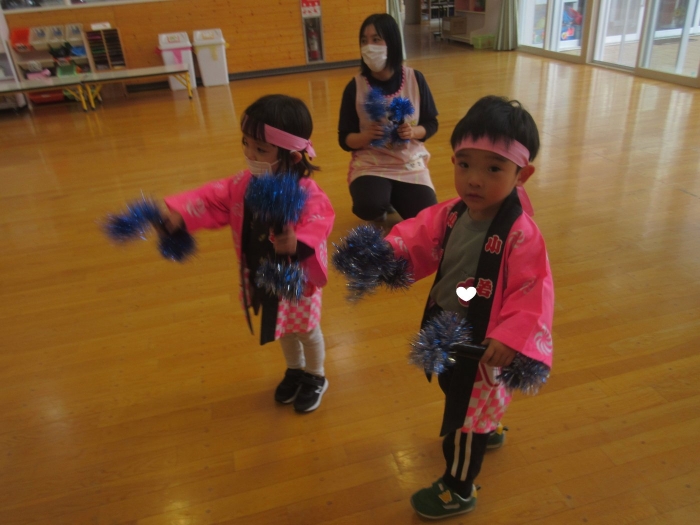 今日は、お祭りの本番で着用する法被を身に付けて、演舞練習を行いました。法被を着ると、いつも以上にやる気が出てくるから不思議ですね。リーダーさんの元気な掛け声と共に、本番さながらに元気に踊りました。法被は今日持ち帰っていますので、当日着用して登園をお願いします。