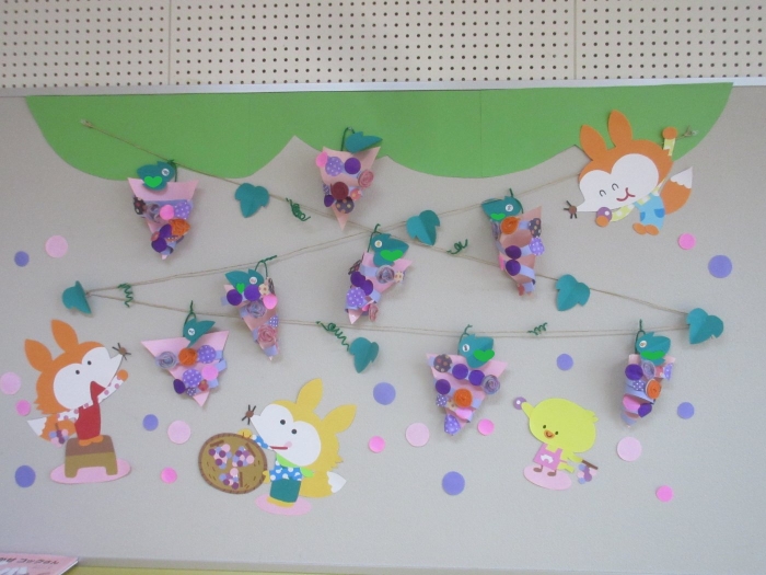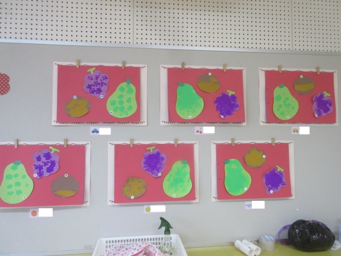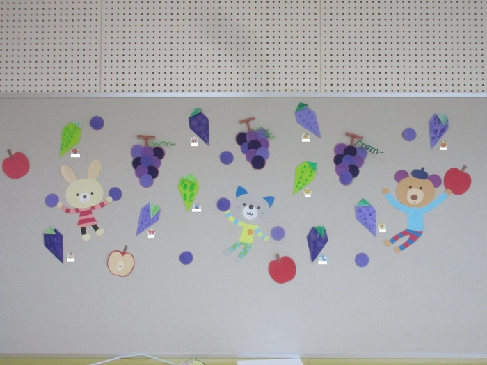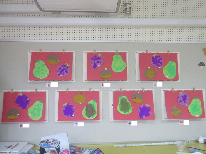 日に日に肌寒くなり、気温に合わせて上着が必要な季節になってきましたね。今日から幼稚園も衣替えで、制服が麦わら帽子からベレー帽に変わりました。お部屋を覗いてみると、先週行った秋の制作物が飾られており、秋一色になっていました。
