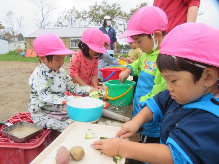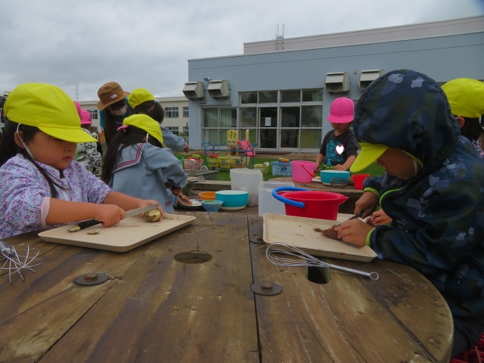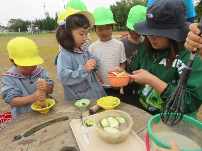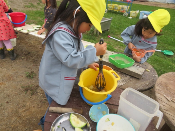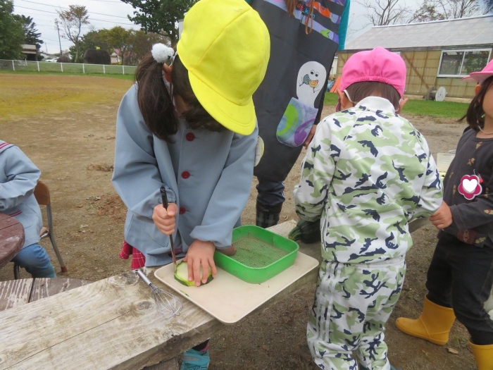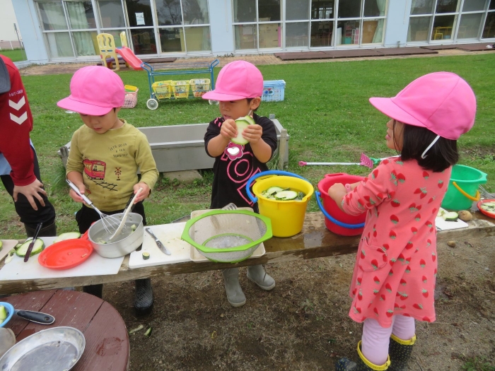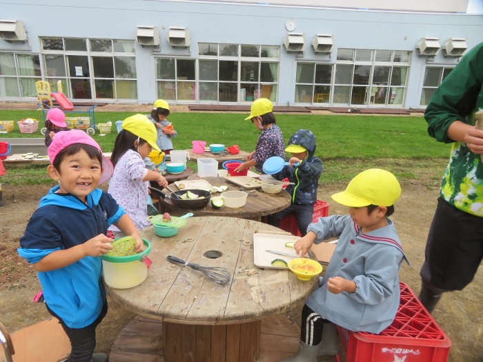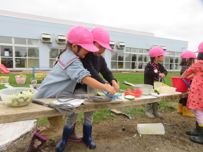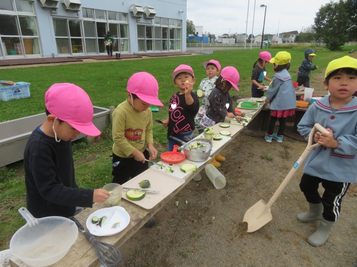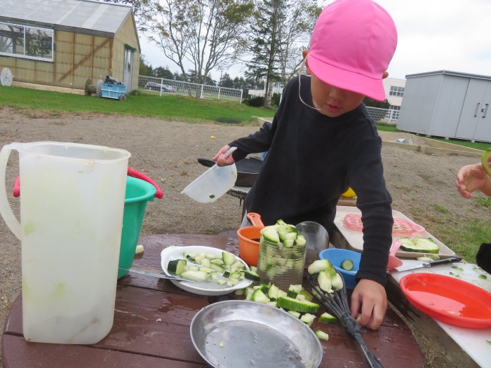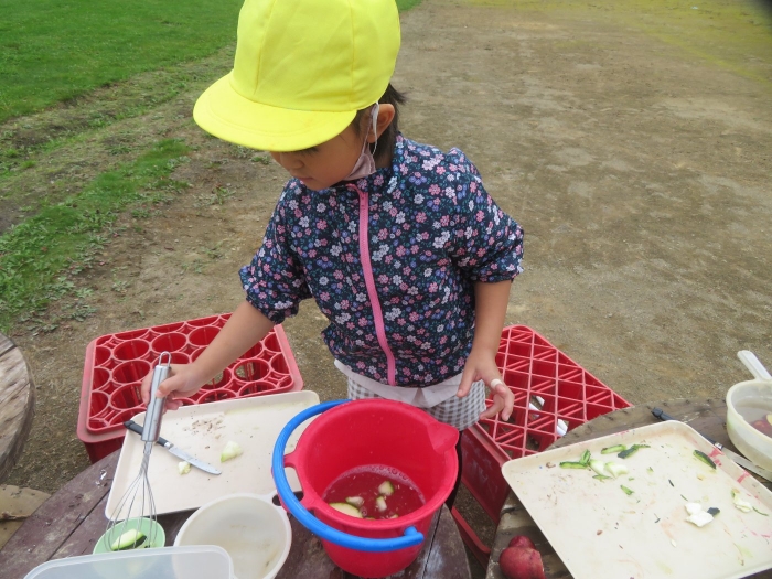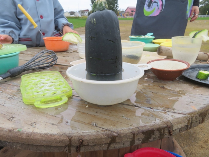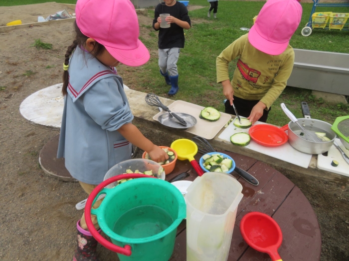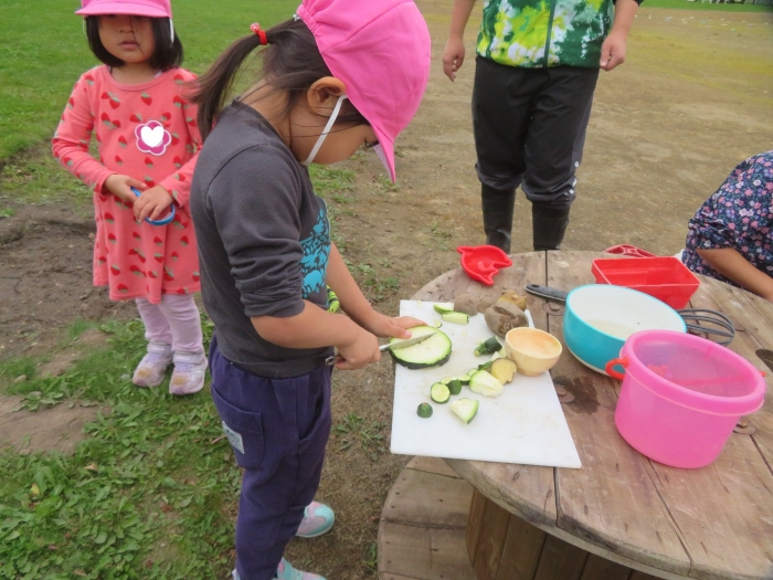 先週から、戸外では料理作りが流行しています。大きくなりすぎたり食べられそうにない収穫物を利用して、すり下ろしたり、ナイフで切ったり、切った具材で様々な料理を作ることを楽しんでいます。収穫物の中でもズッキーニは切りやすいようで、とにかく切ることを楽しんでいます。巨大なズッキーニも、あっという間に使い切ってしまうほど。気分は、すっかり料理人ですね。たけのこさんは、園庭中を走り回り集団遊びを楽しんでいましたが…写真がなくてすみません(汗)。