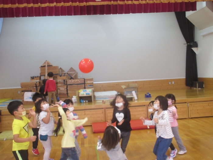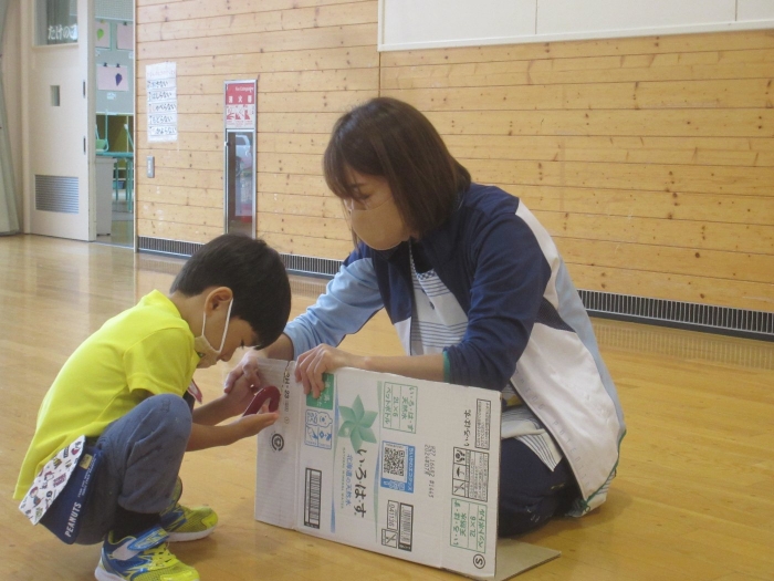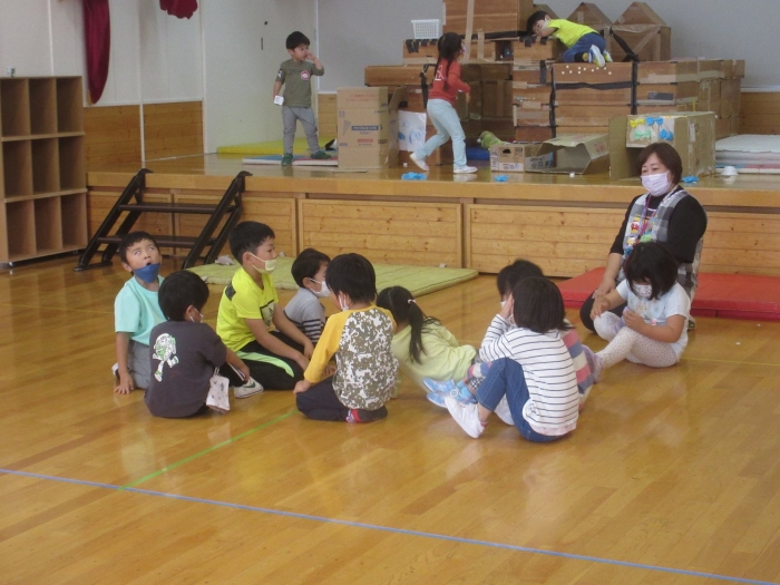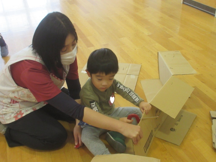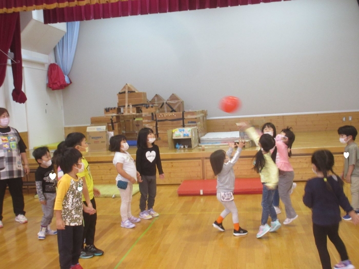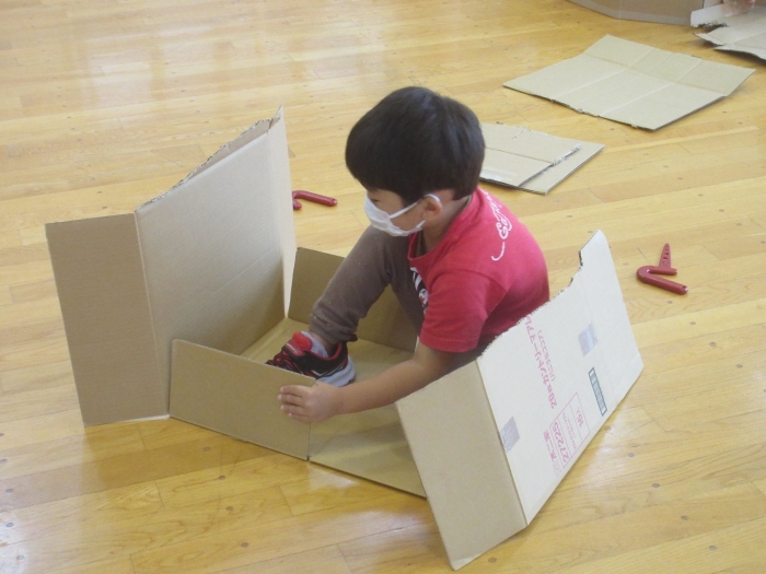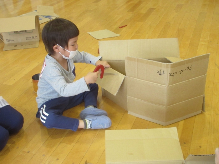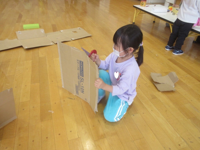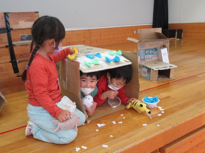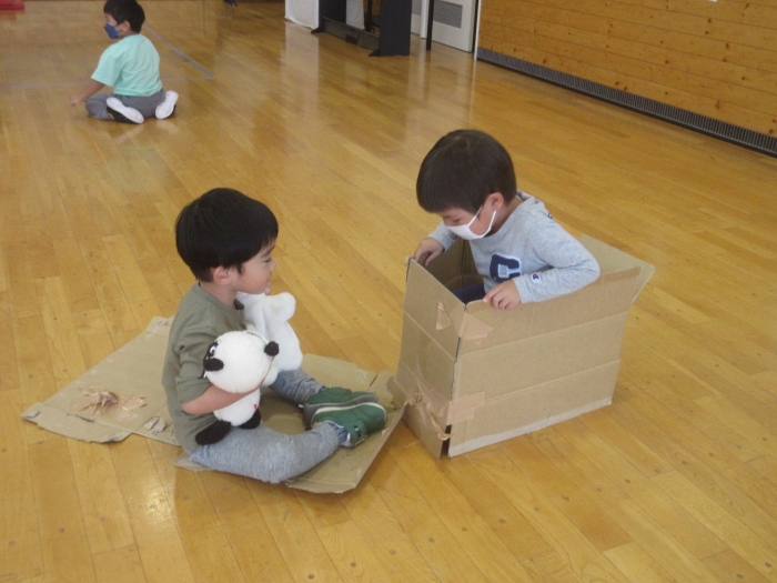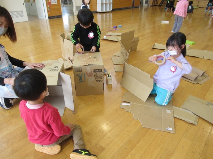 今日は、雨が降ったりやんだりと天候が不安定な一日でしたね。子供達は、室内遊びをたっぷり楽しみました。昨日からたけのこさん発信で始まった『風船バレー』は、つくしさんやいちごさんも仲間入りし盛り上がっていました。テレビで世界バレーを見たことがきっかけのようです。その横では、先週拾ってきたどんぐりや松ぼっくり等の自然物での制作、段ボールで犬小屋作りを楽しんでいるお友達もいました。