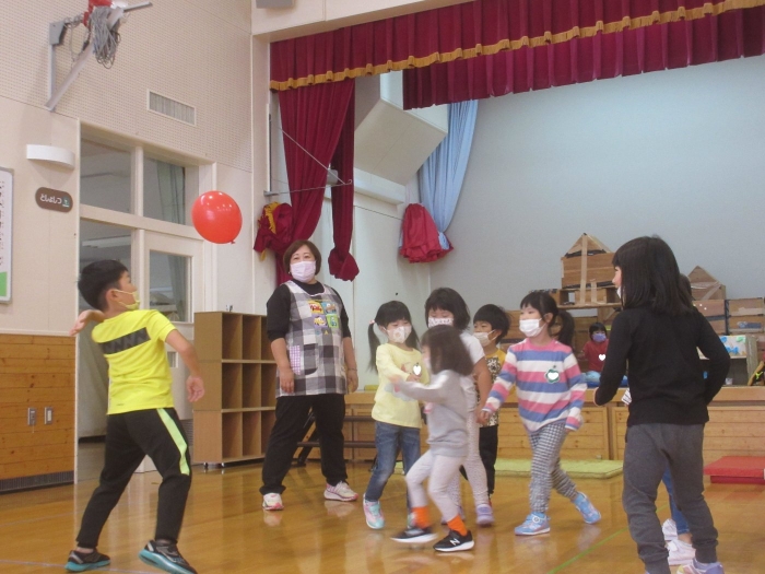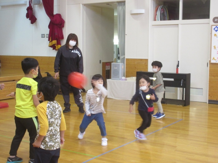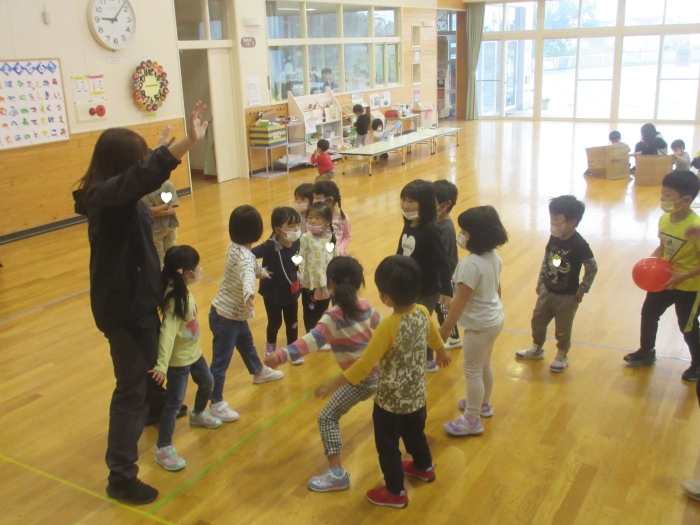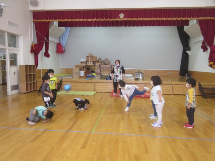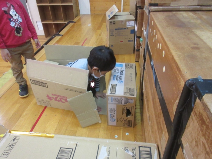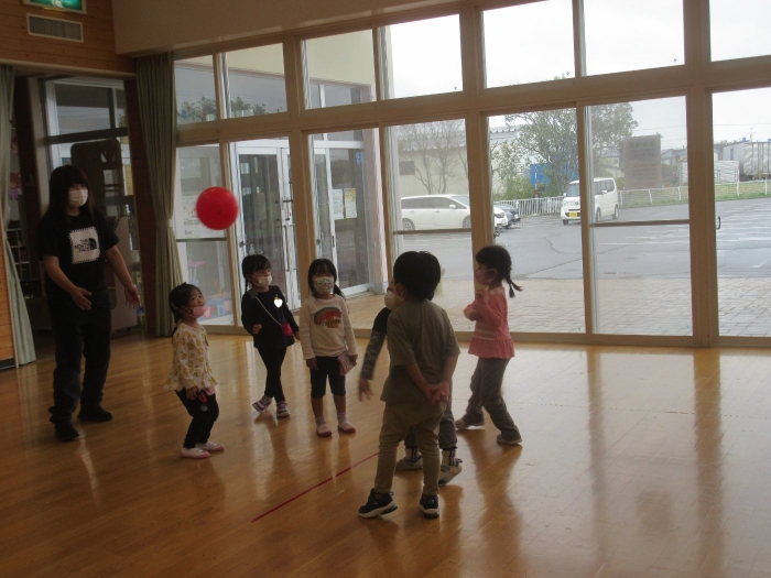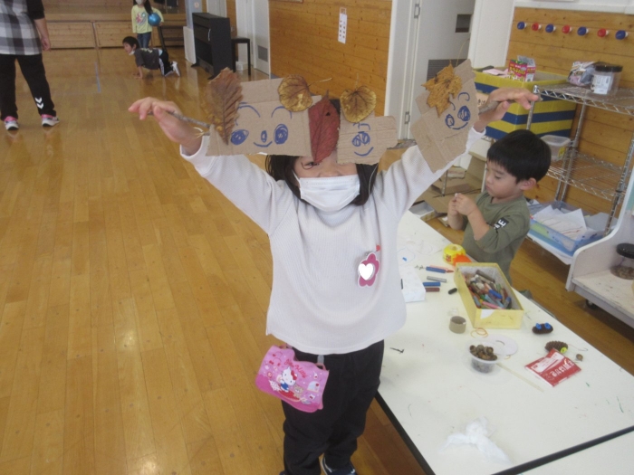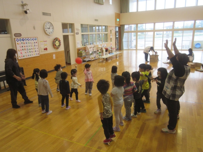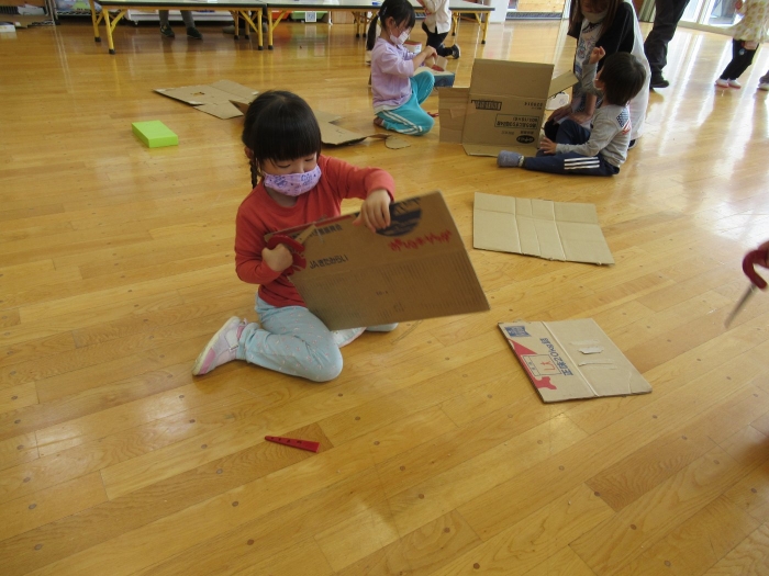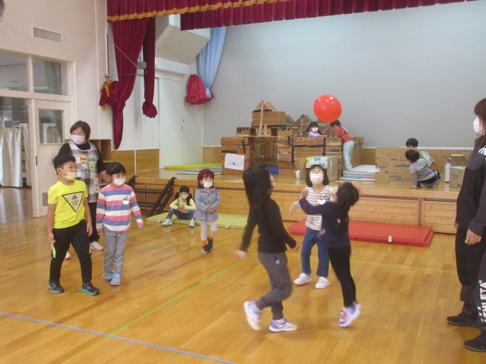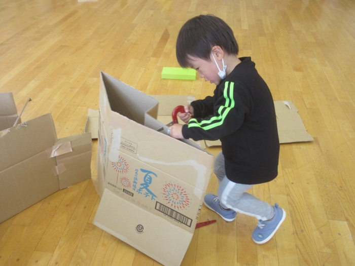 今日は、雨が降ったりやんだりと天候が不安定な一日でしたね。子供達は、室内遊びをたっぷり楽しみました。昨日からたけのこさん発信で始まった『風船バレー』は、つくしさんやいちごさんも仲間入りし盛り上がっていました。テレビで世界バレーを見たことがきっかけのようです。その横では、先週拾ってきたどんぐりや松ぼっくり等の自然物での制作、段ボールで犬小屋作りを楽しんでいるお友達もいました。