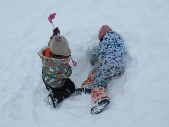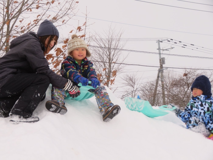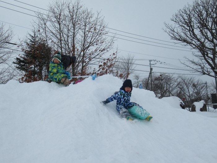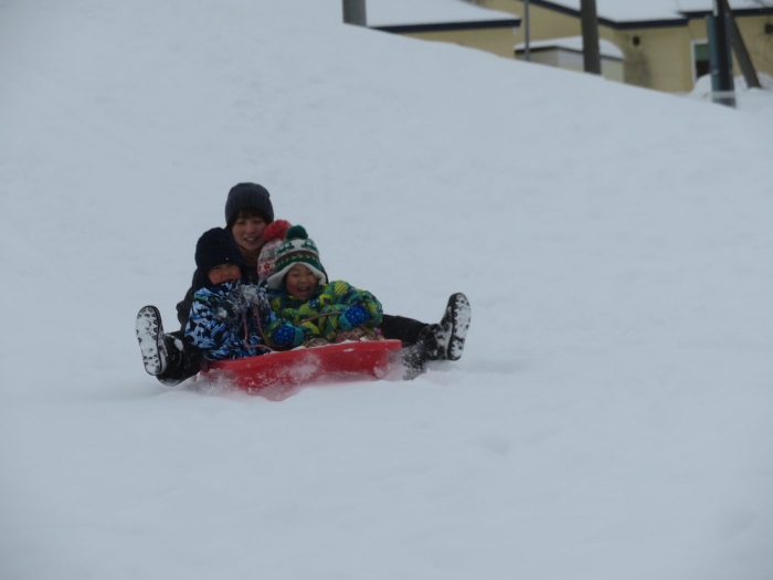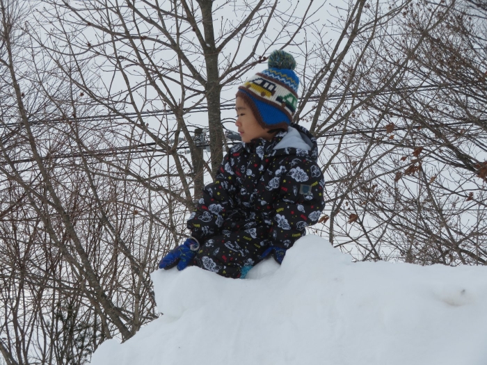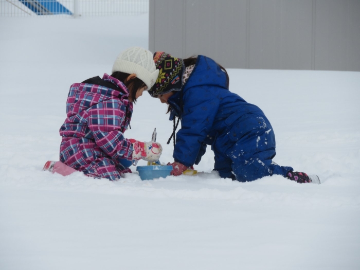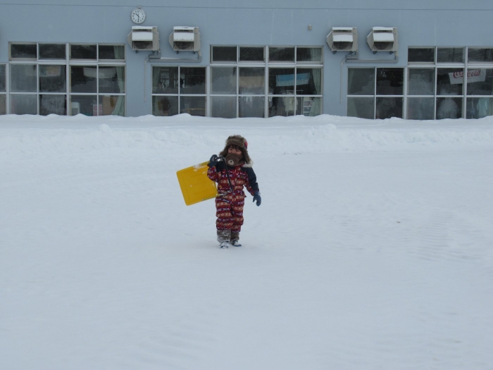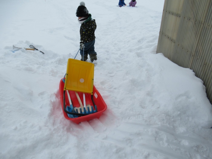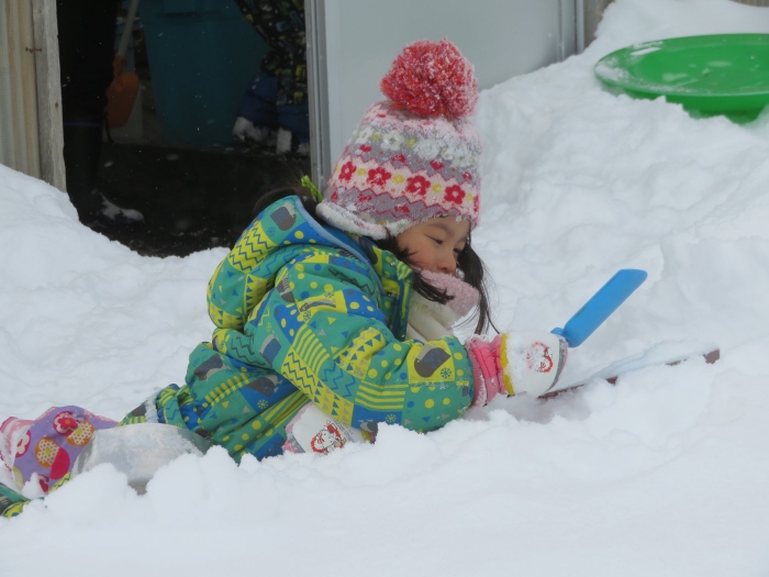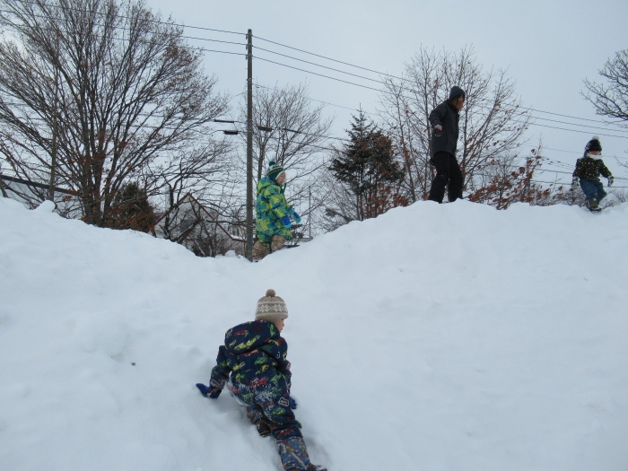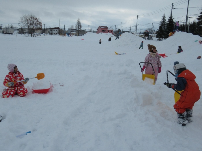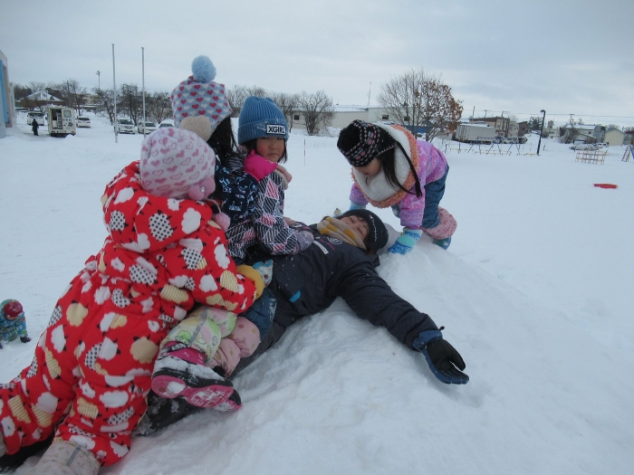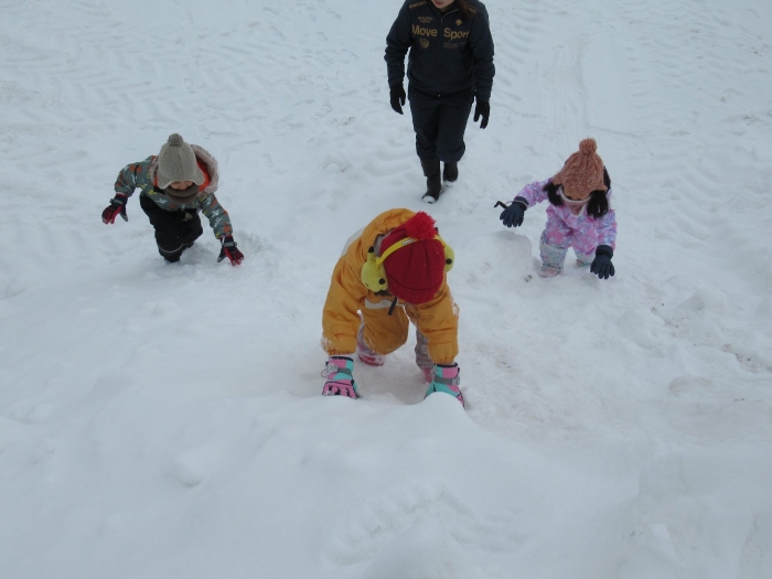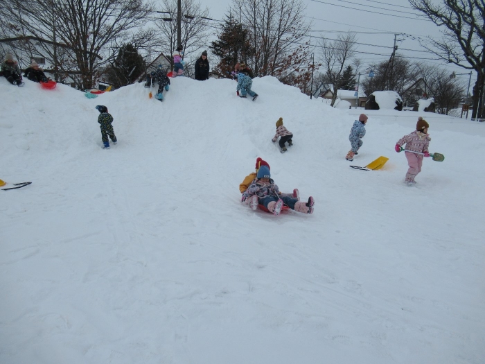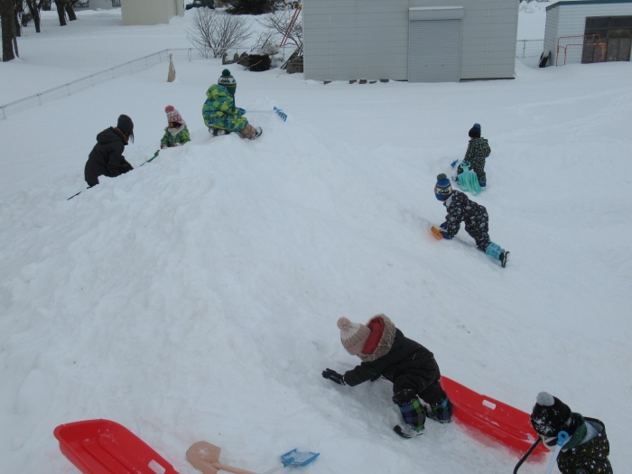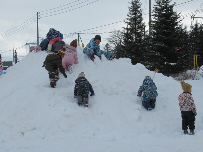 朝、登園してグランドを見るとビックリ!なんと大きな雪山が出現!実は、たけのこ組のR君のお父さんが、昨日の夜、子ども達のために雪山を作ってくださいました。ボコボコしていたり、急な斜面があったりしていて、築山とは違った楽しさがあるようです。