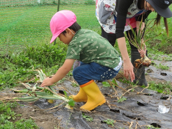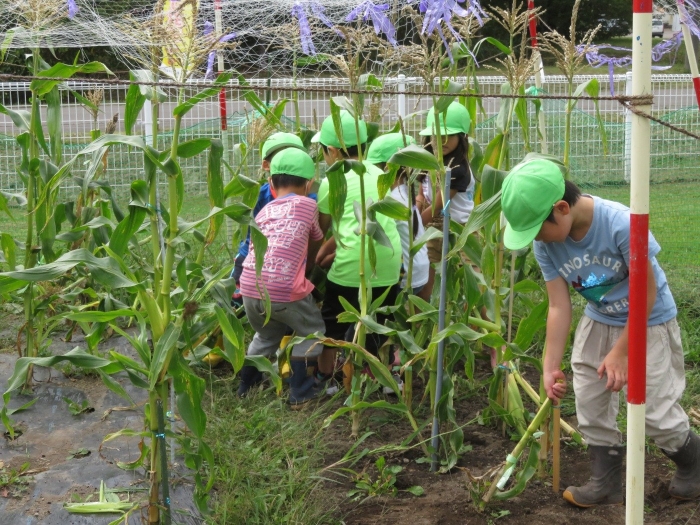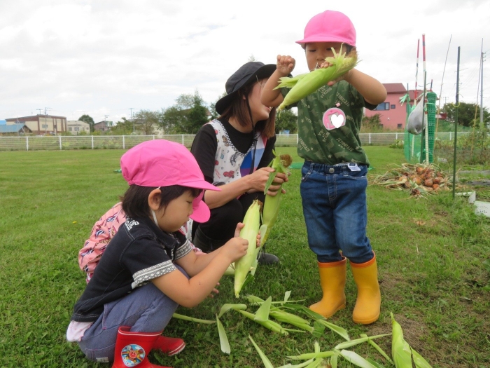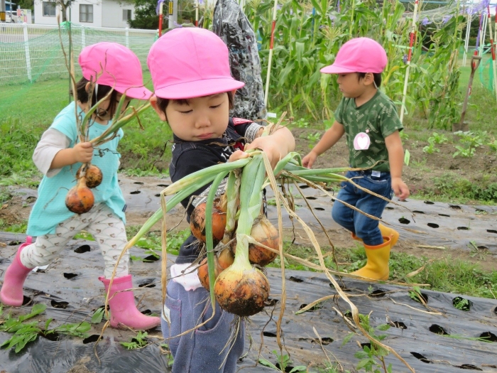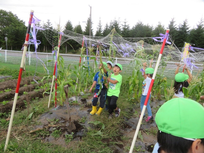 昨日は、玉ねぎやトウモロコシ、じゃが芋等、お休みしていたお友達のために残しておいた作物の最後の収穫をして、たけのこさんで畑の片付けを行いました。作って食べて終わるだけでなく、最後の片付けまで行うことで、トウモロコシの根がとても頑丈で「何かに使えるね!」と新たな発見がありました。どんなふうに活用していくのでしょうね。いちごさんも、収穫を手伝ってくれましたよ。
