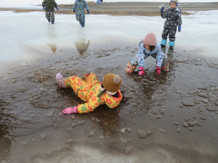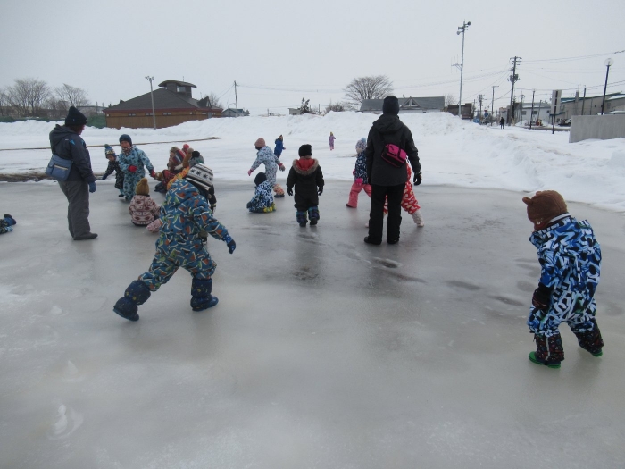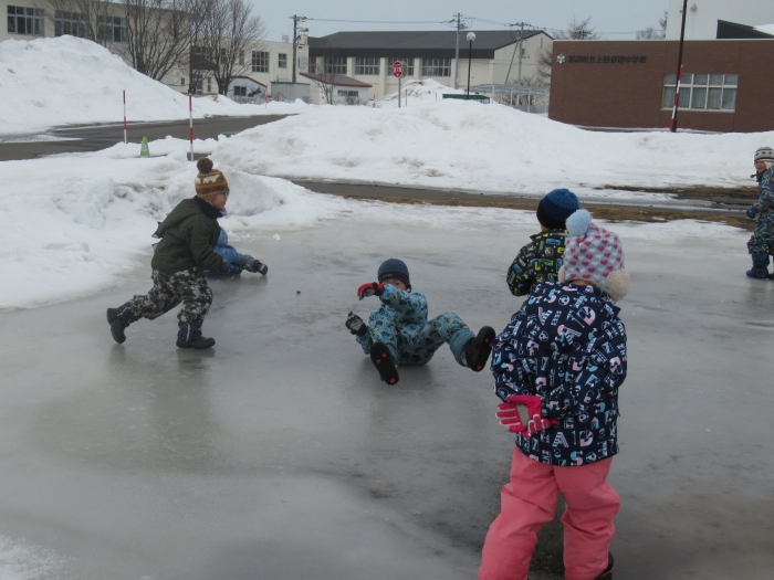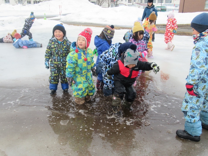 今日、いちごさん・たけのこさんは、スケートリンクまで遊びに行きました。ここ数日、気温が高く雪解けが進んでいますね。残り僅かの雪遊びだったはずが…水遊び?になってしまったお友達もいたようです(汗)。