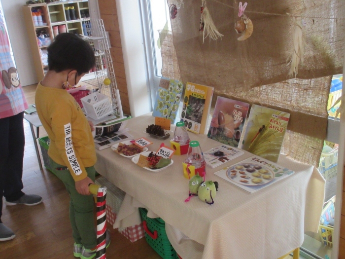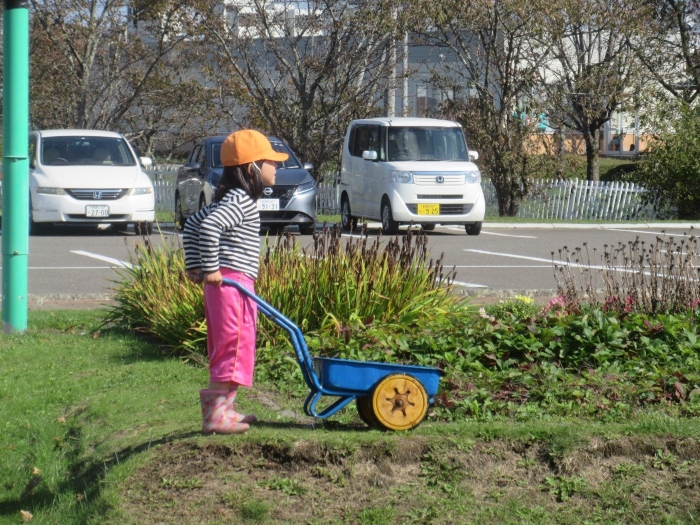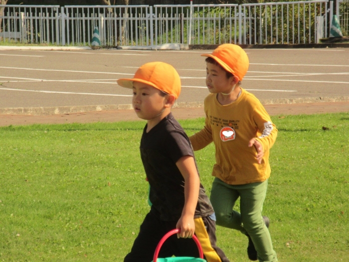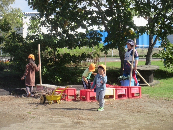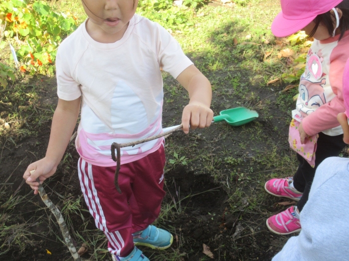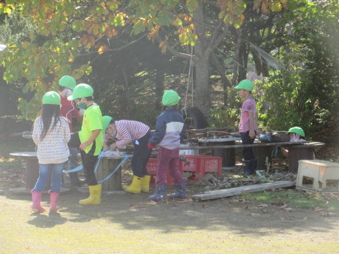 たけのこさんは、グリーンランドでの家作りを継続中。今日は、家の横に『橋?』『はしご?』というものを作っていました。コードリールや木材を運ぶ子、紐を使って結んでいる子、道具をおさえている子など、友達と声を掛け合いながら取り組んでいました。最近のたけのこさんを見ていると、クラスの仲間と協力しながら活動する姿が多く見られるようになり、成長を感じています。つくしさんは、花壇の近くでごっこ遊び。まずは、色々な道具を運んだり、並べたりして、自分達のスペース作り。これから、どんな遊びに発展していくのか楽しみです。いちごさんは、どんぐりを拾ったり、虫やミミズの観察をしたりと、自然との触れ合いを満喫中。なんと花壇で、ミミズの家族を見つけたらしいですよ。他にも、木登りや固定遊具に挑戦しているお友達もいました。