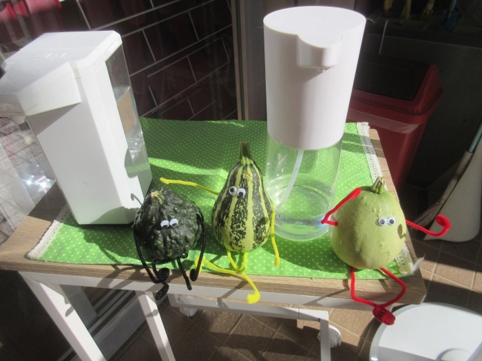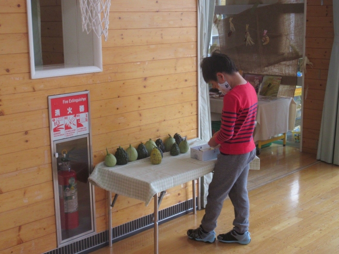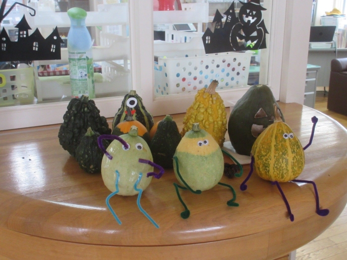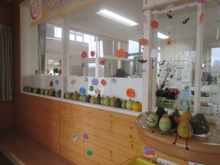 先日、20年ほど前に上西春別幼稚園を卒園した園児の保護者の方から、たくさんの『おもちゃかぼちゃ』をいただきました。当時、お子さんの担任だったH先生に会いに来てくださったようです。20年経った今でも、幼稚園時代の先生のことを覚えており会いに来てくださるなんて、本当に嬉しいことですね。その保護者の方は、現在も地域にお住まいで、幼稚園もとてもお世話になっています。いただいたおもちゃかぼちゃは、早速、幼稚園のあちこちに飾り、ハロウィンムード一色になりました。