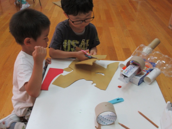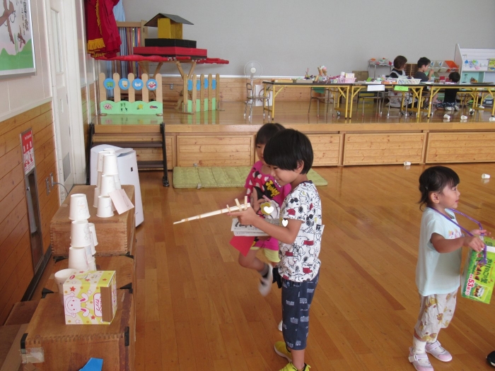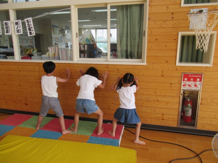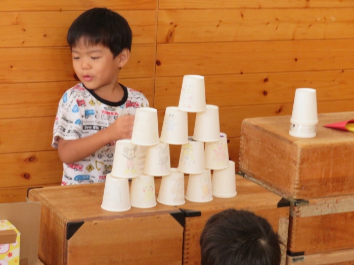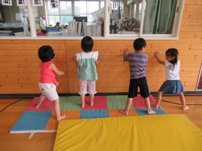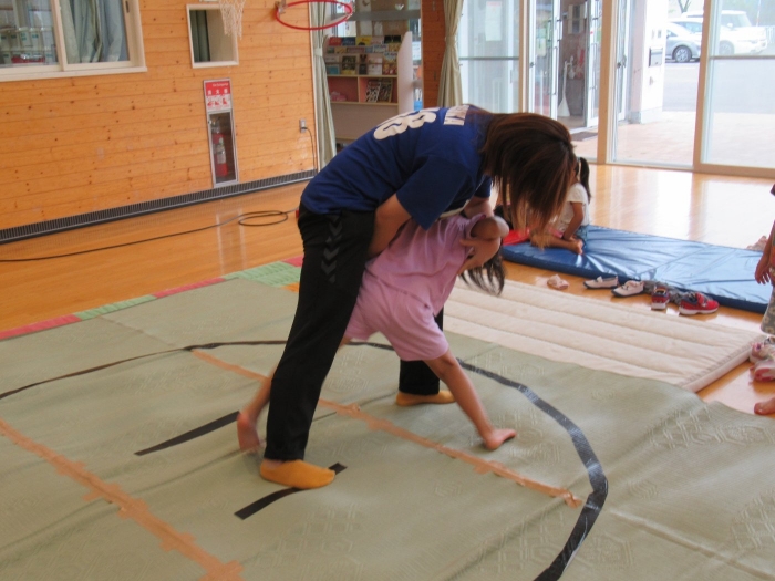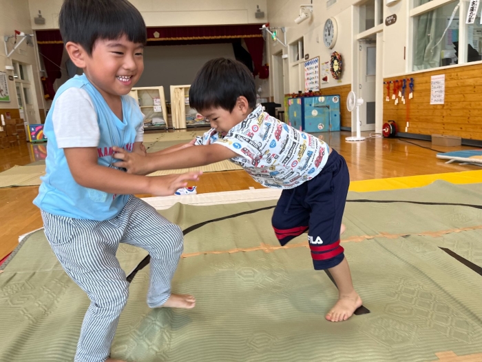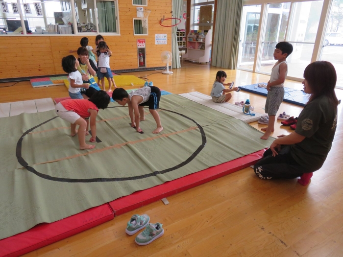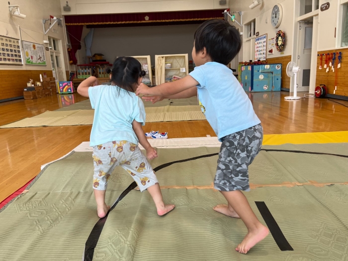 たけのこさんは、現在相撲に夢中。朝稽古のため早く登園し(笑)、裸足になり準備万端でお友達が来ることを待っています。本物の力士は、塩をまくことやしこ名があることを知り、実際の取り組みの様子を見て研究したり、壁に向かってつっぱりの練習をしたりする姿も。一人一人しこ名も考えたそうです。まるで相撲部屋のようです。神社祭典の相撲大会が、今から楽しみです。