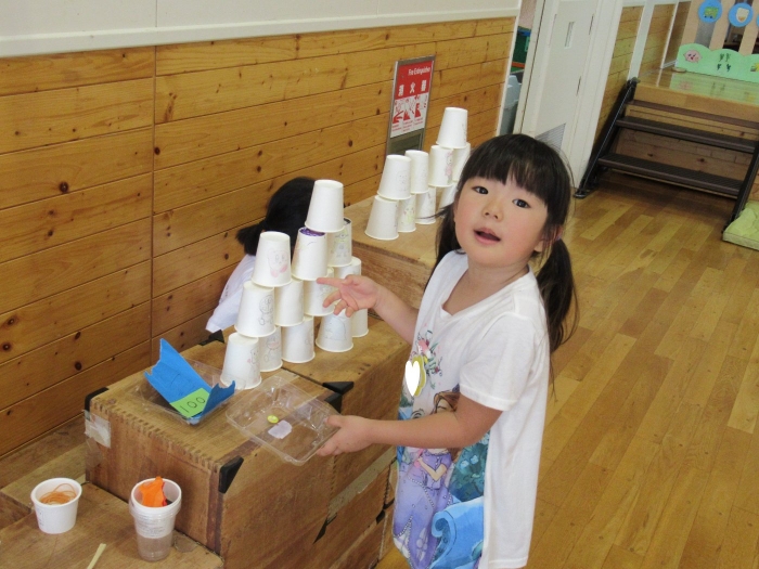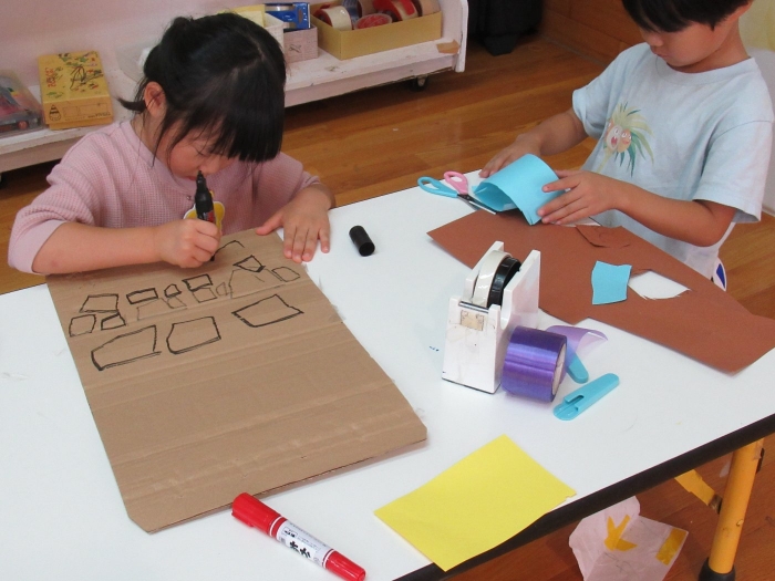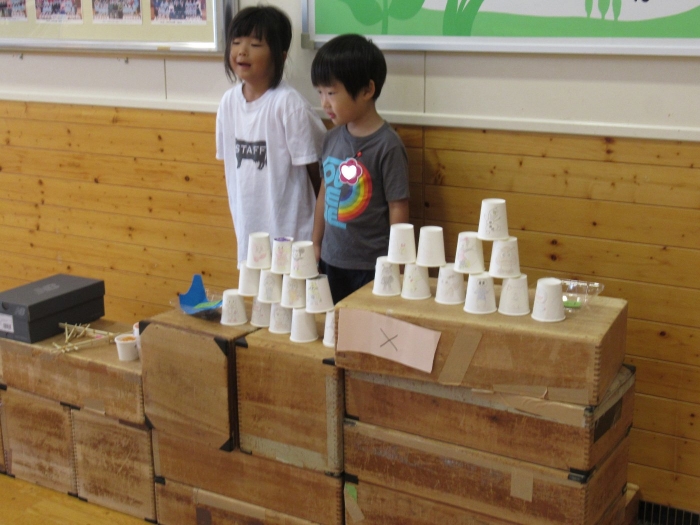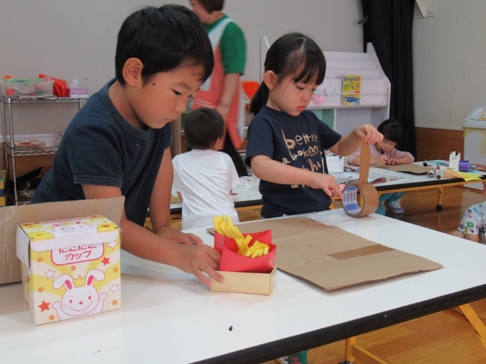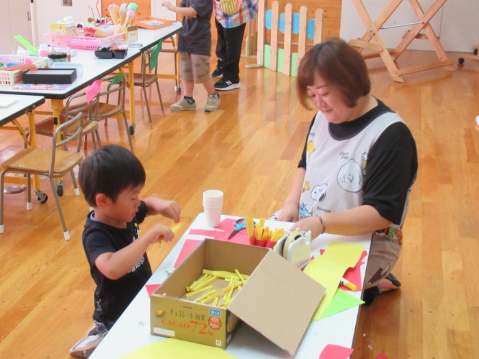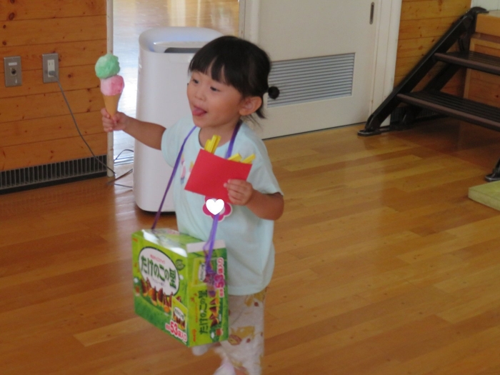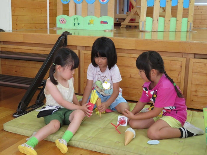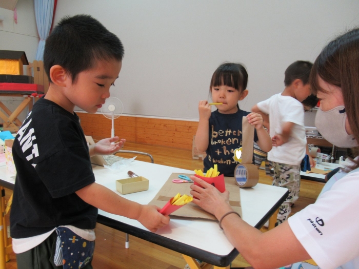つくしさん・いちごさんは、お店屋さんごっこを楽しんでいます。中学3年生が作ってくれた的あてを新たな場所で始めたり、ジュースやポテトを作ったり売ったり。お店屋さんの遊びを通して、イメージを膨らませて品物を作ることや、店員さんやお客さんになってやりとりをすることを楽しんでいます。