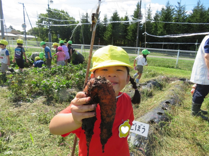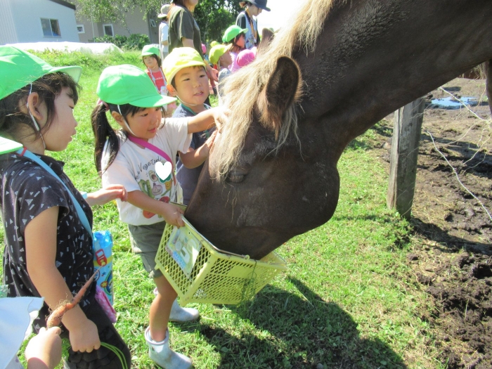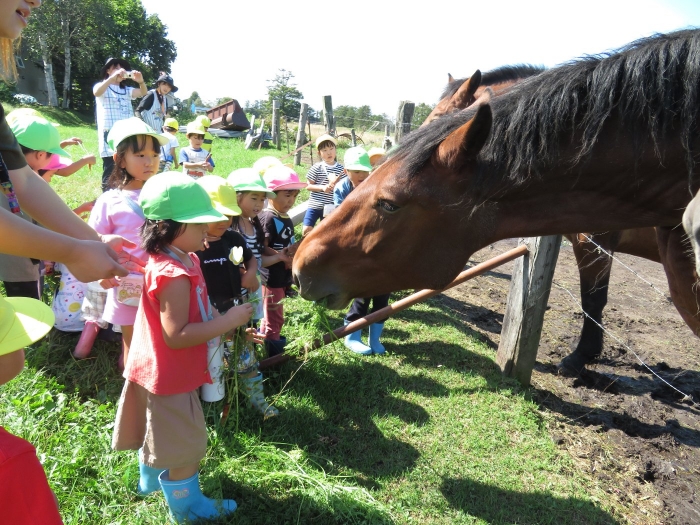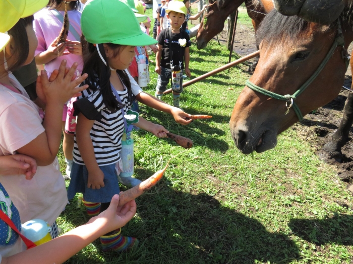 練習後、みんなで人参を収穫し「採りたての人参と葉を馬達に届けよう!」と馬達のもとへ。新鮮な人参、たくさん食べてくれました。
