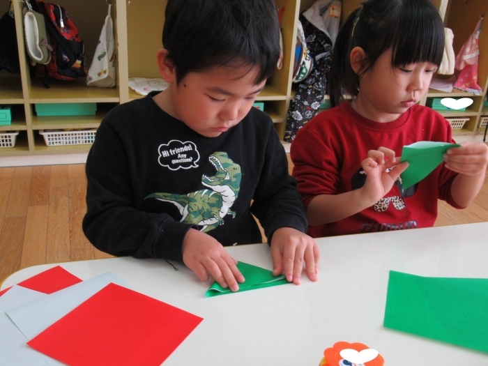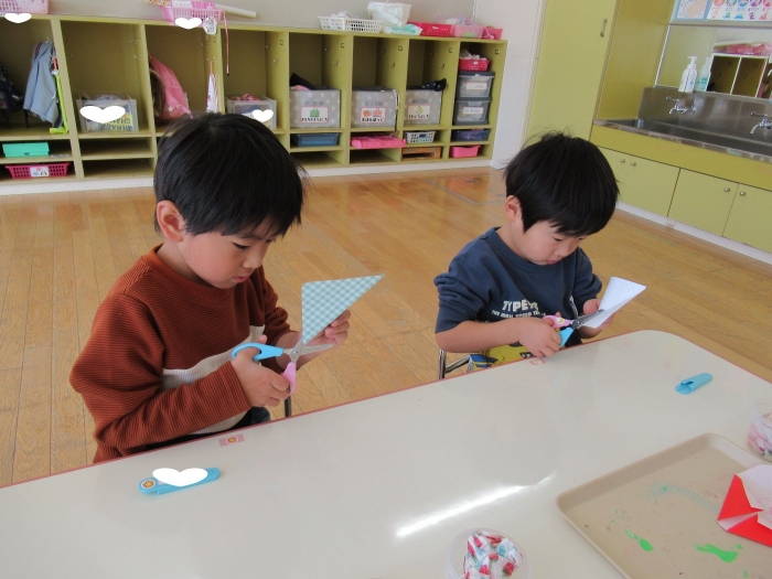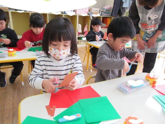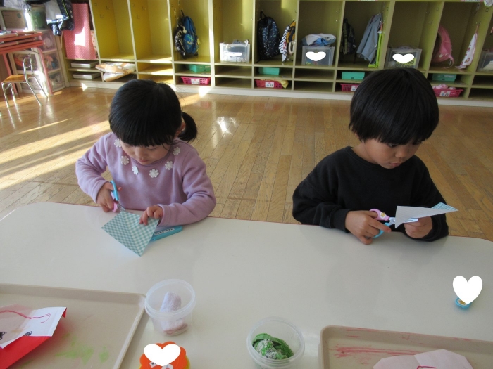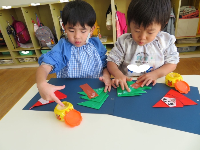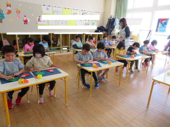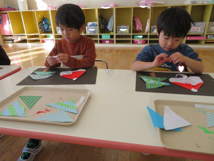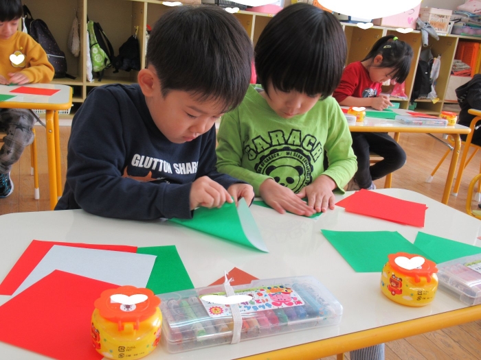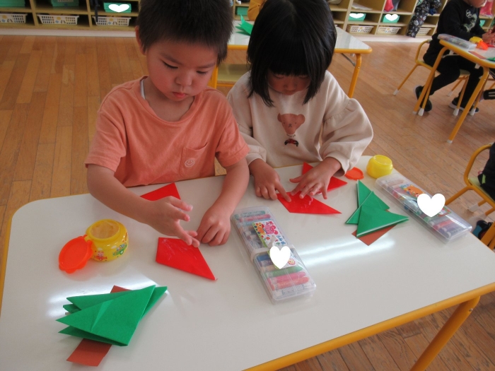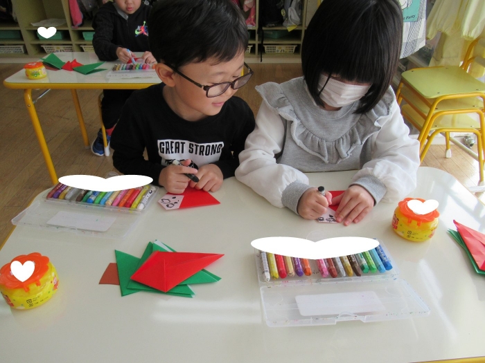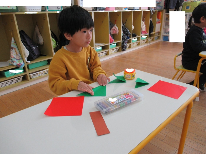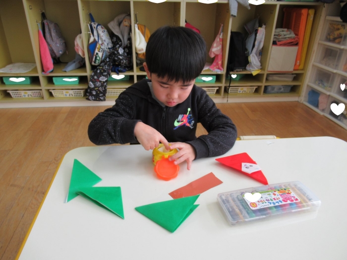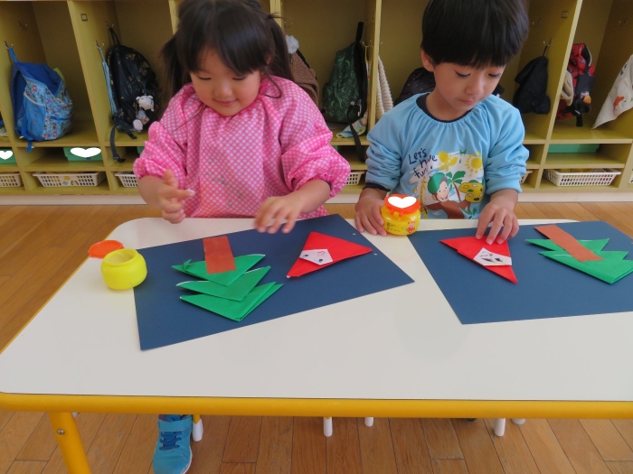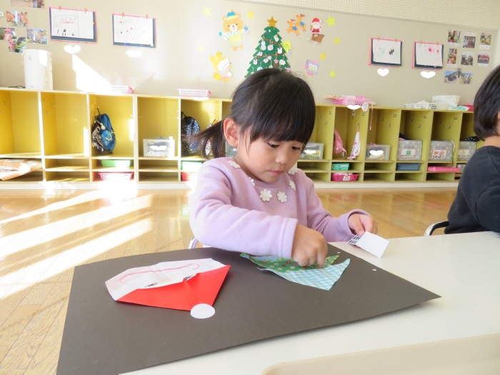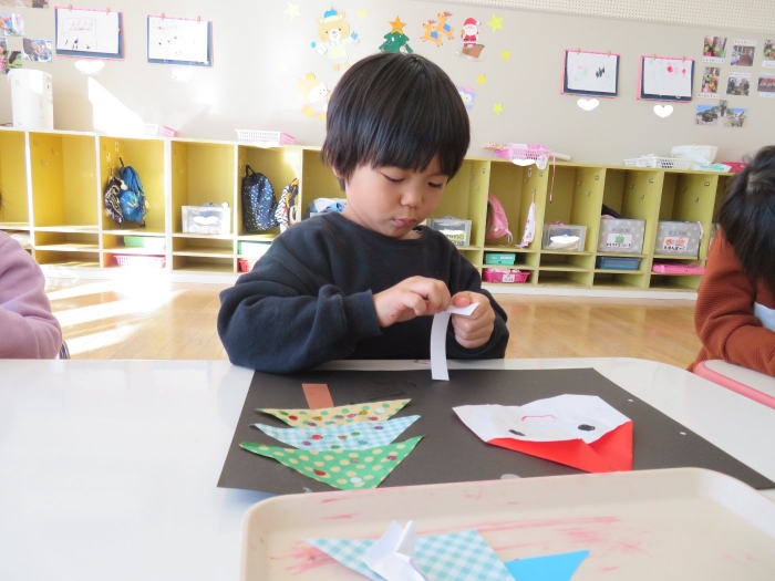 もうすぐクリスマスですね。つくしさん、いちごさんは、数日かけてクリスマス制作を行っていました。たけのこさんは、サンタさんへのお願い事を書いて飾っていました。子ども達にとっては、わくわくがいっぱいの数日間ですね。完成した作品は、後日発行のクラスだよりをお楽しみに。