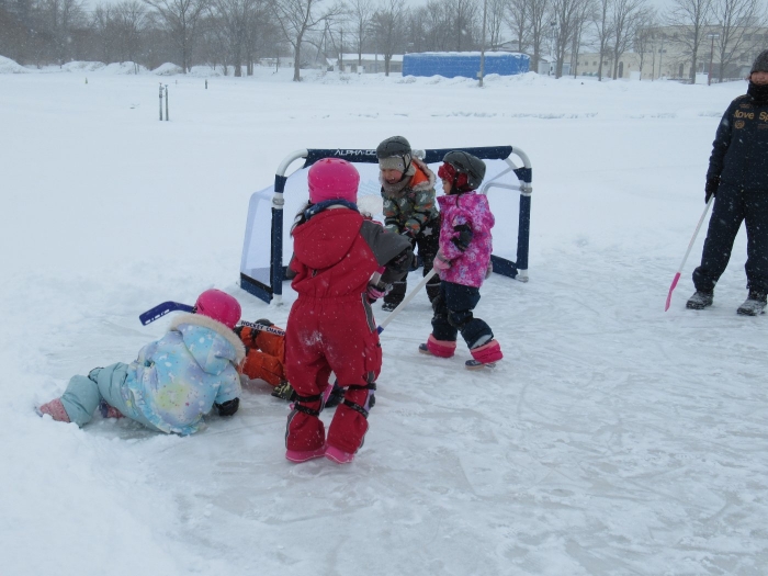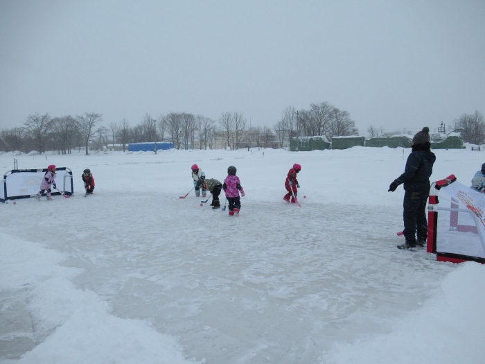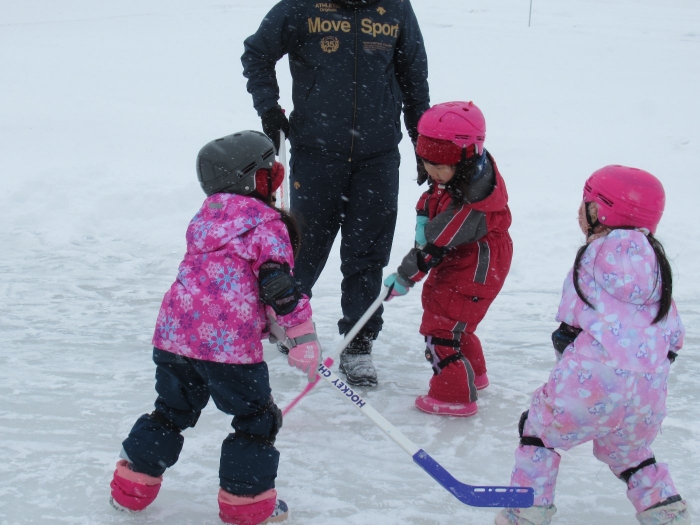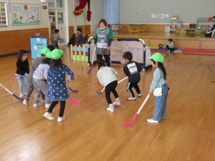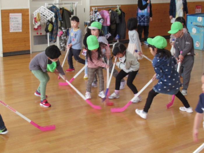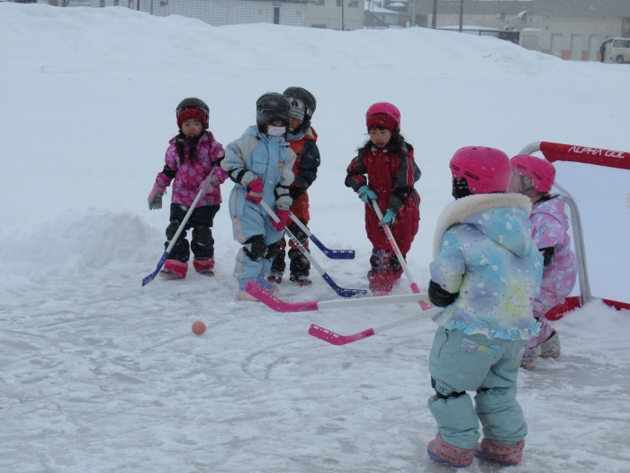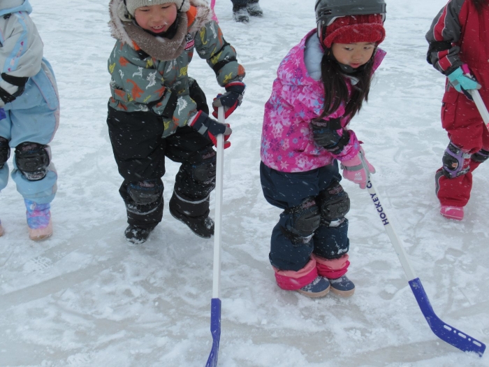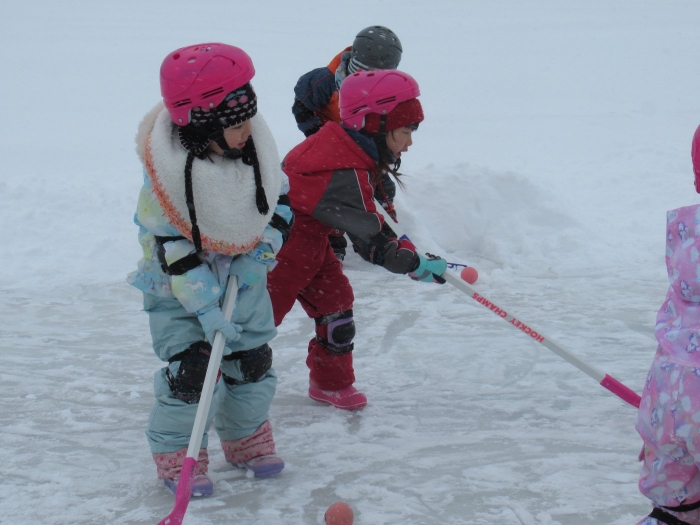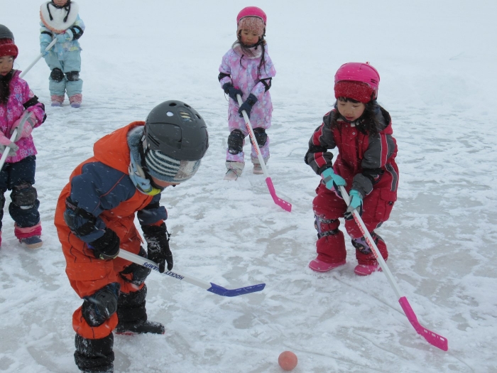 3学期に入り、たけのこさんを中心に楽しんでいたホッケー、今日は本当の氷の上で体験することができました。以前から、“いつか本当の氷でホッケーができるといいな~”と考えていた子ども達と先生方。そこでスケート協会の会長さんにお願いしたところ、「シーズン終了後は、リンクを使っていいですよ。」という嬉しいお返事をいただくことができました。長年、氷上ホッケーを楽しんでいる中西別幼稚園さんから防具やヘルメットを借りて、いざスケートリンクへ。滑って転んでなかなか試合にならないんだろうな~と思っていたら、大間違い!想像以上に、たけのこさんの動きが良いことにビックリ!リンクが溶けるまで、あと何回できるかな…。