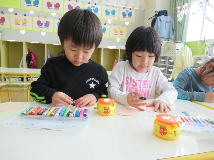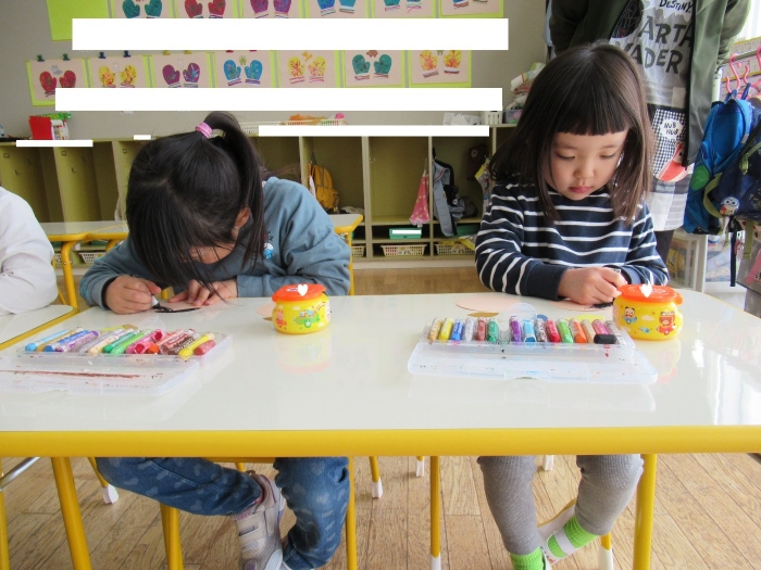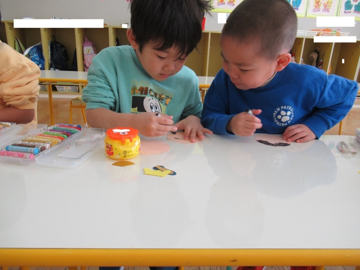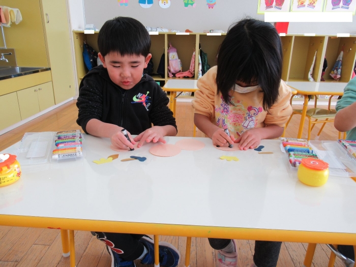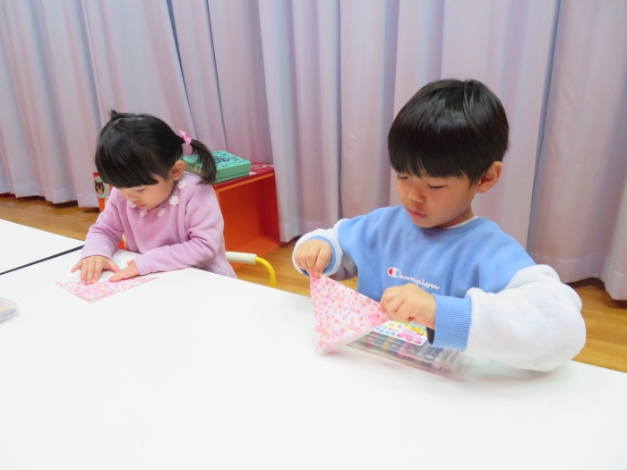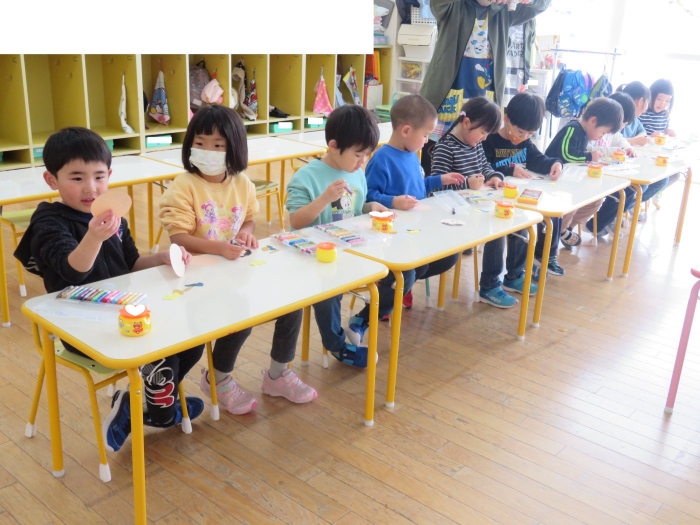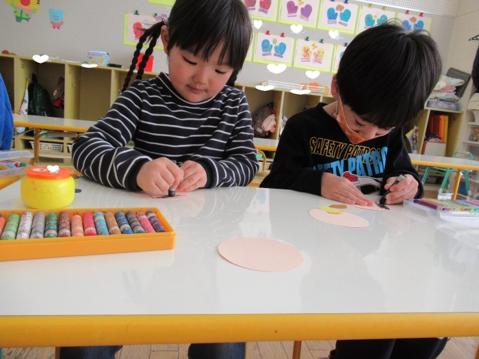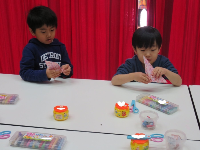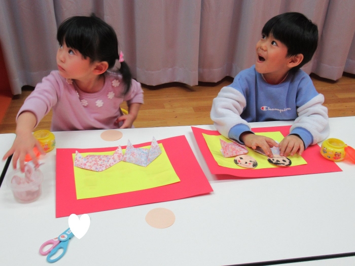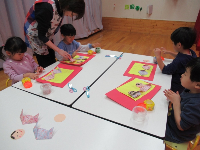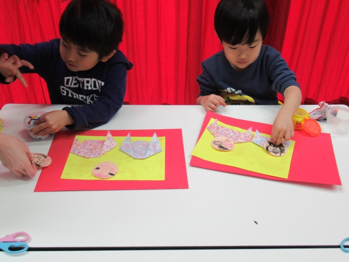 今日、つくし組・いちご組は、ひな人形制作。現在、お別れ会準備のため2クラス合同で過ごしていますが、制作はクラスに分かれて行いました。いちご組は、お別れ会の秘密の会場になっていて使えないため、ステージで行いました。