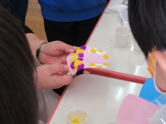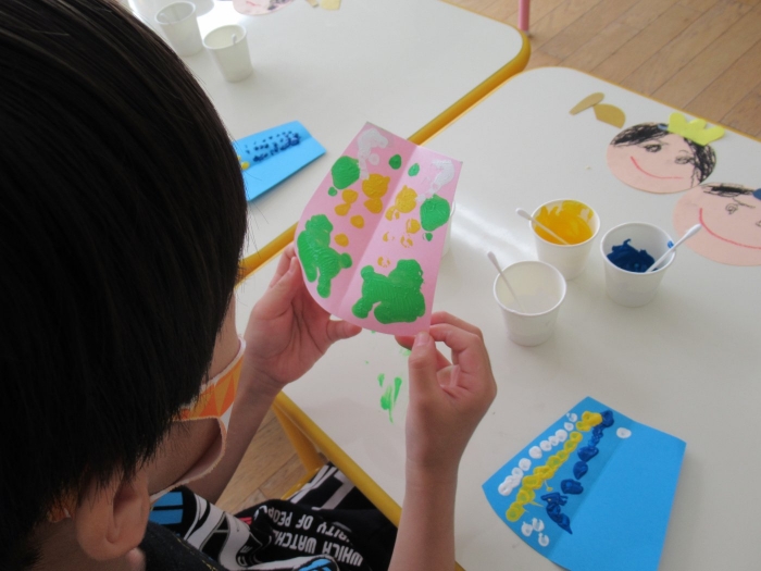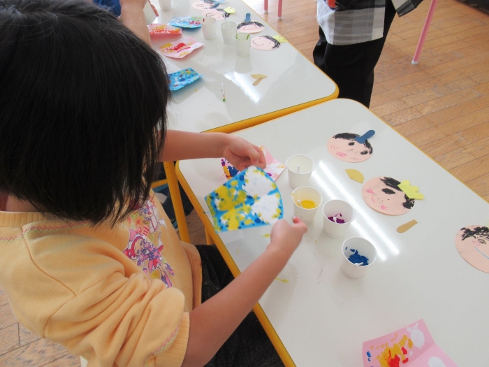 半分に折れている用紙の片方だけに絵の具をつけるよ
