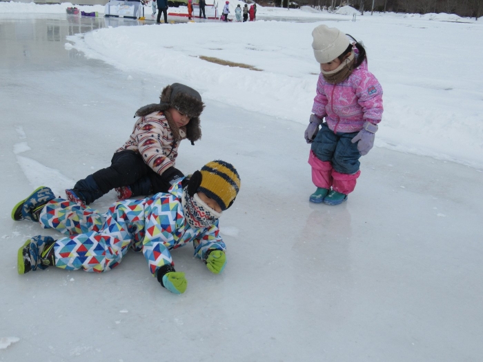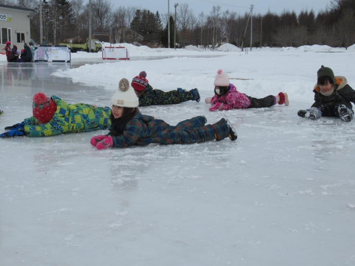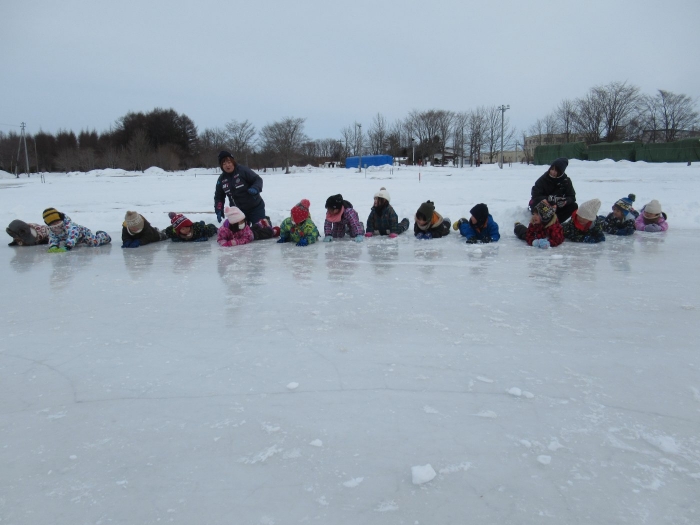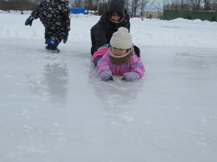 中学校へ行った後、たけのこさんは2回目の氷上ホッケーへ。今日のリンクは、前回とは違いかなりツルツルで転倒する子続出でしたが、白熱した試合が繰り広げられていました。つくしさん・いちごさんは、たけのこさんの試合観戦後、空いているスペースを利用してリンクの上を歩いたり転がったりして遊びました。