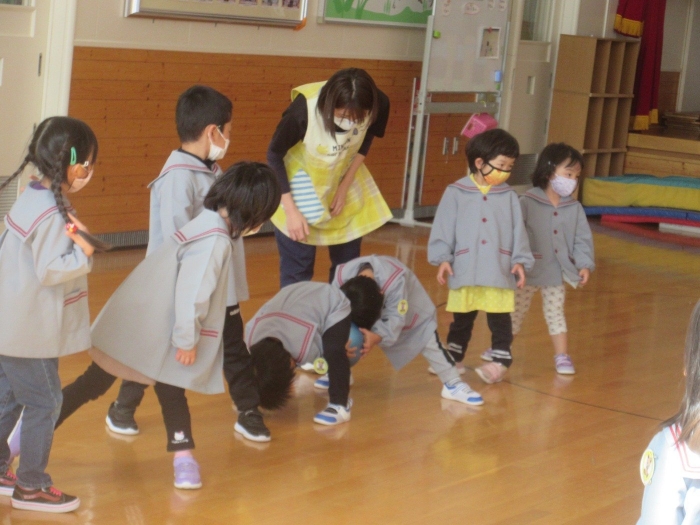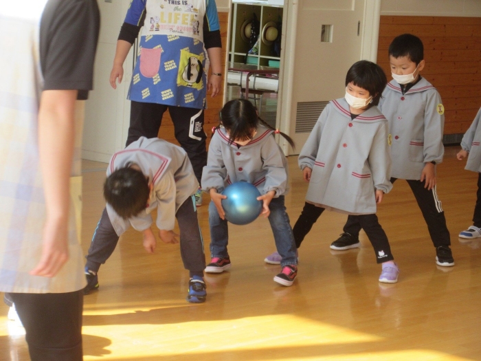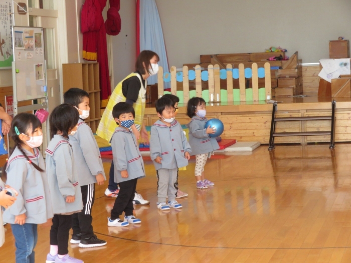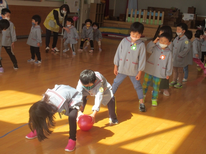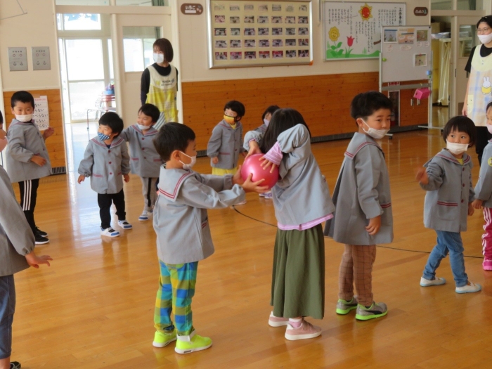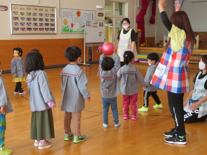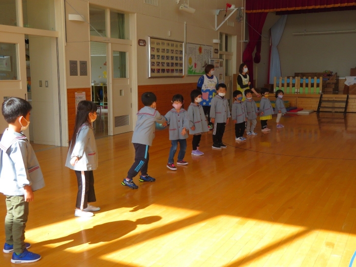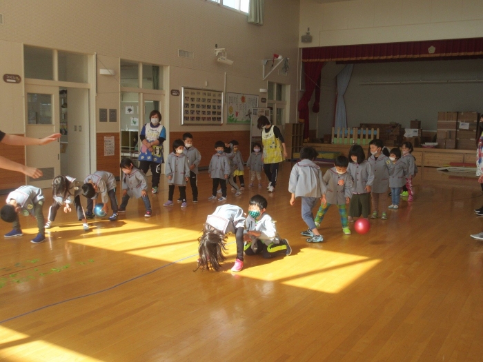 『らっきいタイム』は、ボール渡しゲーム。ボールを隣のお友達へ渡す、両手で上から渡す、両足の間から渡す等、二つチームに分かれて対戦。競争になると、慌ててしまう子供達でした。