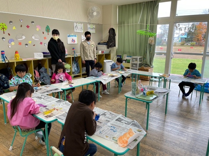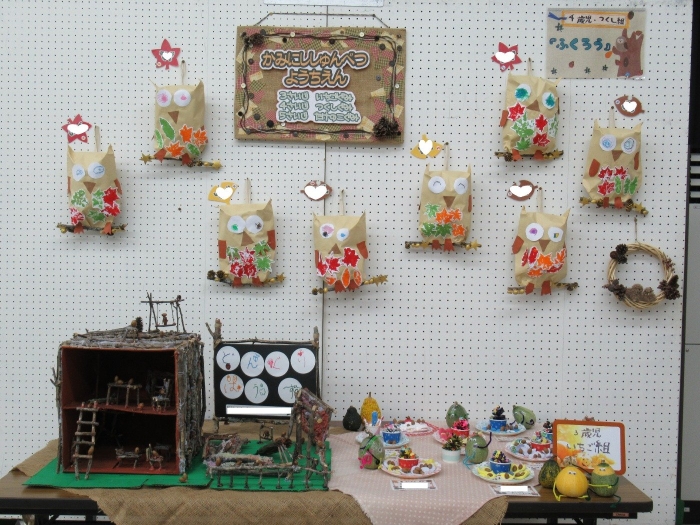 本日から、西春別地区の文化祭が西公民館で開催されています。幼稚園も、秋の自然物を利用した、各クラス個性あふれる作品を制作し展示しています。是非、お子さんと一緒に見に行ってみてくださいね。