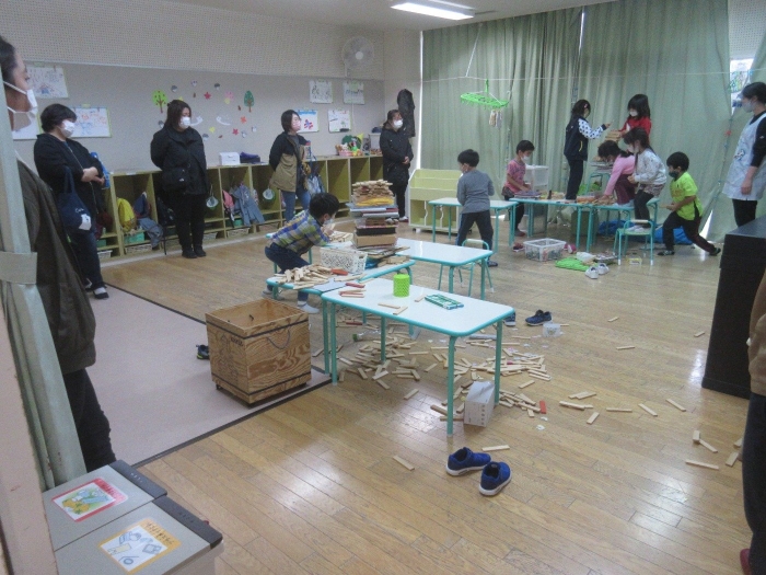 今日は、年長組対象のフリー参観日でした。一日を通して、給食時間帯以外の園での様子を自由に選択し、一時間程度見ていただきました。たけのこ組は、10月から始まった午後活動の時間帯を参観する保護者の方が多かったようです。午前中は、先生の説明を聞いて制作に取り組む様子を、午後活動は、お友達と協力して遊ぶ様子を見ていただきました。