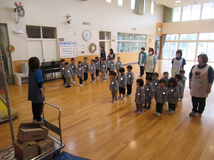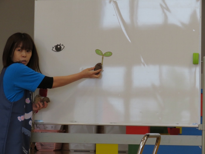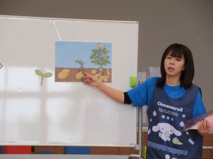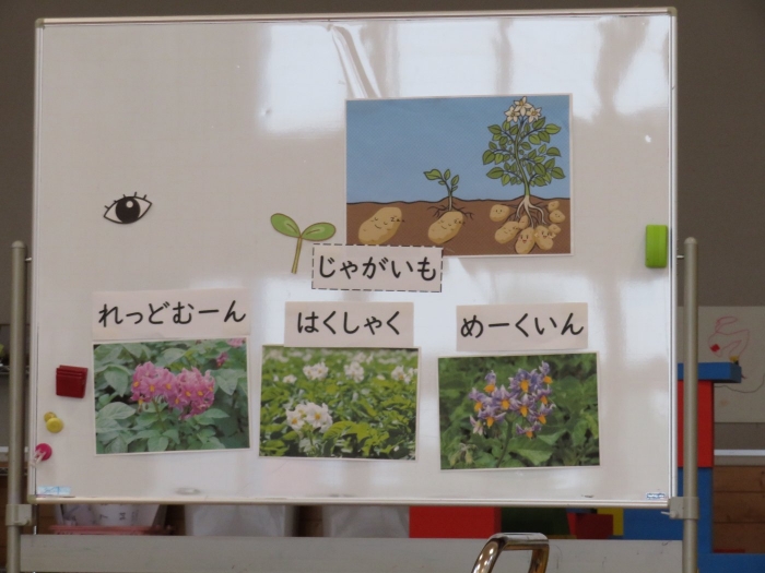今日のおはよう朝会は、『じゃが芋』についてのお話でした。今年、幼稚園で植えるじゃが芋は3種類。種芋には芽があることや、種類によって色の違う花が咲くこと等を教えてもらいました。先週行う予定だった芋植え、雨降りの日が多く延期になっていますが、今週中にはみんなで植えたいと思います。