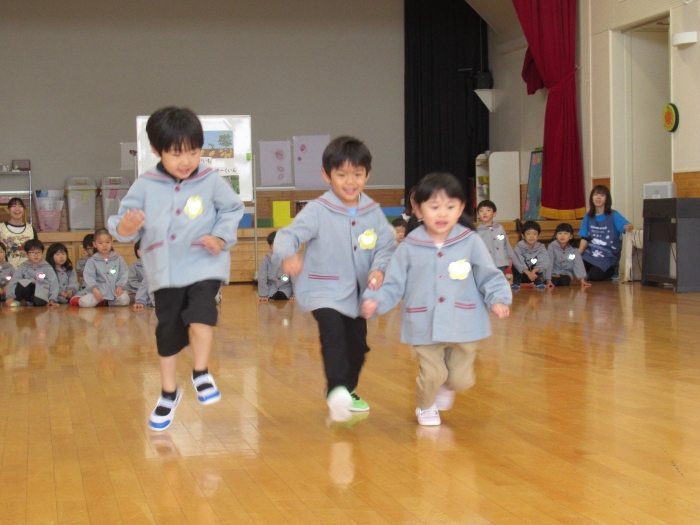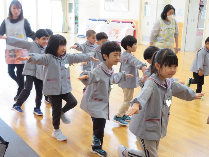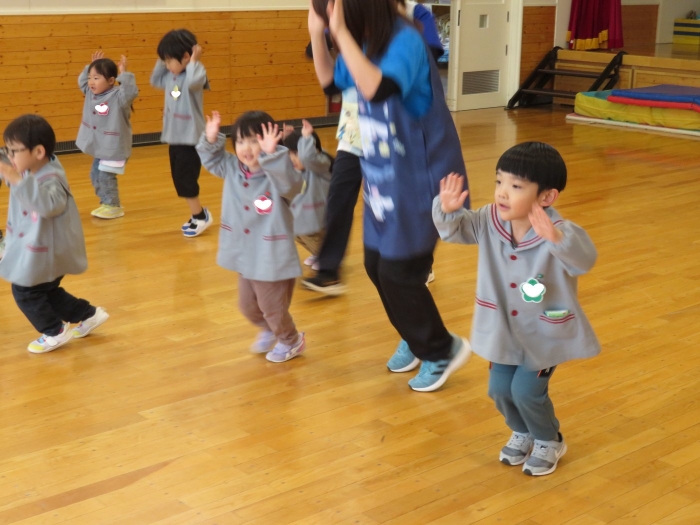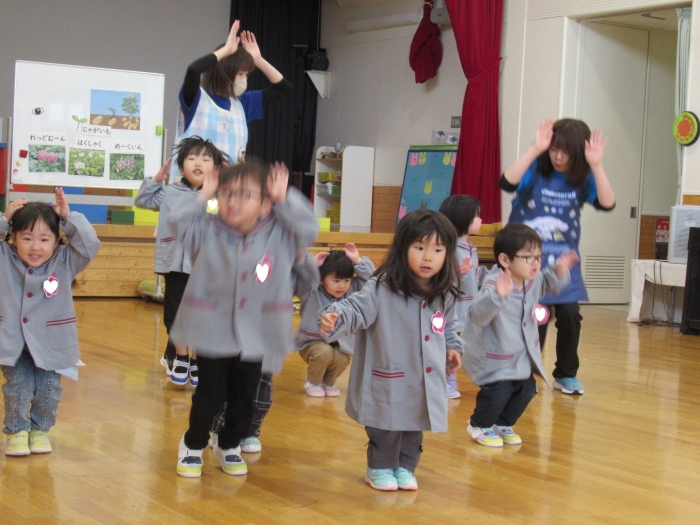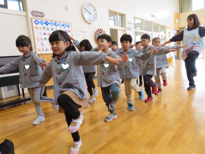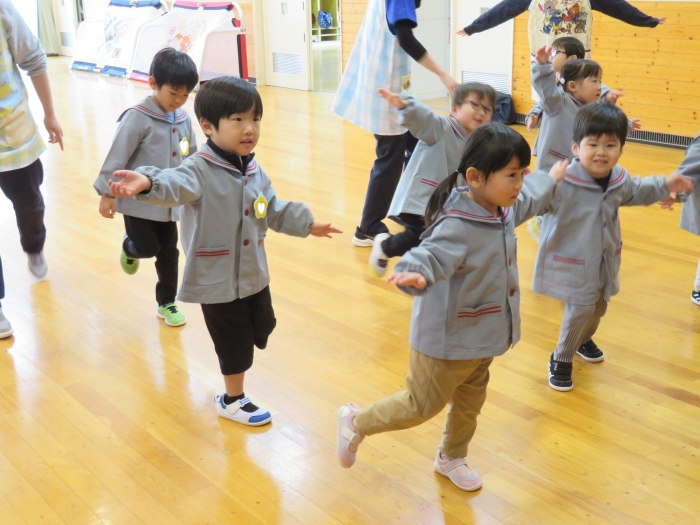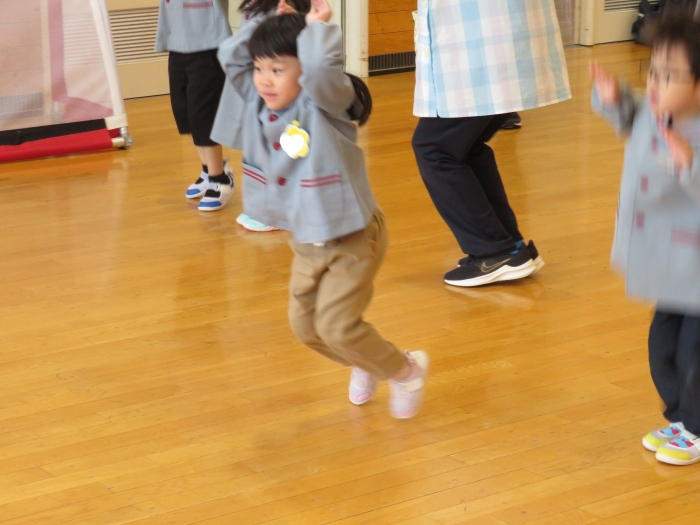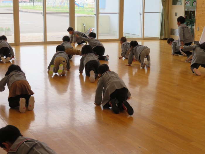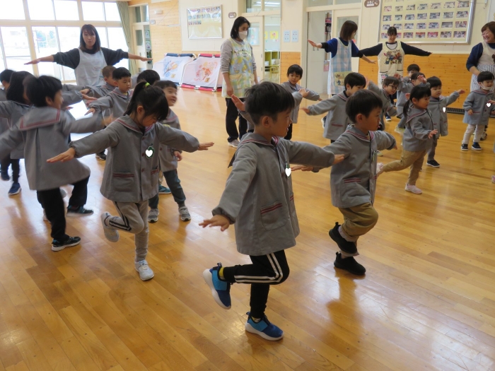 今日から、朝会後の『げんきっ子タイム』が始まりました。げんきっ子タイムは、全園児で体を動かすことを楽しむ時間です。様々な動きを楽しんだり、ちょっと難しい動きにも挑戦したりしながら、体作りを行っていきます。今日のお題は、『片足立ち』『スキップ』『ウサギ』『犬』の4つ。是非、ご家庭でもお子さんと一緒に行ってみてくださいね。