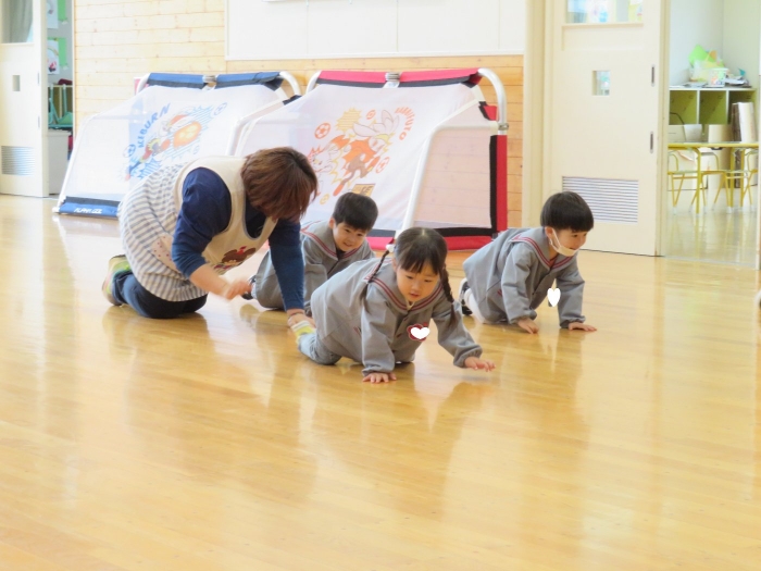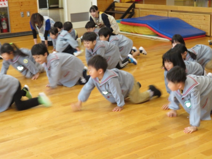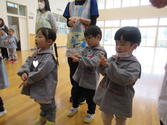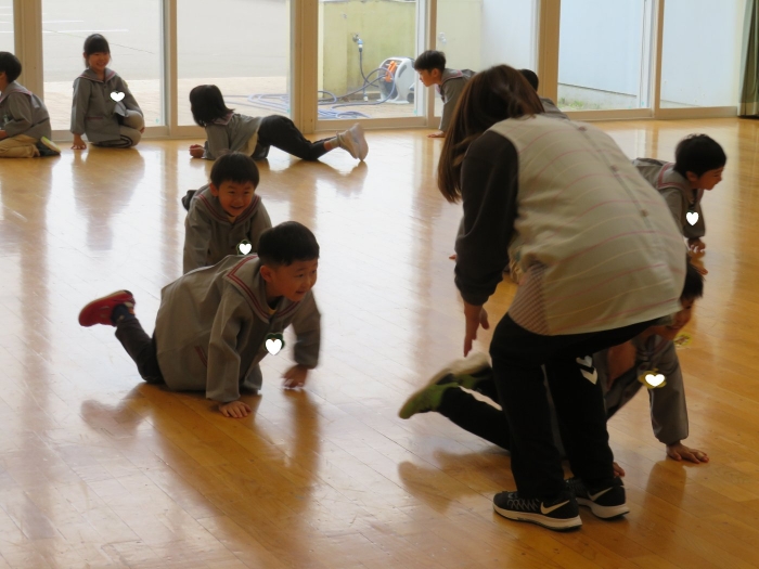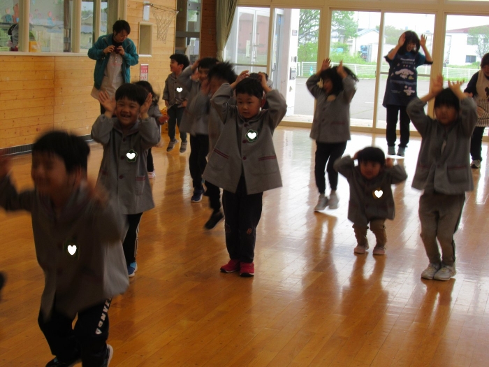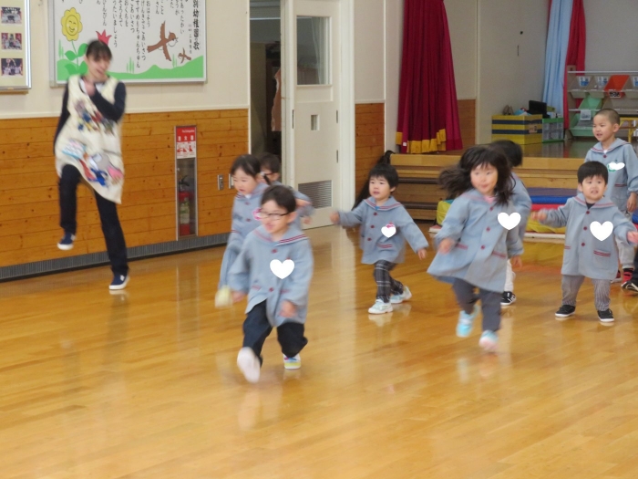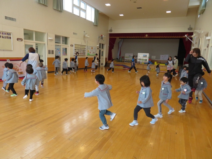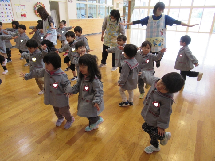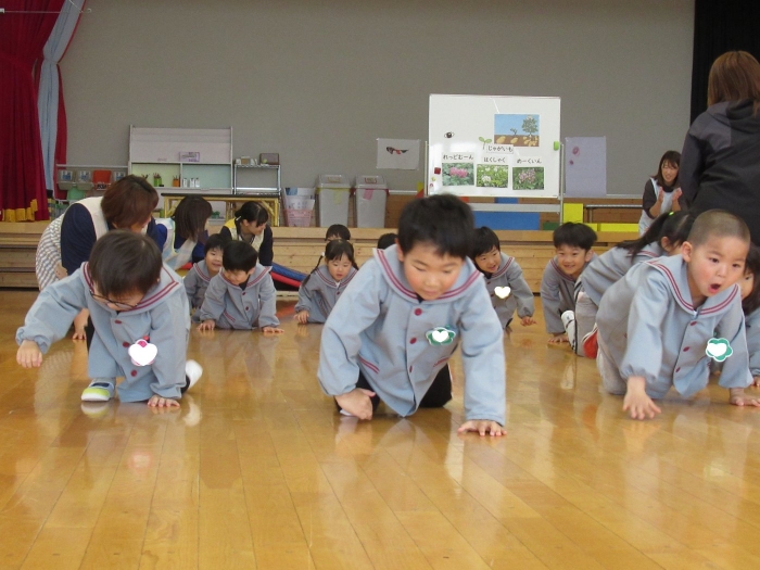 今日から、朝会後の『げんきっ子タイム』が始まりました。げんきっ子タイムは、全園児で体を動かすことを楽しむ時間です。様々な動きを楽しんだり、ちょっと難しい動きにも挑戦したりしながら、体作りを行っていきます。今日のお題は、『片足立ち』『スキップ』『ウサギ』『犬』の4つ。是非、ご家庭でもお子さんと一緒に行ってみてくださいね。