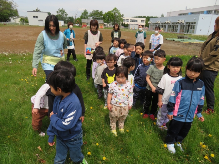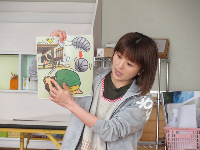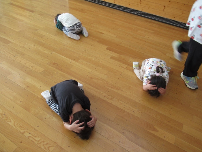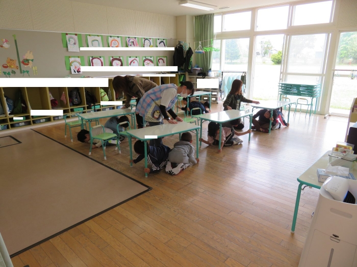 今日は、第一回目の避難訓練を行いました。一回目は、地震を想定しての訓練です。はじめに、地震が起きた時の身の守り方、避難する時の『お・は・し・も・ち』の約束などについてのお話を聞き、その後各クラスで朝の会をしている時間帯に、非常ベルを鳴らして訓練を行いました。
