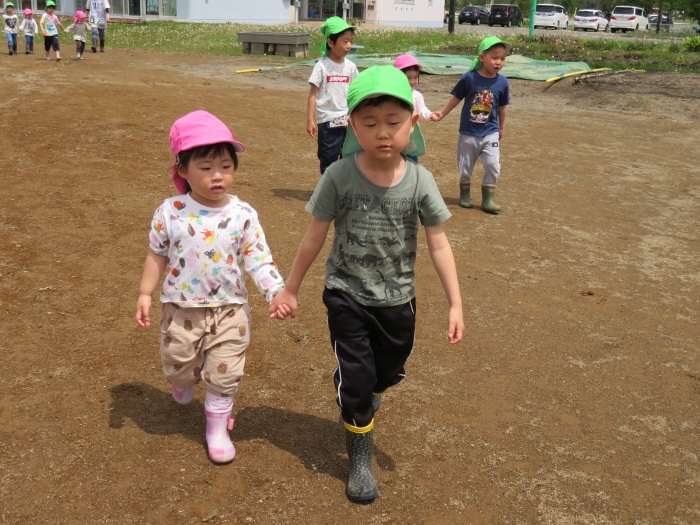 たけのこさん、いちごさんと手を繋いで