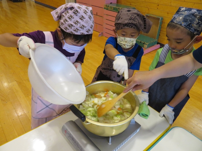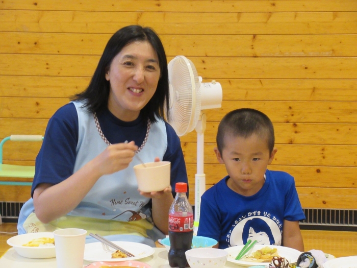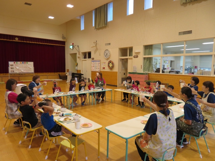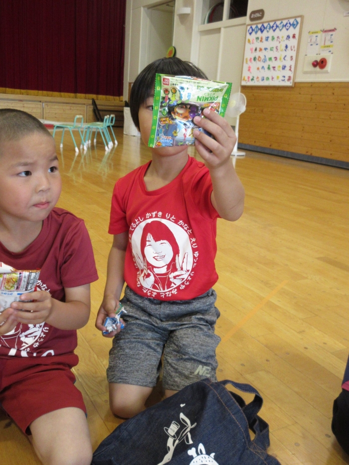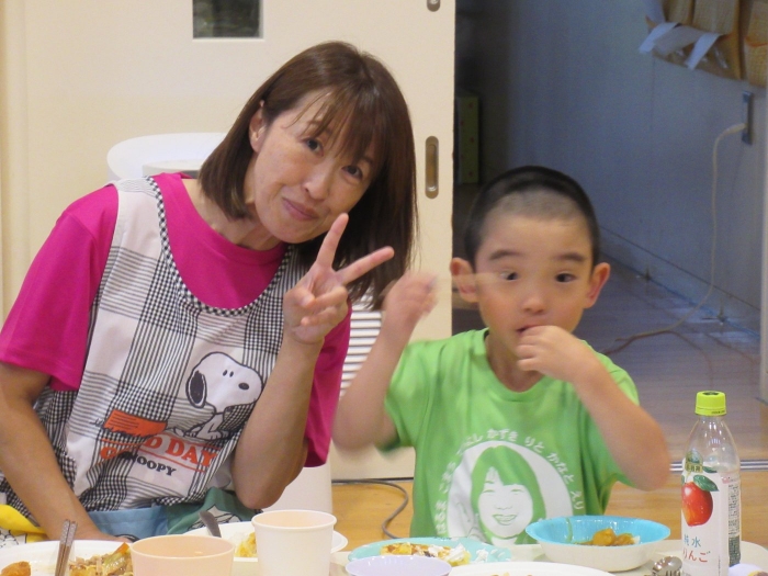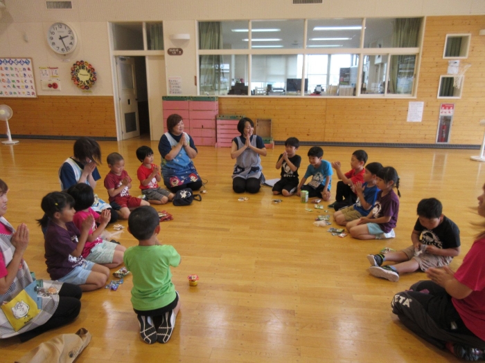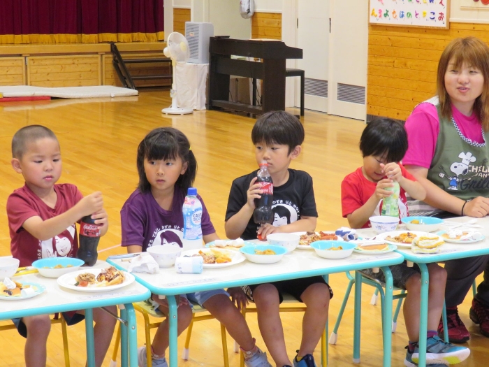 買い物から帰ってきた後は、おやつタイム。自分で選んで買ったおやつをみんなで輪になりいただきました。おやつタイムの後はクッキング。
