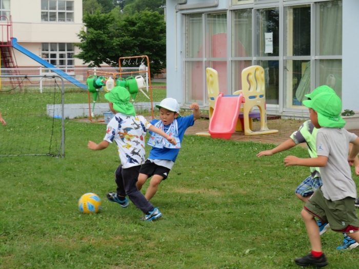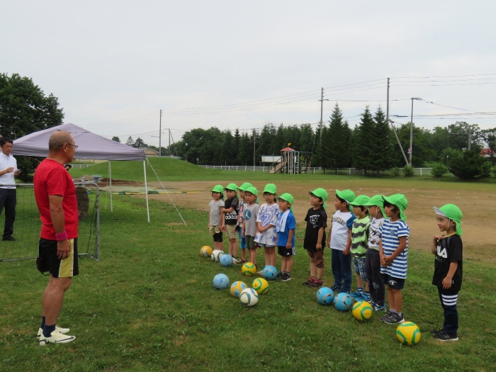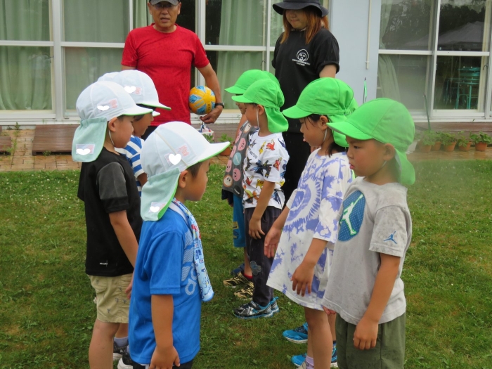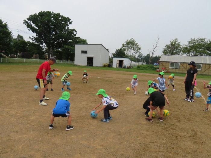 今日は、たけのこ組のサッカー教室がありました。3回目の教室になり、ボールの扱い方が上達してきましたよ。Y先生の指導は、毎回子ども達のやる気が高まるような声掛けや進め方で、子ども達は終始楽しそうに取り組んでいました。気温が上がることを予想し、時間を短縮して行うことを考えていましたが、ときどき小雨が降り、ほどよい風も吹いており、予定通りに行うことができました。