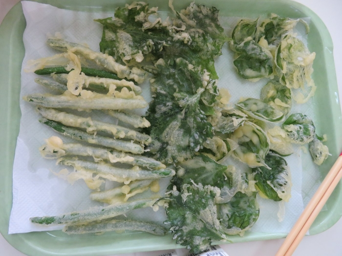 いちごさん収穫のバジル、たけのこさん収穫のインゲン・ズッキーニ・シソを天ぷらにして試食