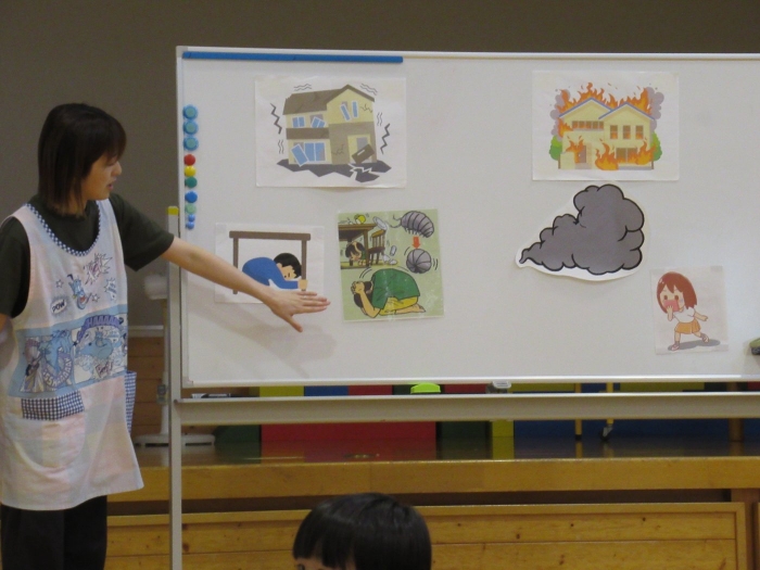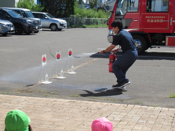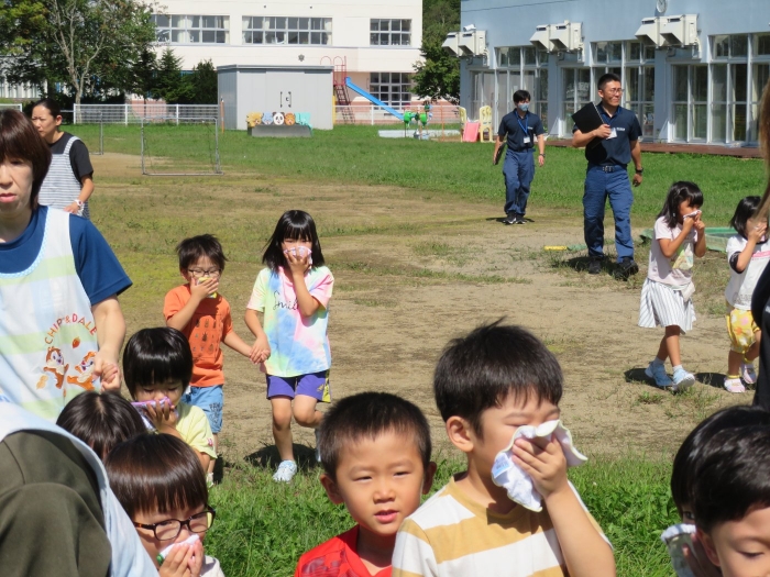 今日は、第3回目の避難訓練でした。3回目は、地震発生後、ボイラー室からの出火を想定して行いました。今日は、別海消防署の消防士さんが訓練の様子を見学していたため、緊張感が増したようで今まで以上に真剣に取り組む姿が見られていました。訓練終了後、消防士さんから「先生方の指示も的確で、子ども達が真剣に訓練に参加していて良かったと思います。」と、お褒めの言葉をいただきました。また、「炎も怖いけれど、煙の方がもっと怖いんだよ。煙を少し吸っただけで倒れしまうんだよ。」と、煙の恐ろしさを教えてくださいました。実際に、煙がどんどん広がっていく様子を見たことで、そのことを実感できた様子でした。