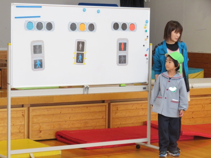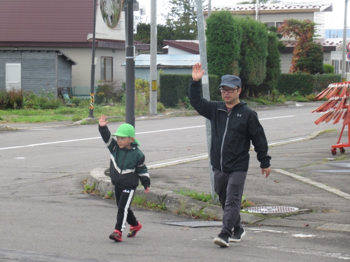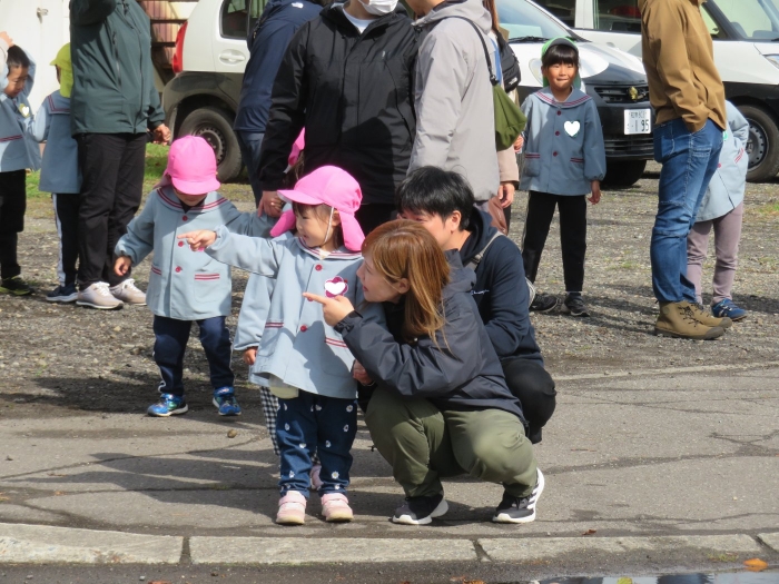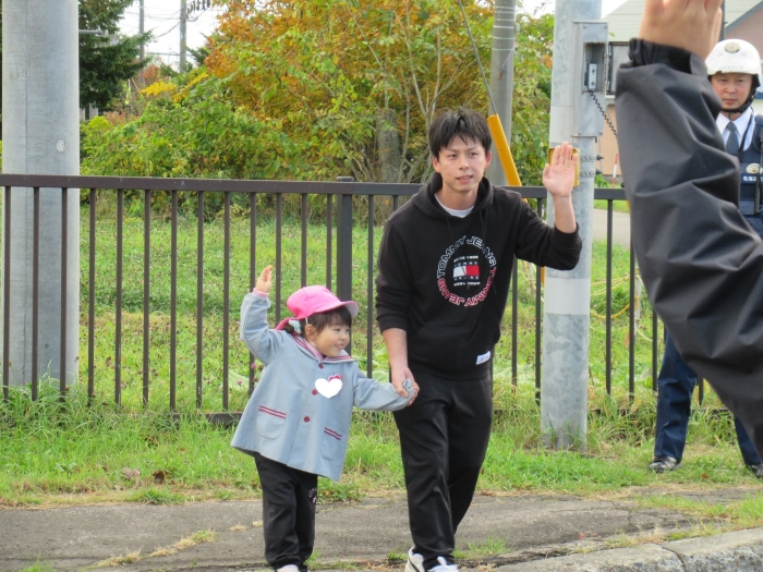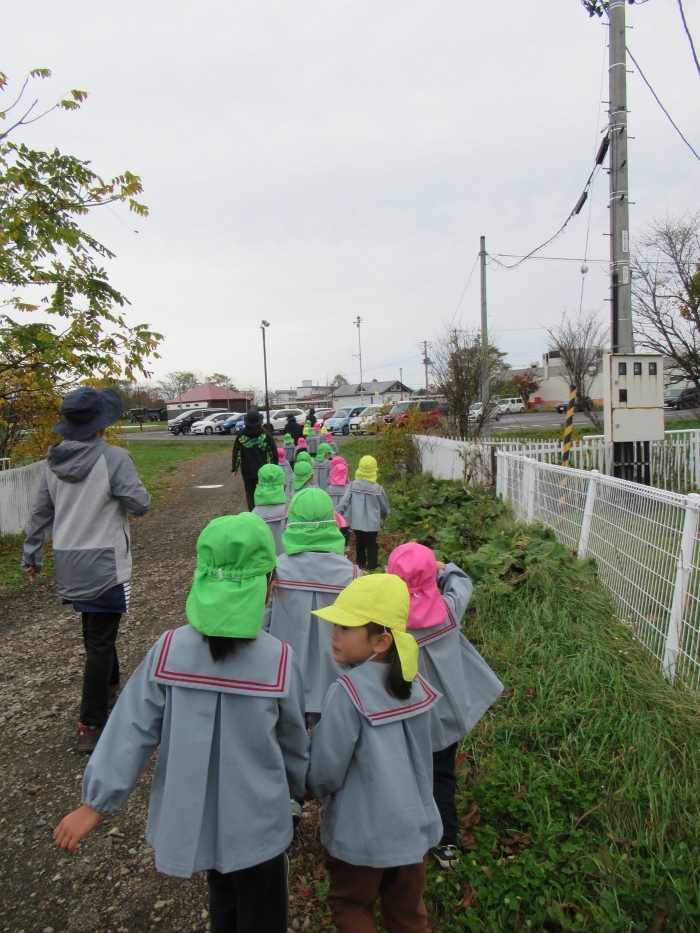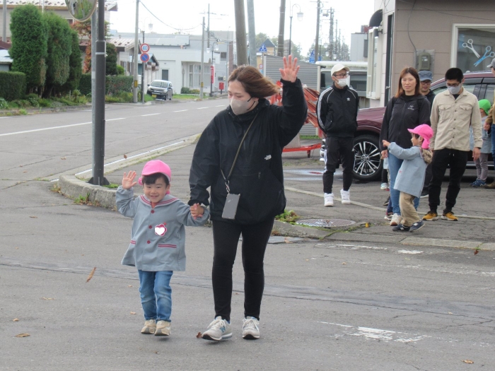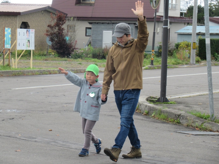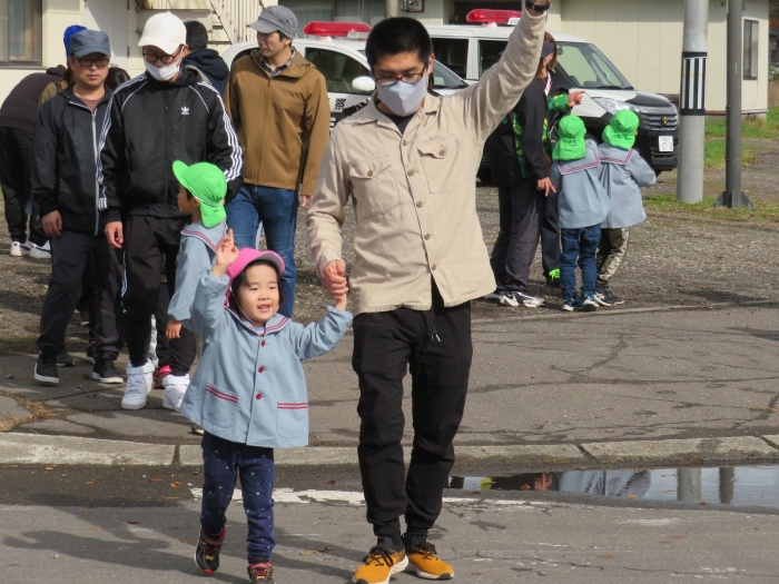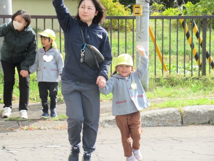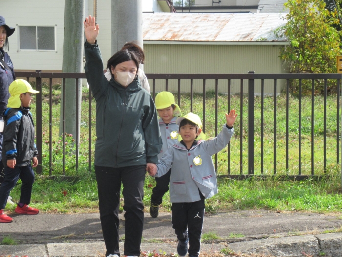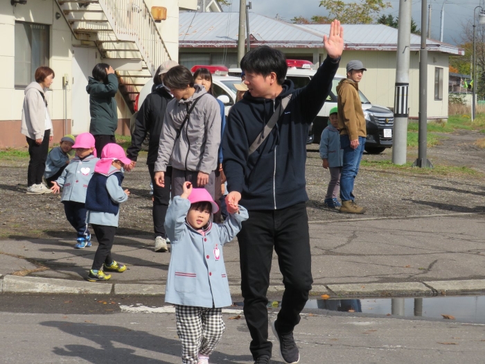 今日は、第2回交通安全教室でした。2回目は、実際にパークホテル前の交差点で信号機の見方や横断歩道の渡り方の練習を行いました。パークホテル前の交差点は日頃から交通量も多いため、危険のないよう保護者の方にも参加をしていただき実施しました。たけのこさんは、就学に向けて一人ずつ渡る練習も行いました。冬になる前に、親子で徒歩通園をしながら練習してみるのも良いですね。つくしさん・いちごさんは、ご家族でお出掛けの際に今日の練習を意識してみてください。参加してくださいまし保護者の皆さん、お忙しい中ありがとうございました。