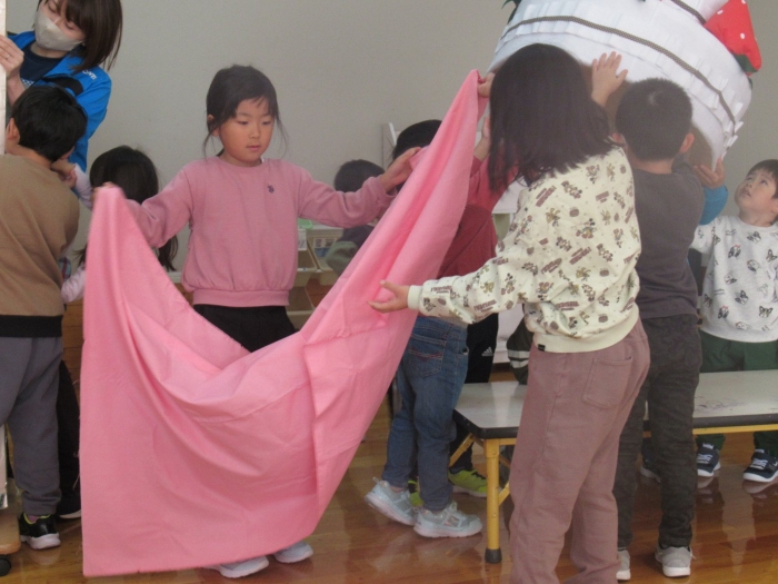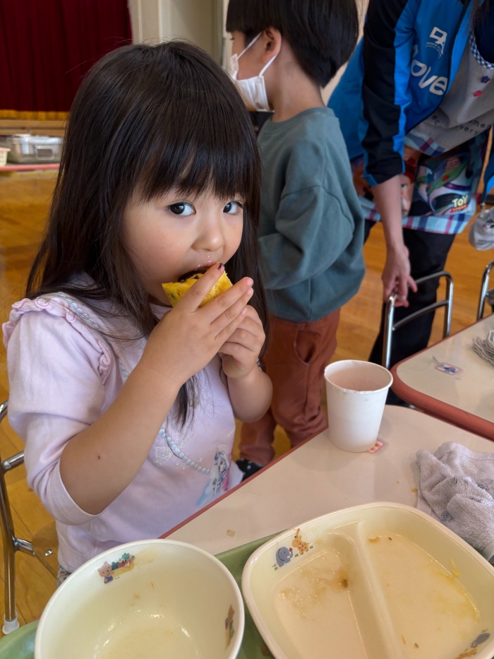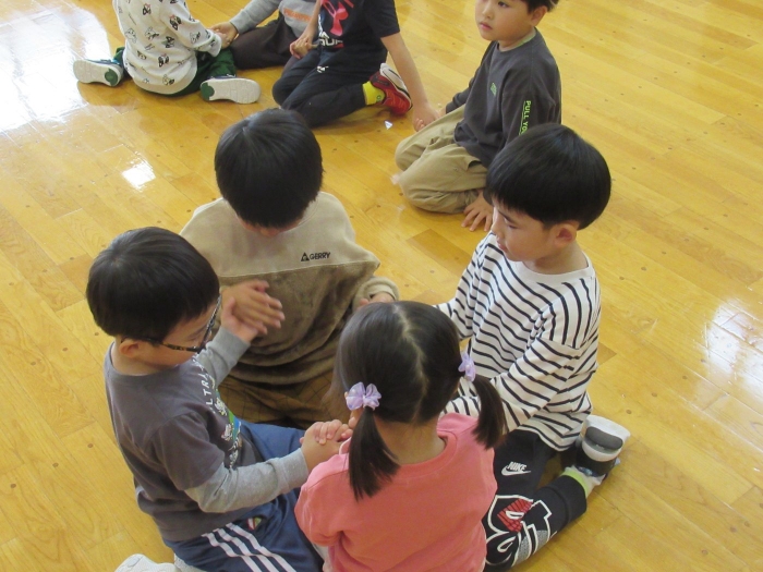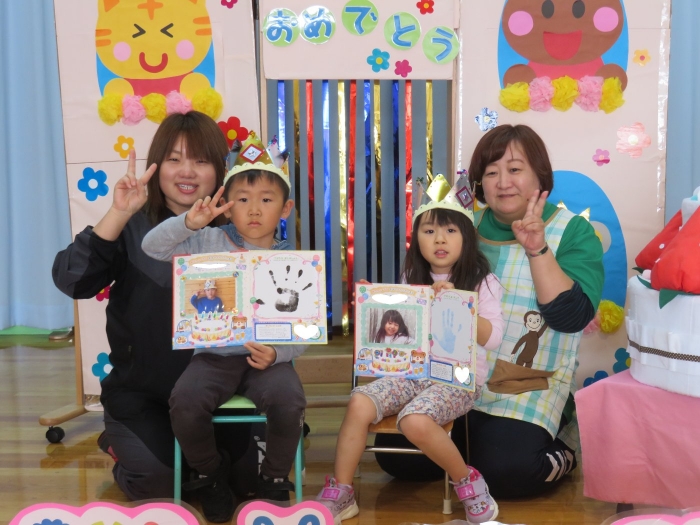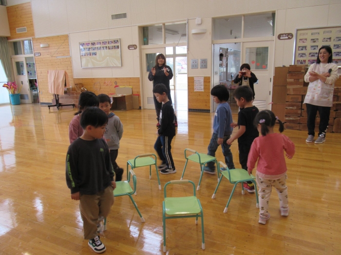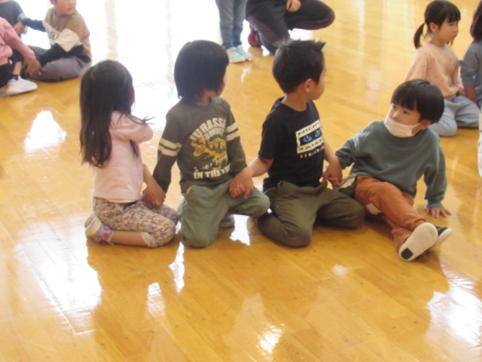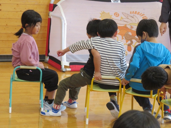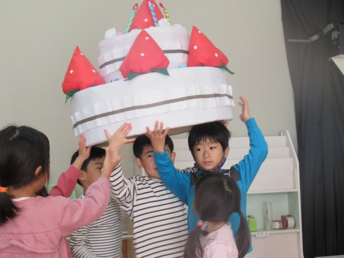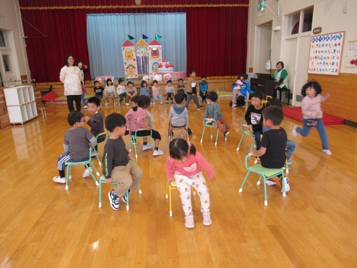 今日は11月のお誕生会、たけのこさん1名、いちごさん1名のお祝いでした。ステージ上で落ち着いて座り参加しているたけのこ組のY君、初めての誕生会でウキウキ嬉しさが止まらないいちご組のNちゃんの姿が印象的でした。今日のお楽しみは二つ。椅子取りゲームでは、座ることができず悔し涙を流すお友達もいましたが、それも大切な経験ですね。「次は頑張るぞ~」という気持ちを持って、また楽しんでほしいと思います。