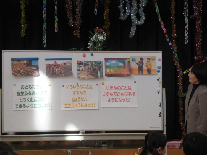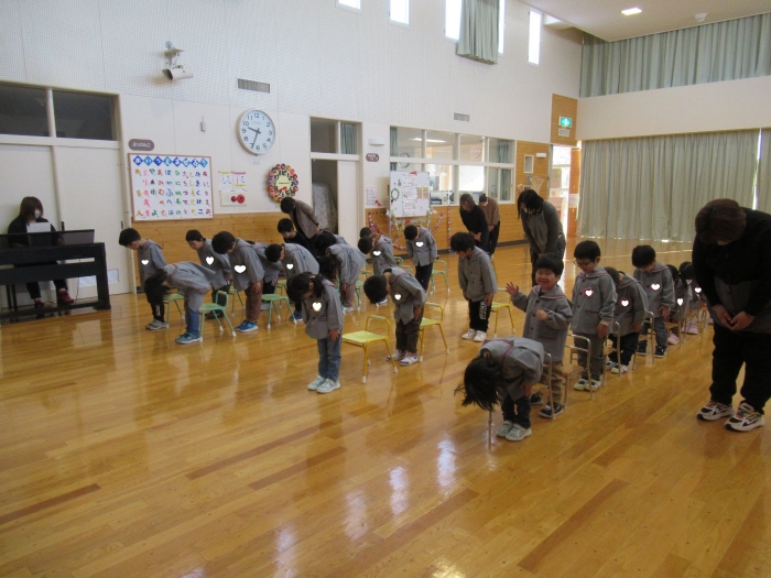今日は終業式、83日間の2学期が終了しました。2学期は、バス遠足や神社祭典、ゆめの会など様々な行事があり、その一つ一つを経験する中で成長が感じられました。また、日々の戸外遊びを通して体力面でもとても逞しくなりました。明日から19日間の冬休みが始まります。冬休み中も幼稚園との約束や規則正しい生活を心掛けながら、ご家族で有意義な時間をお過ごしください。保護者の皆様には、様々な活動に際してのご協力ありがとうございました。3学期も、どうぞよろしくお願いいたします。