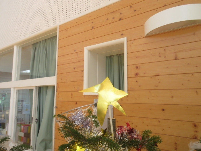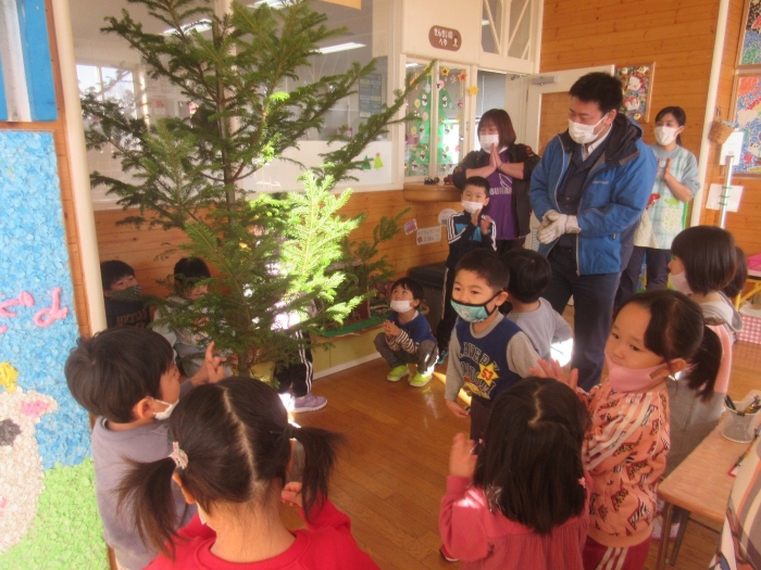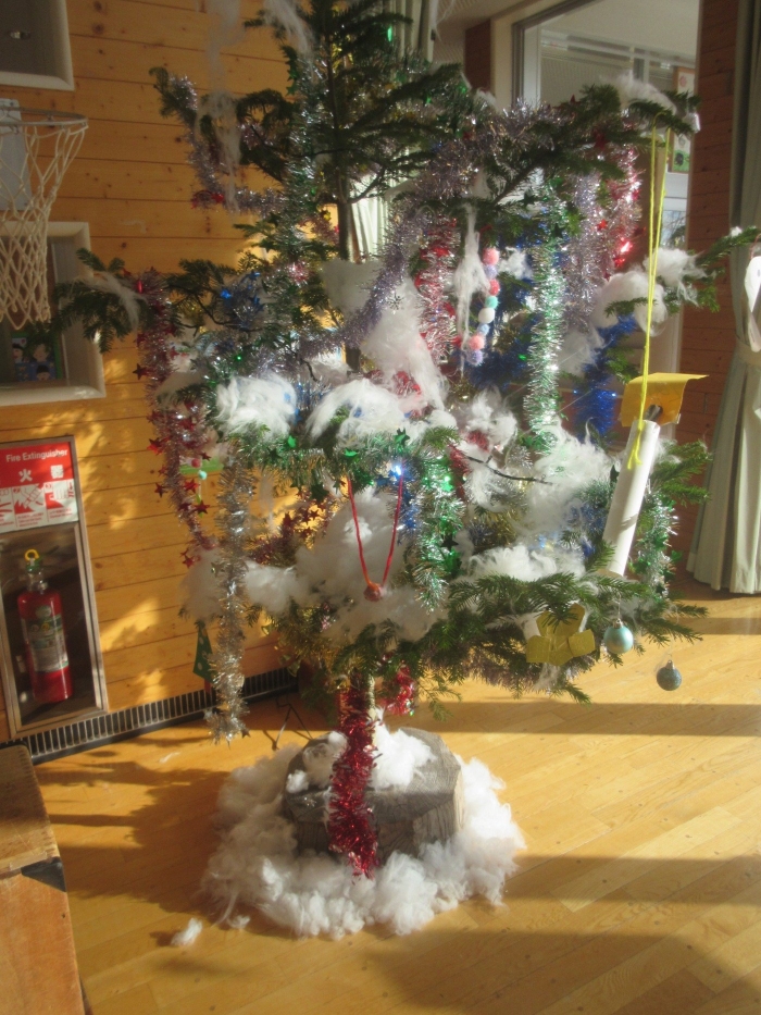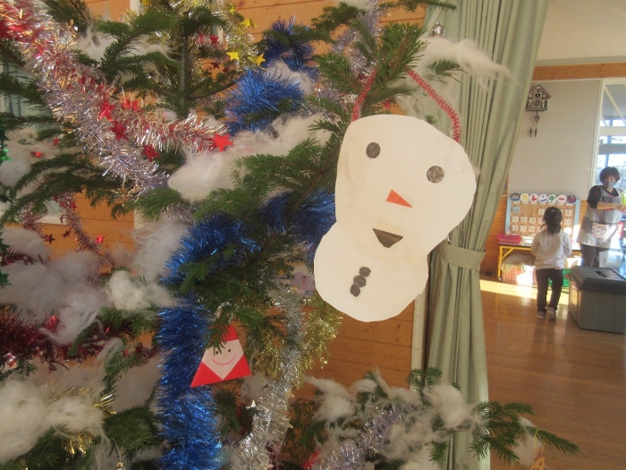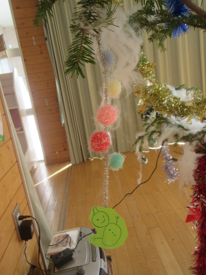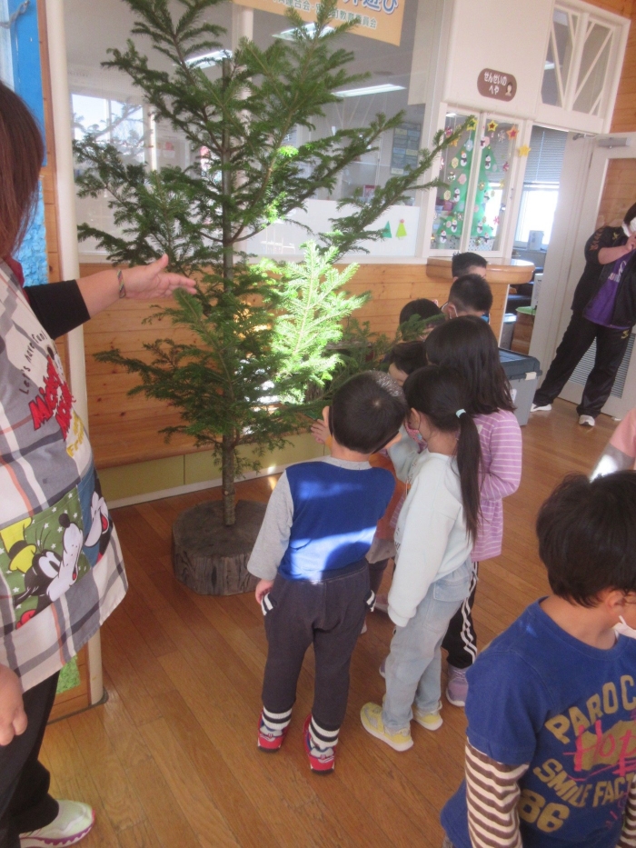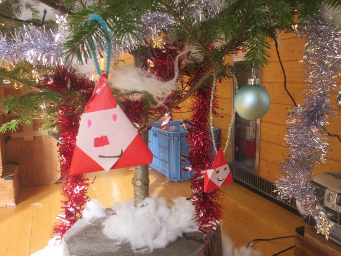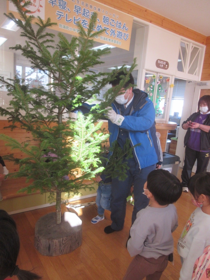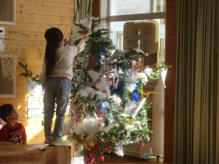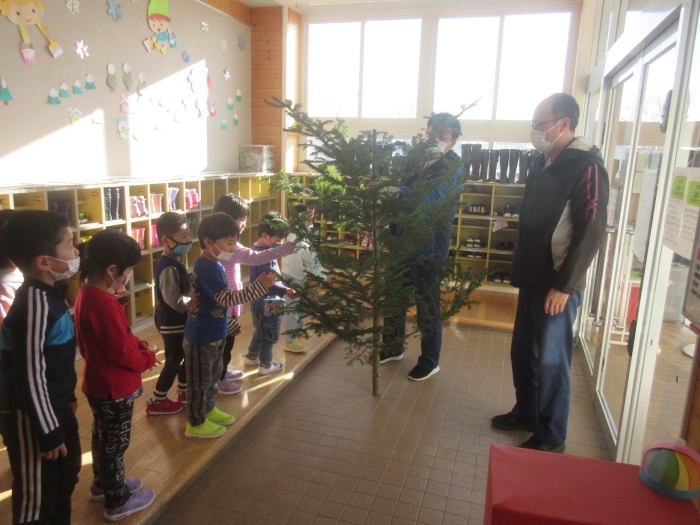 昨日、北海道森林組合の方から、大きなクリスマスツリーをいただきました。この木は、毎年間伐した物を幼稚園や保育園などに届けてくださり再利用をしています。今日は早速、「飾りをつけよう!」とキラキラモールを飾ったり、飾りを作ったりしました。