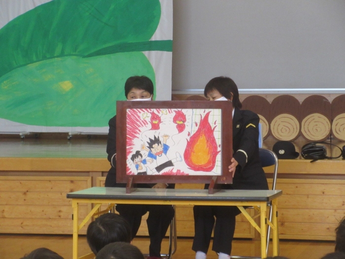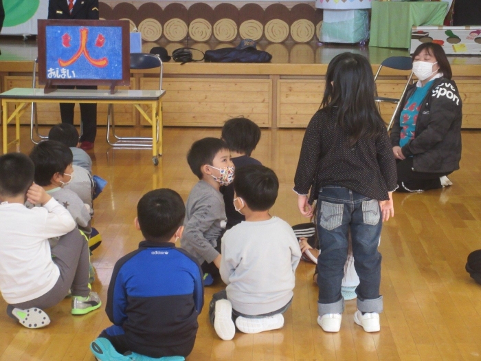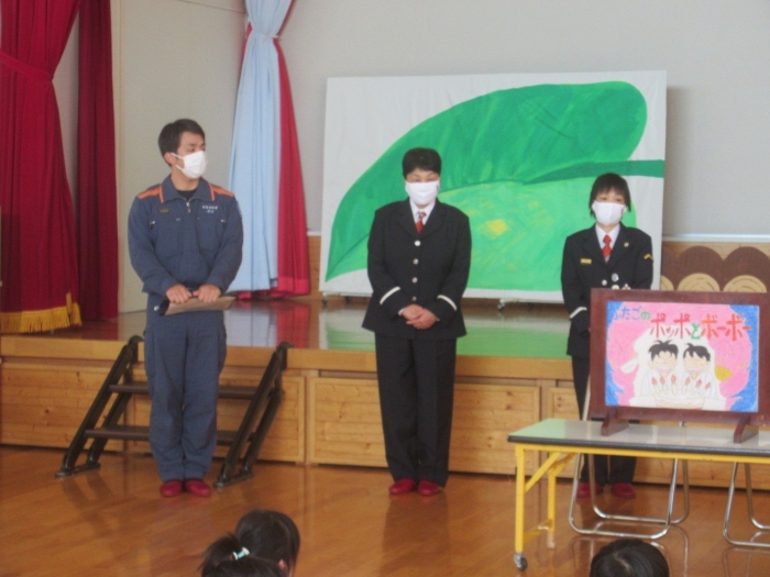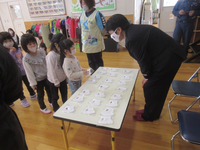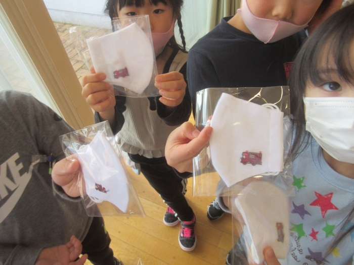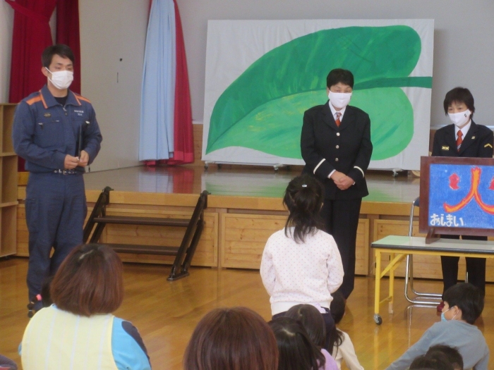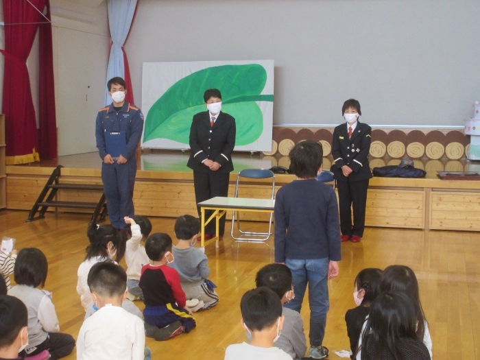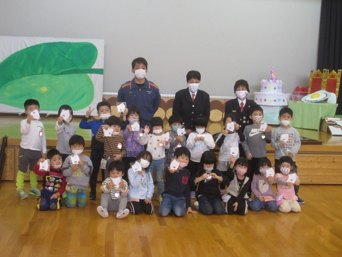 今日は、別海町女性消防団の方が来園し、火の扱い方や怖さについて大きな紙芝居を通して教えてくださいました。『子供だけで火を使わないこと』『ストーブの周りでは遊んだり走り回ったりしないこと』ということを約束しました。また、「ストーブの近くには洗濯物を干さないようにお母さんにも伝えてくださいね。」というお話もありました。最後に、女性消防団の皆さんお手製のマスクをいただきました。なんと、消防車や救急車のアップリケが付いていました。このマスクは、アベノマスクを解体して作り直してくださったそうですよ。消防団の皆さん、ありがとうございました。