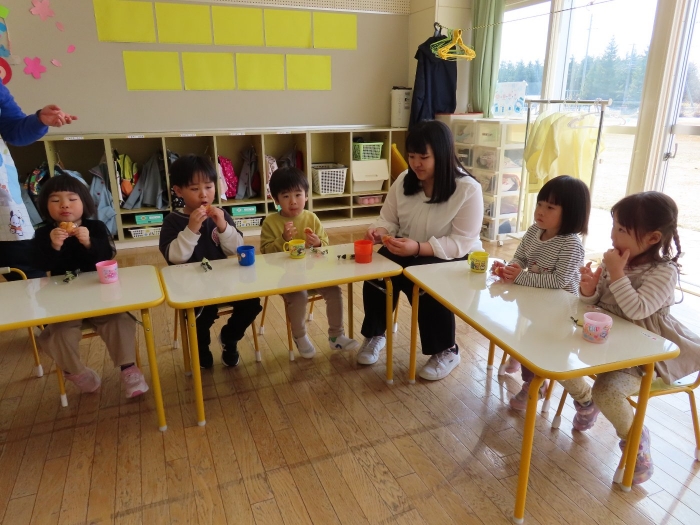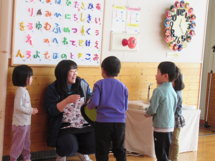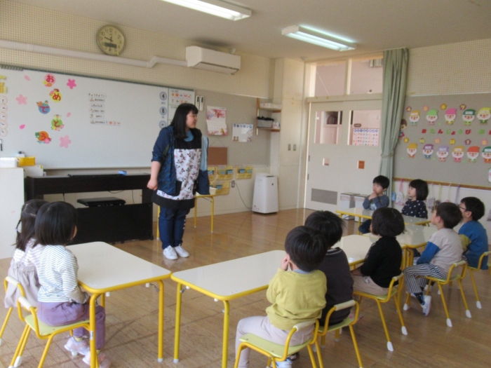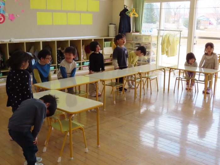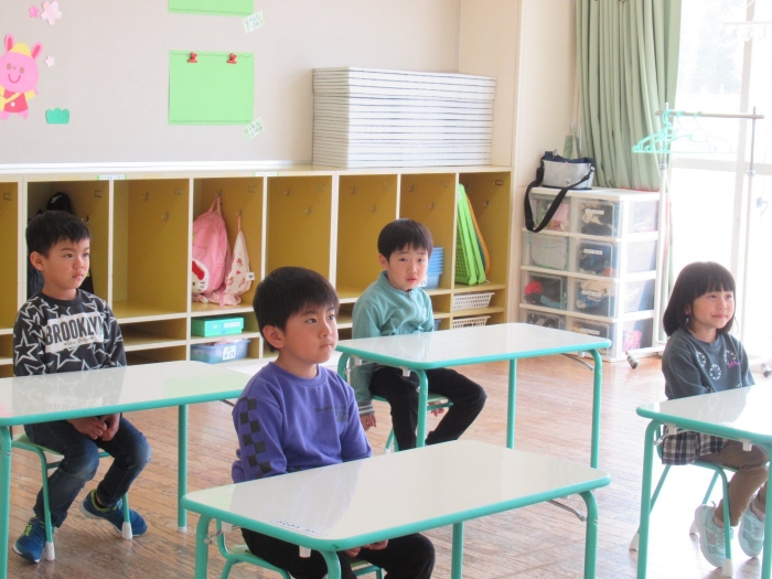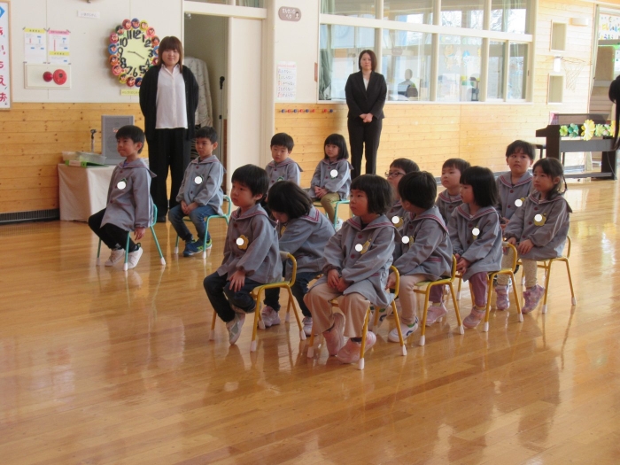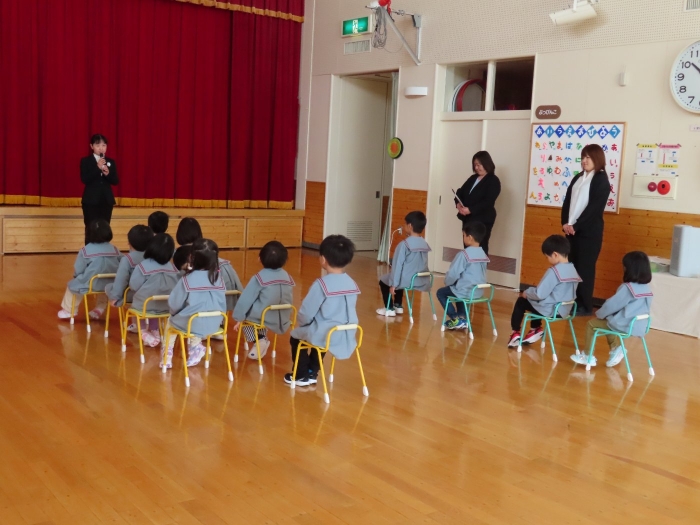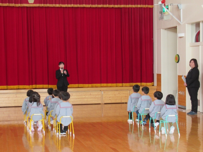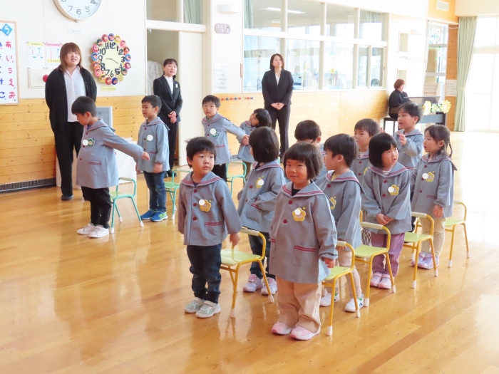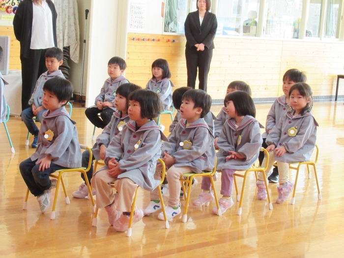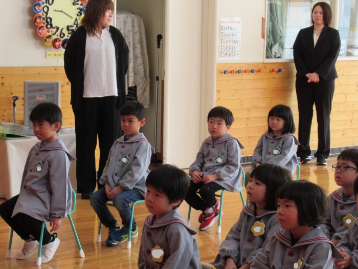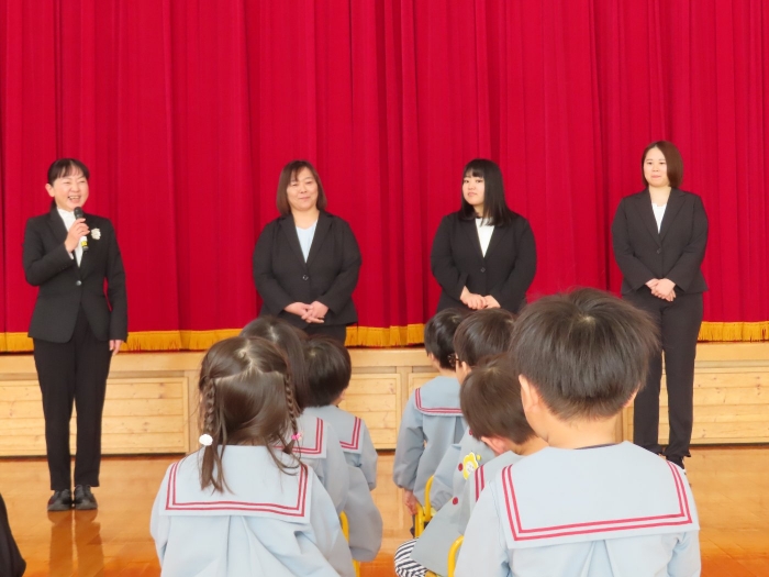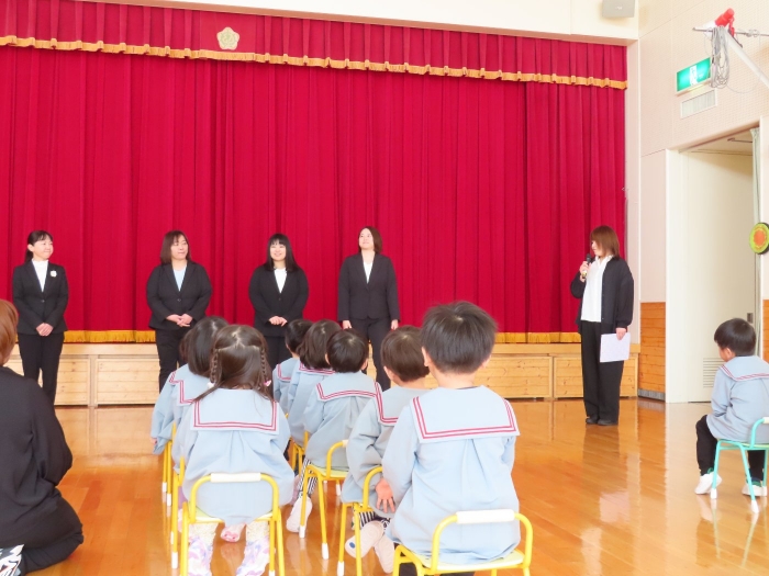 今年度は4名の職員が中西別幼稚園から異動してきました。一昨年・昨年度の交流で何度か顔を合わせていたこともあり、着任式では「何か見たことがある…」と覚えている様子の子もいました。自己紹介後、一生懸命名前を覚えようとしてくれたり、「いい名前だね~」とお褒めの言葉を掛けてくれたりと、新しく来た先生に興味津々の子ども達でした。進級への期待と不安が入り混じる時期ですが、1日でも早く、新しい環境に慣れ親しめるよう努めていきたいと思います。そして、明日は入園式! 8名の新しいお友達を元気いっぱい迎えたいと思います。