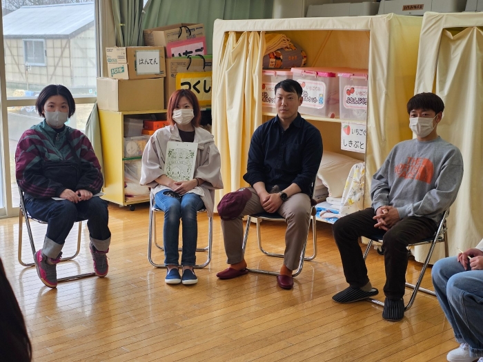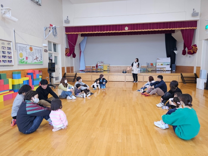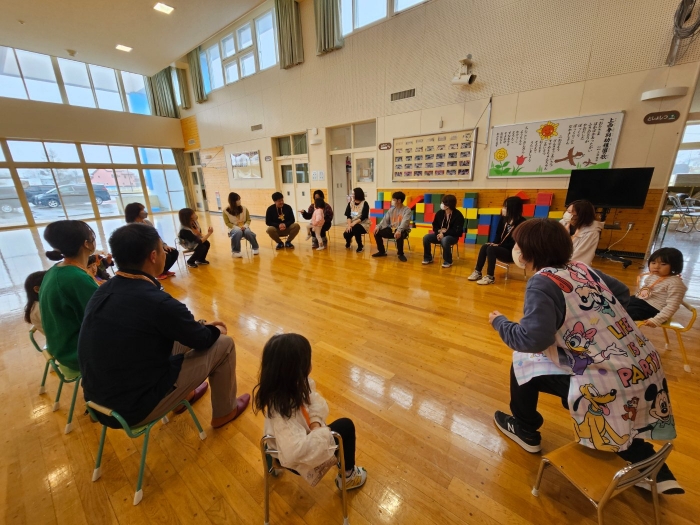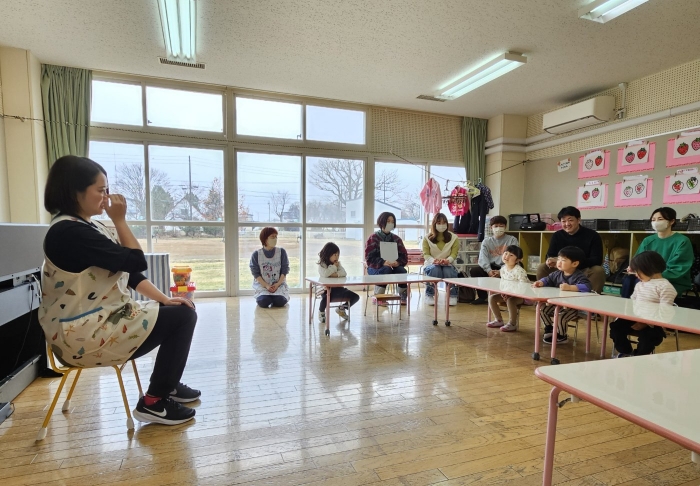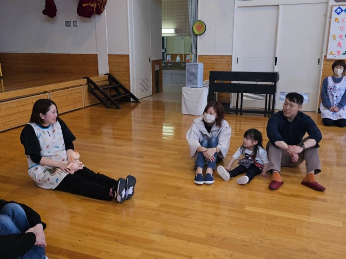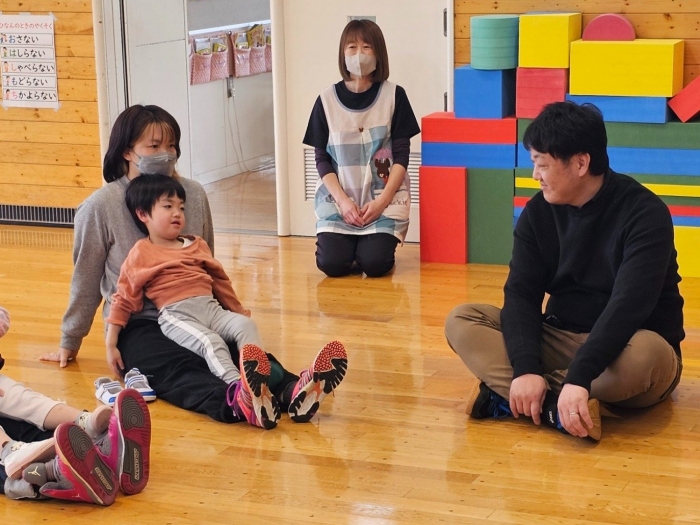 先生の話に耳を傾けるお父さん・お母さん・子ども達
