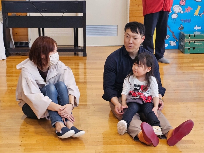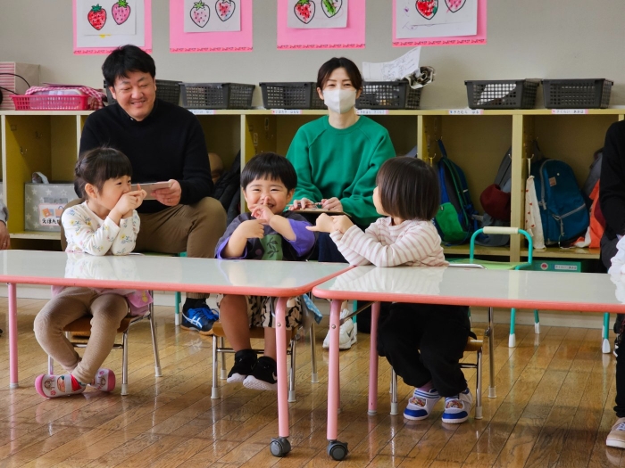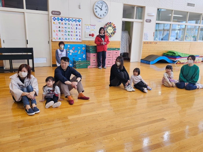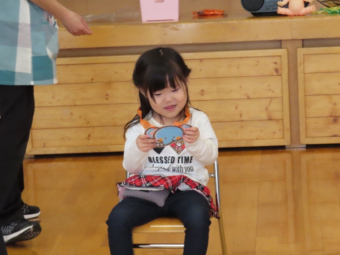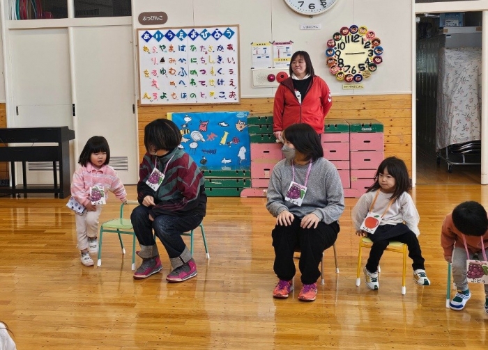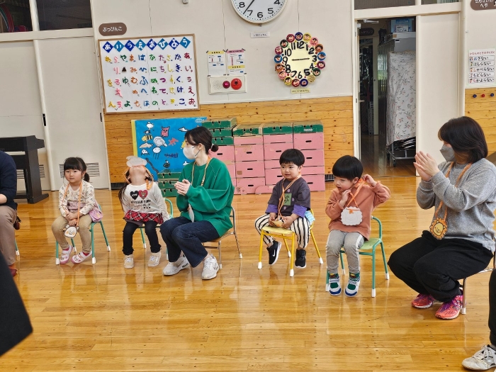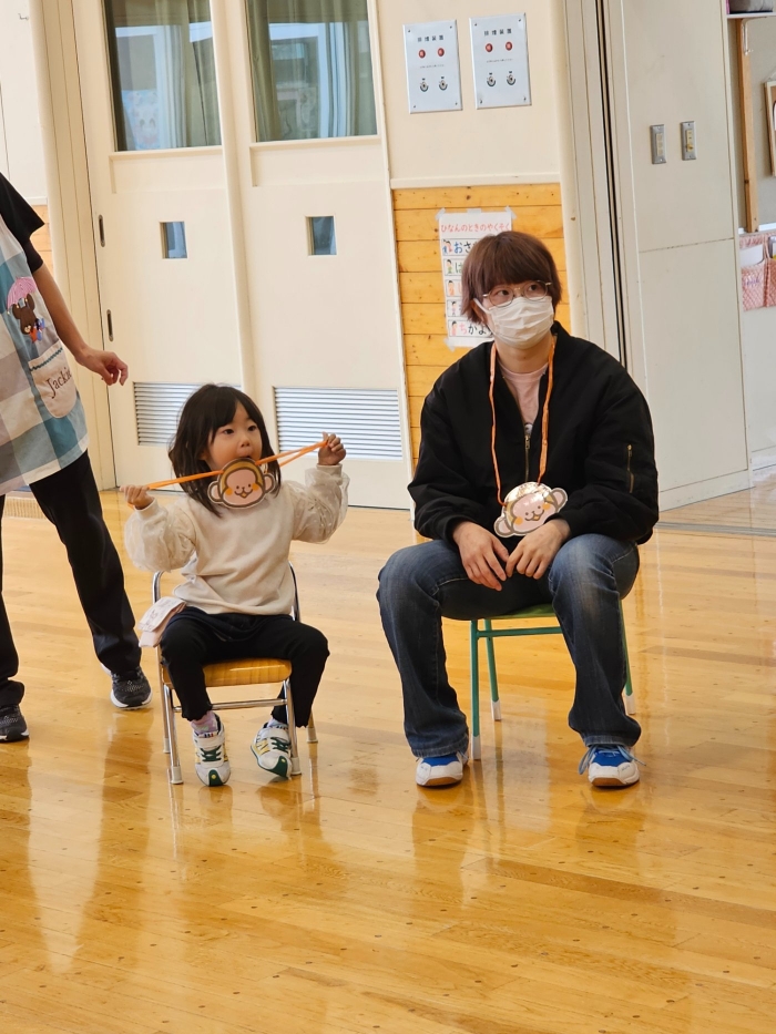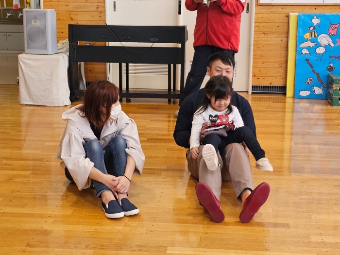 朝の会後は、親子で触れ合い遊び『バスにのって』、集団遊び『フルーツバスケット』『動物バスケット』を楽しみました。お父さん・お母さんがバス役・いちご組が運転手で、膝の上に乗ってユラユラ、急カーブ、急勾配…、盛りだくさんのスキンシップに幸せそうな子ども達でした。『フルーツバスケット』は、いちご組からのリクエスト! 全園児で親しんだことで、すっかりお気に入りになったようです。動物バージョンも加わり、お父さん・お母さんとも一緒に行ったことで楽しさが倍増⤴ 『フルーツor動物バスケット』ブームが続きそうですね。
